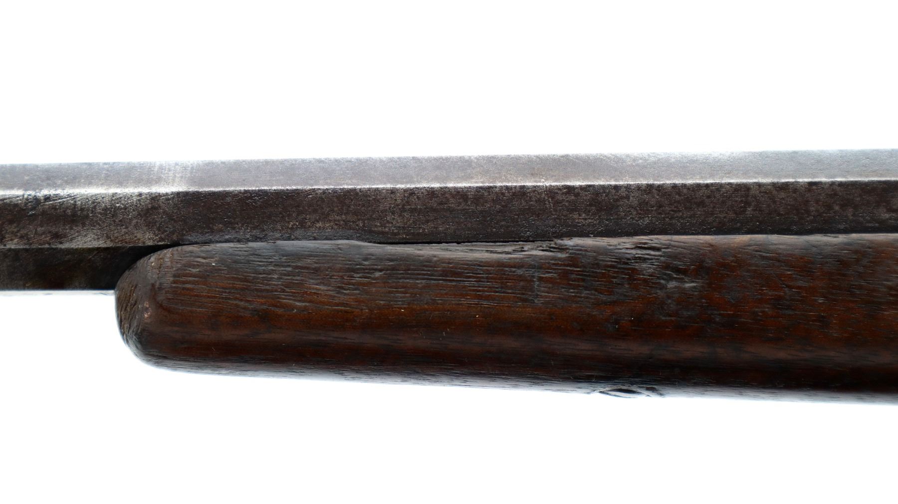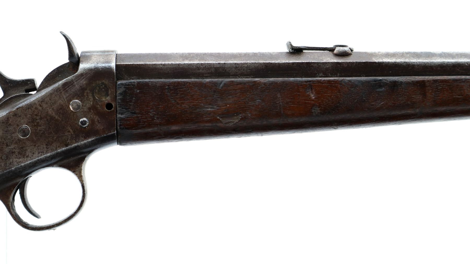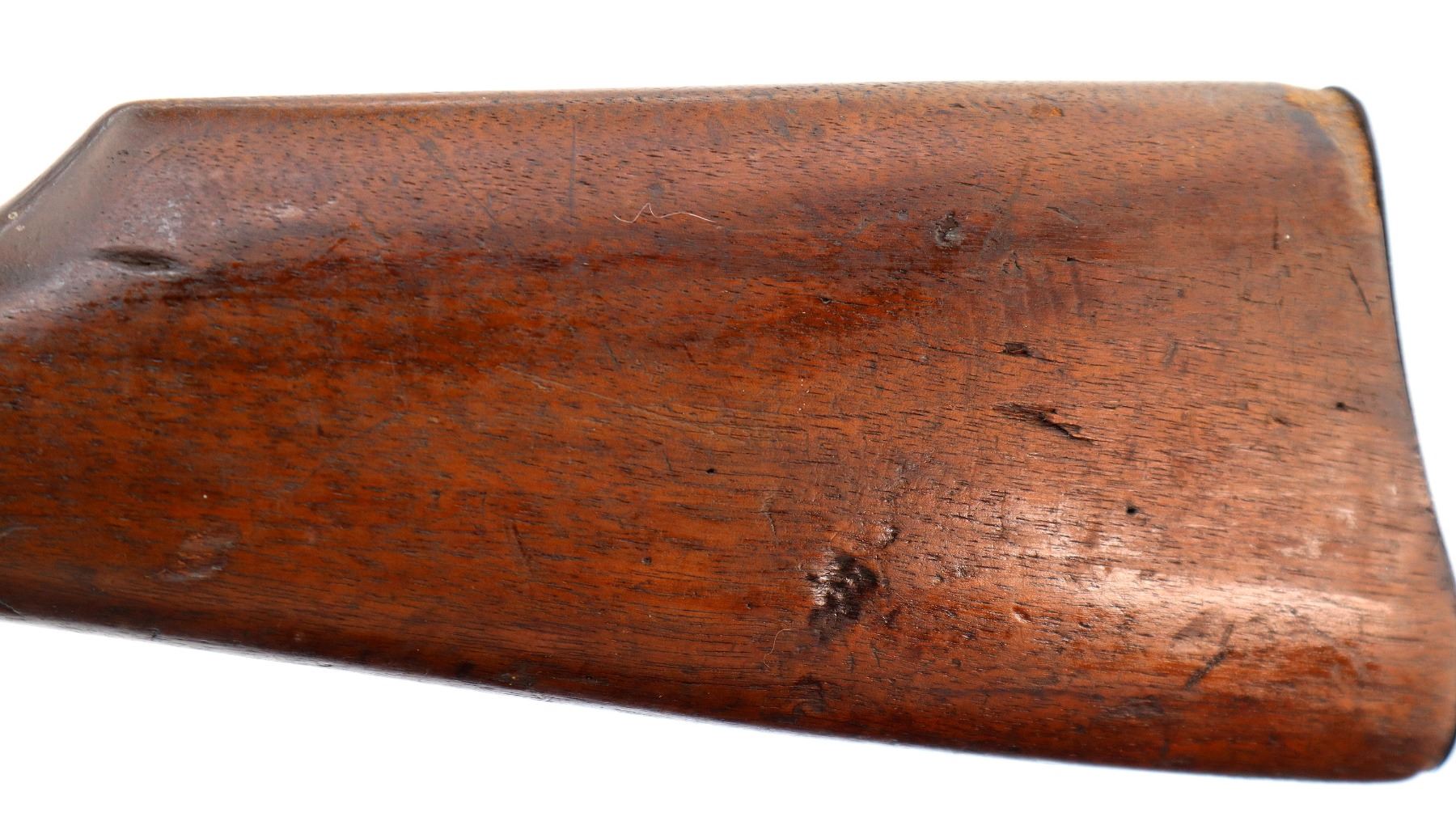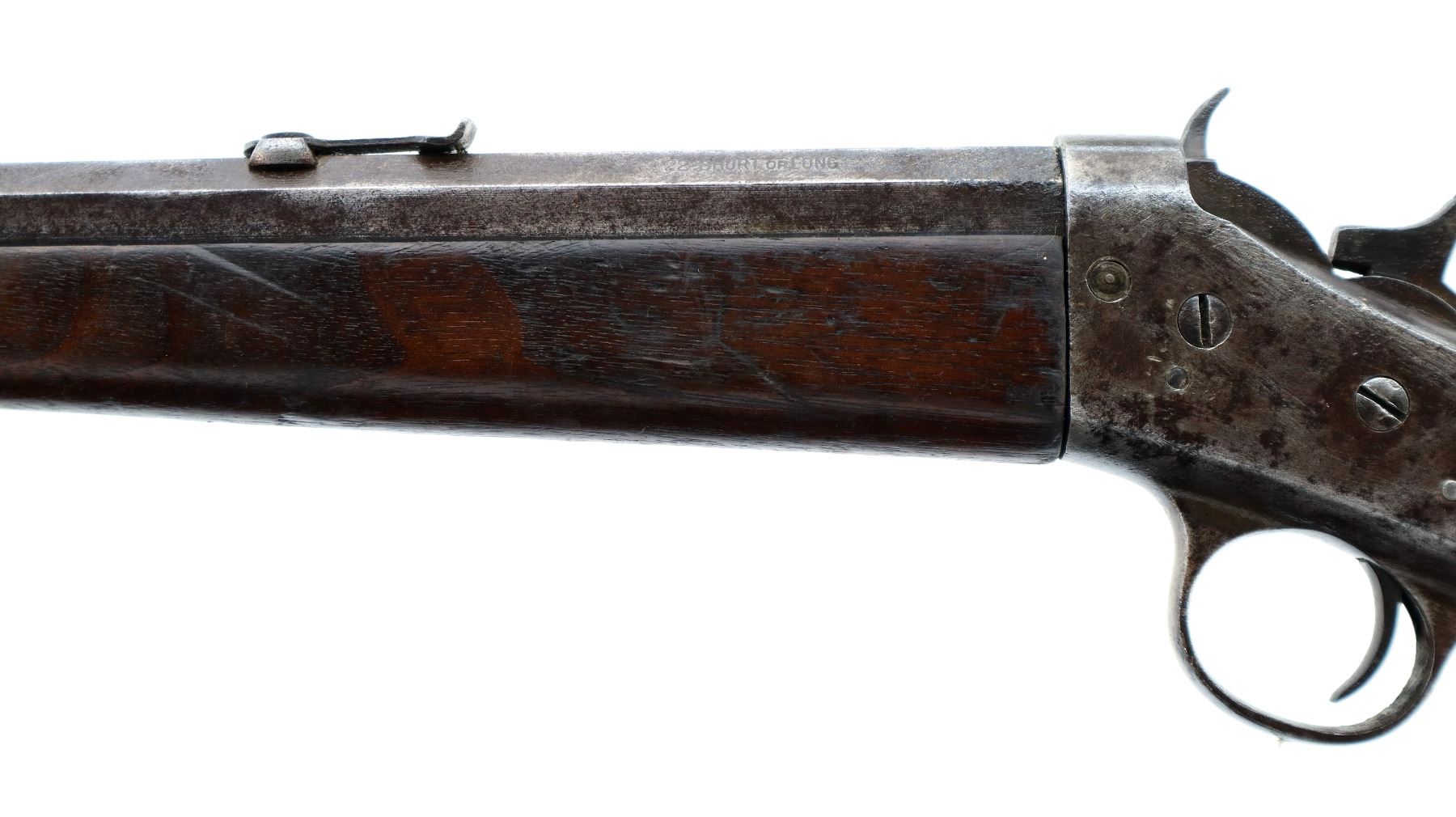 Main Description: Blade front sight, u notched rear sight, octagon barrel, checkered spur hammer and opening lever, extractor is present, action does not function correctly requires adjustment or repair. Two piece wood stocks, forearm is chipped, straight grip chipped and cracked behind receiver and tang, smooth curved steel butt plate.