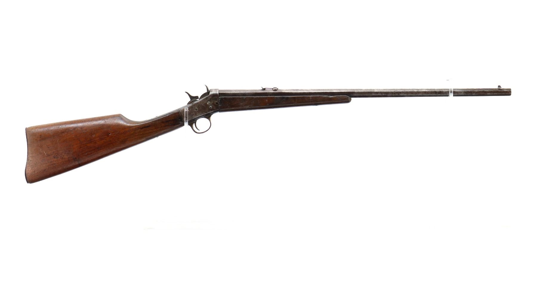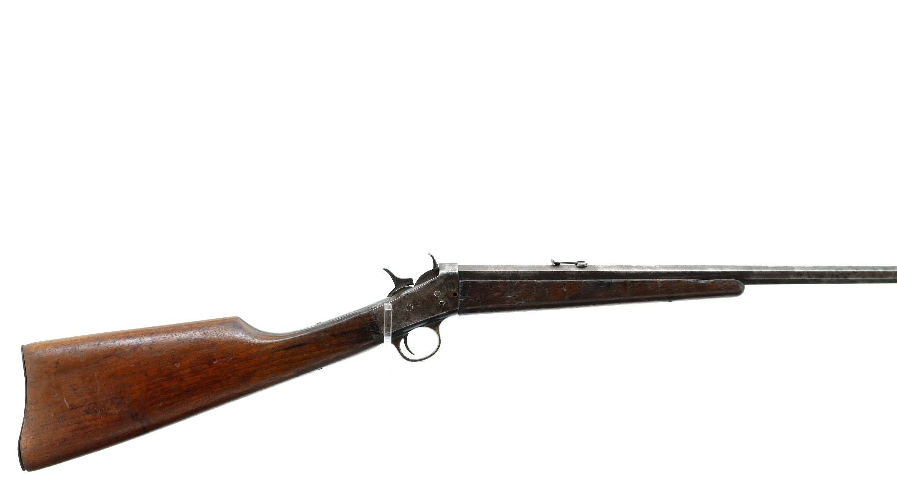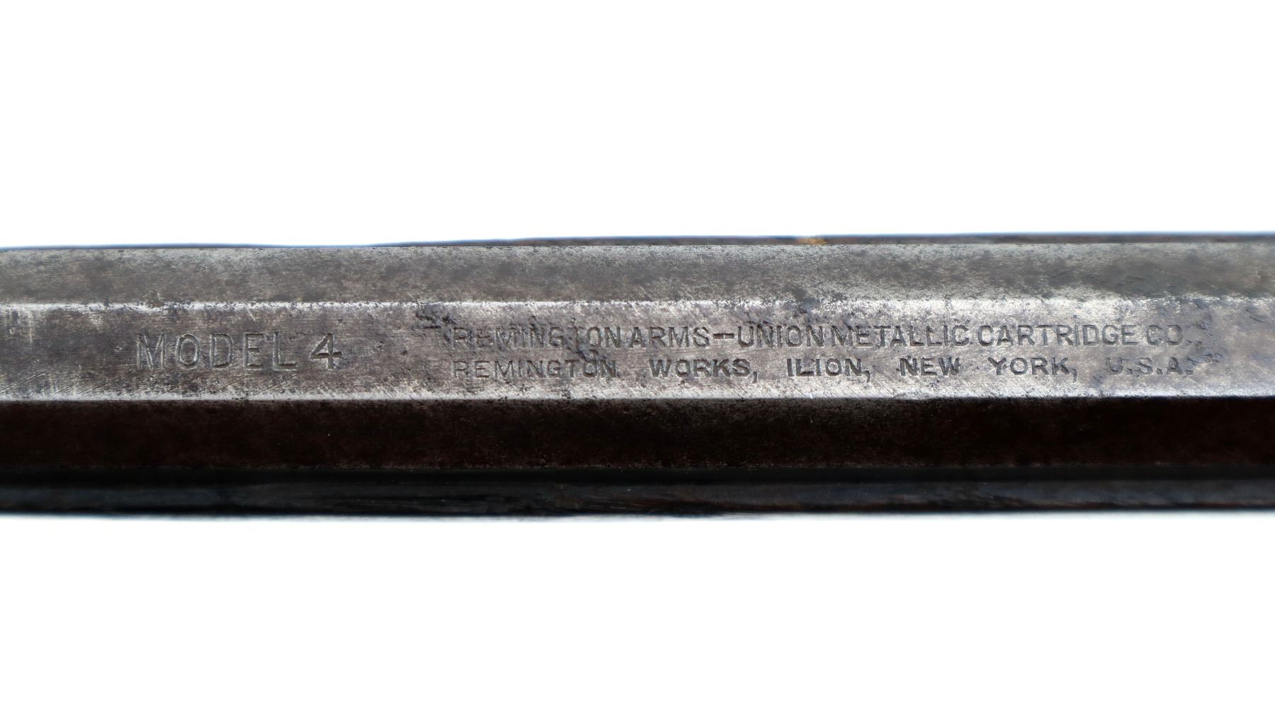 Main Description: Blade front sight, u notched rear sight, octagon barrel, checkered spur hammer and opening lever, extractor is present, action does not function correctly requires adjustment or repair. Two piece wood stocks, forearm is chipped, straight grip chipped and cracked behind receiver and tang, smooth curved steel butt plate.