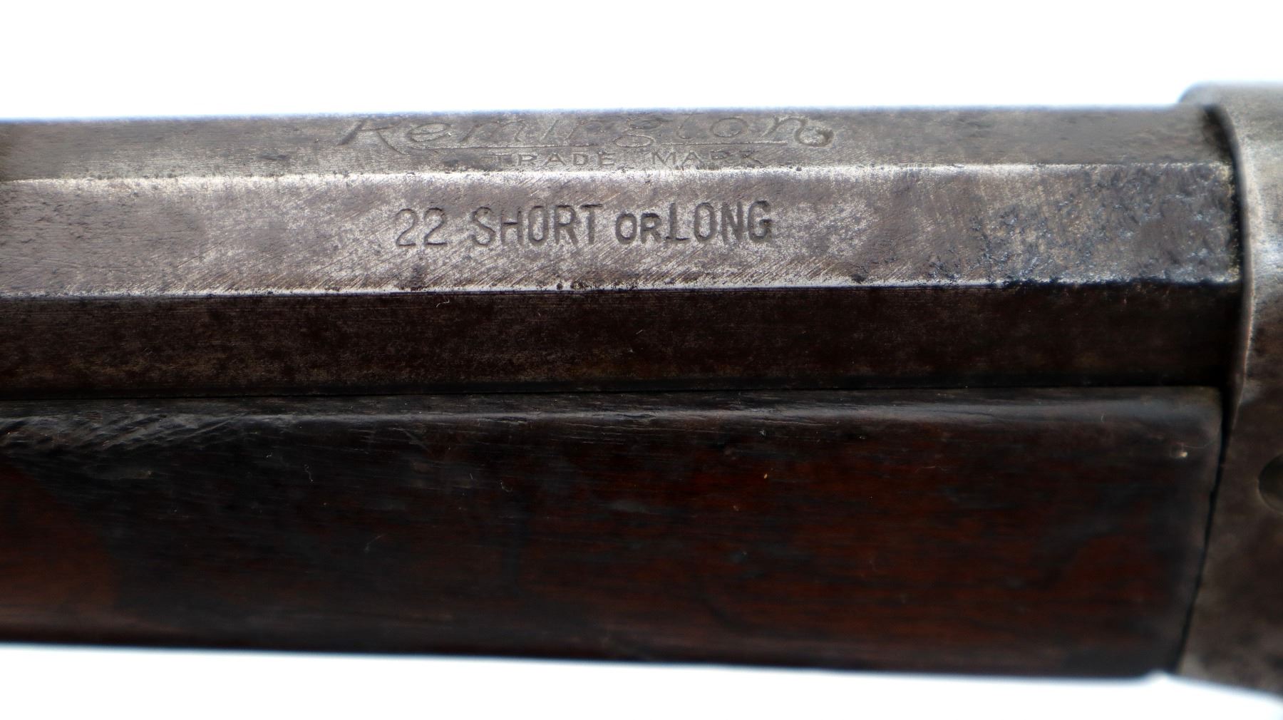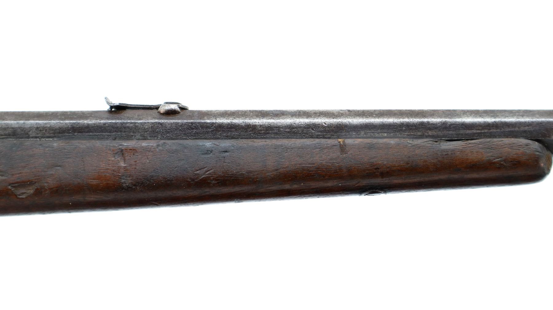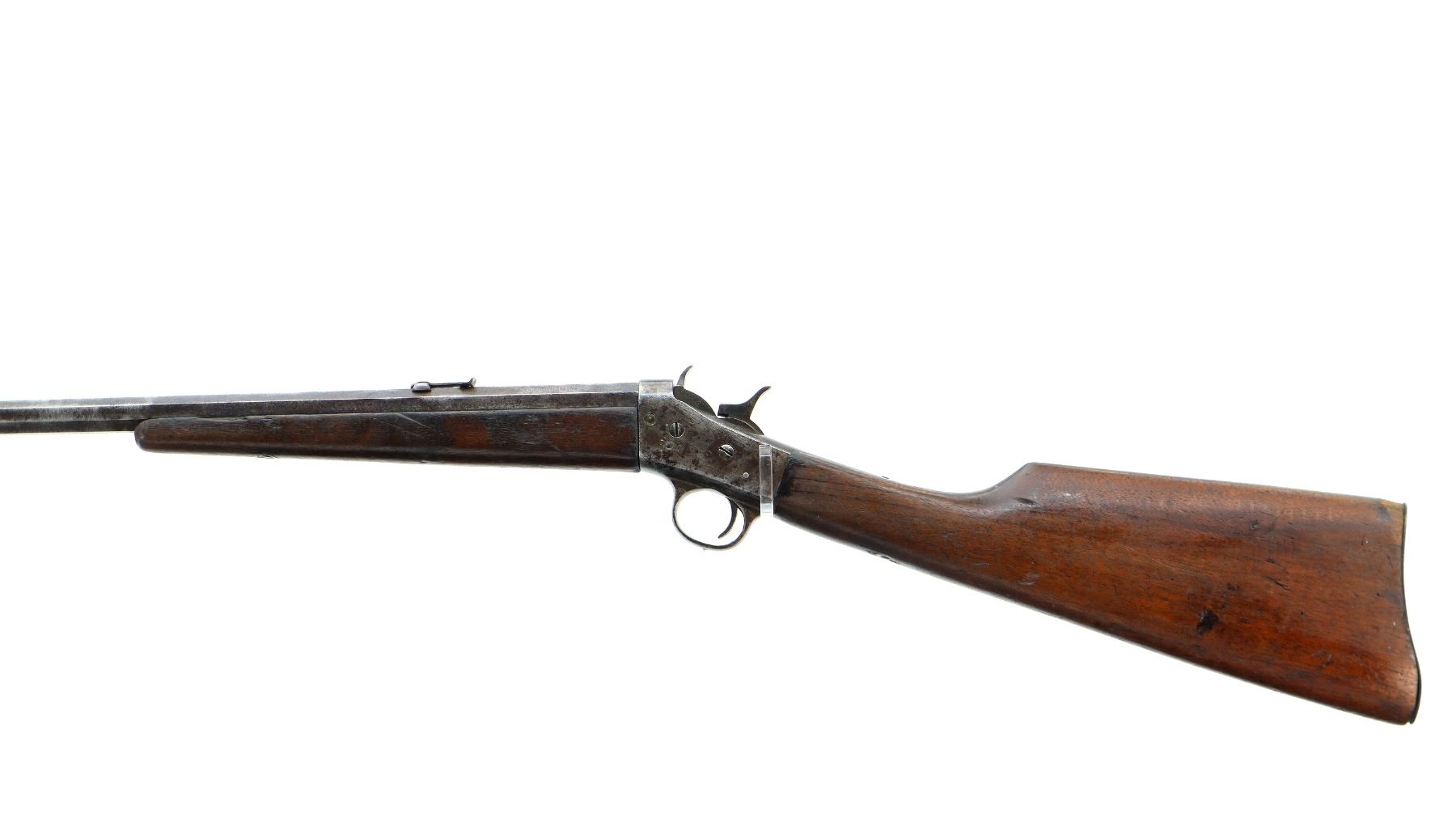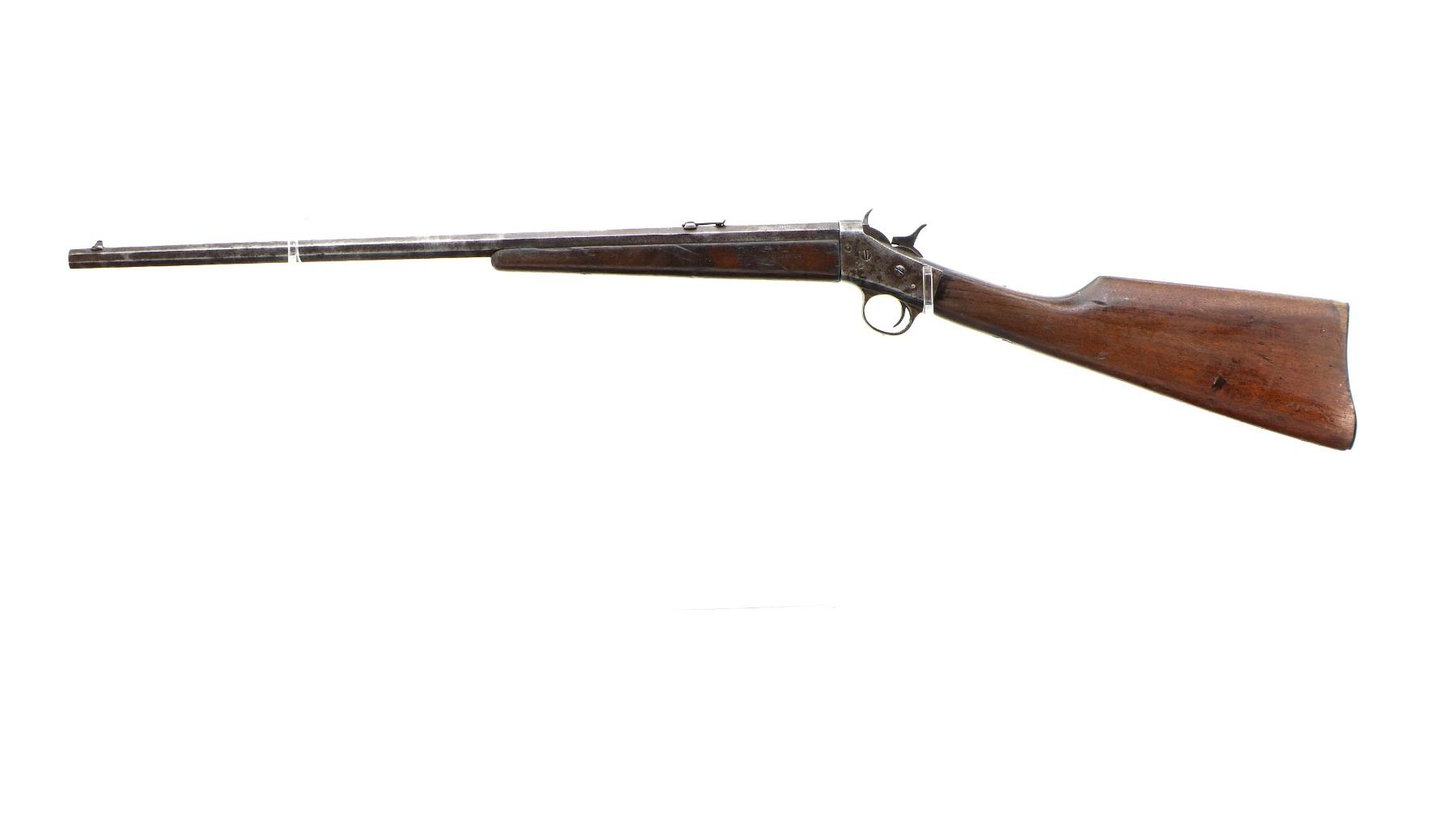 Main Description: Blade front sight, u notched rear sight, octagon barrel, checkered spur hammer and opening lever, extractor is present, action does not function correctly requires adjustment or repair. Two piece wood stocks, forearm is chipped, straight grip chipped and cracked behind receiver and tang, smooth curved steel butt plate.