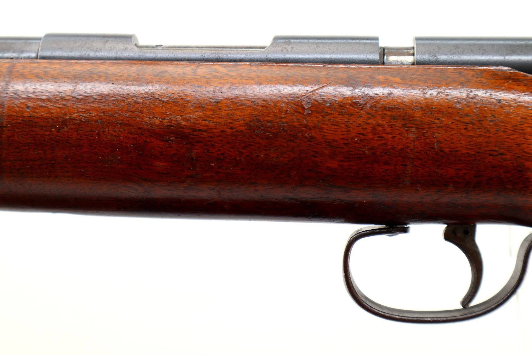 Main Description: Blade front sight, adjustable u notched rear sight, smooth bolt knob. One piece wood stock, pistol grip, checkered black polymer butt plate, initials on bottom of grip.