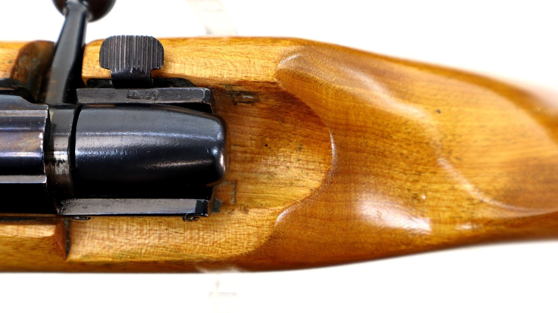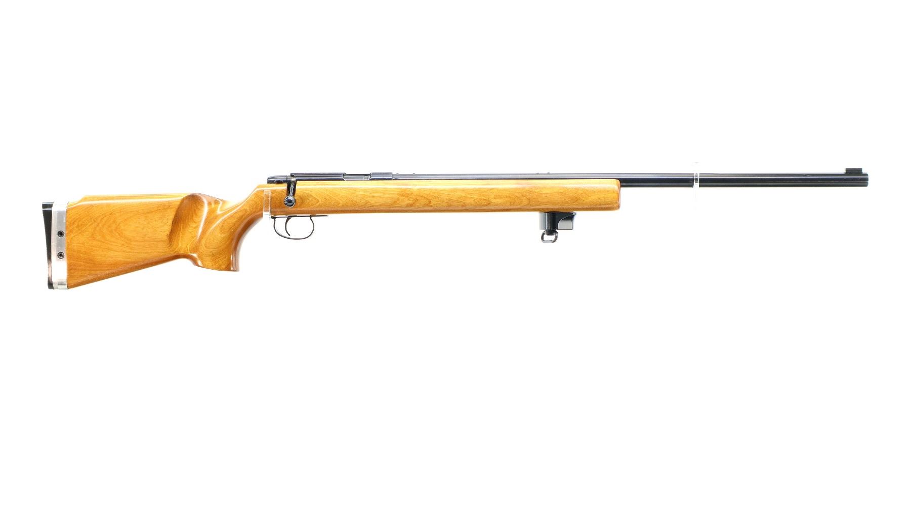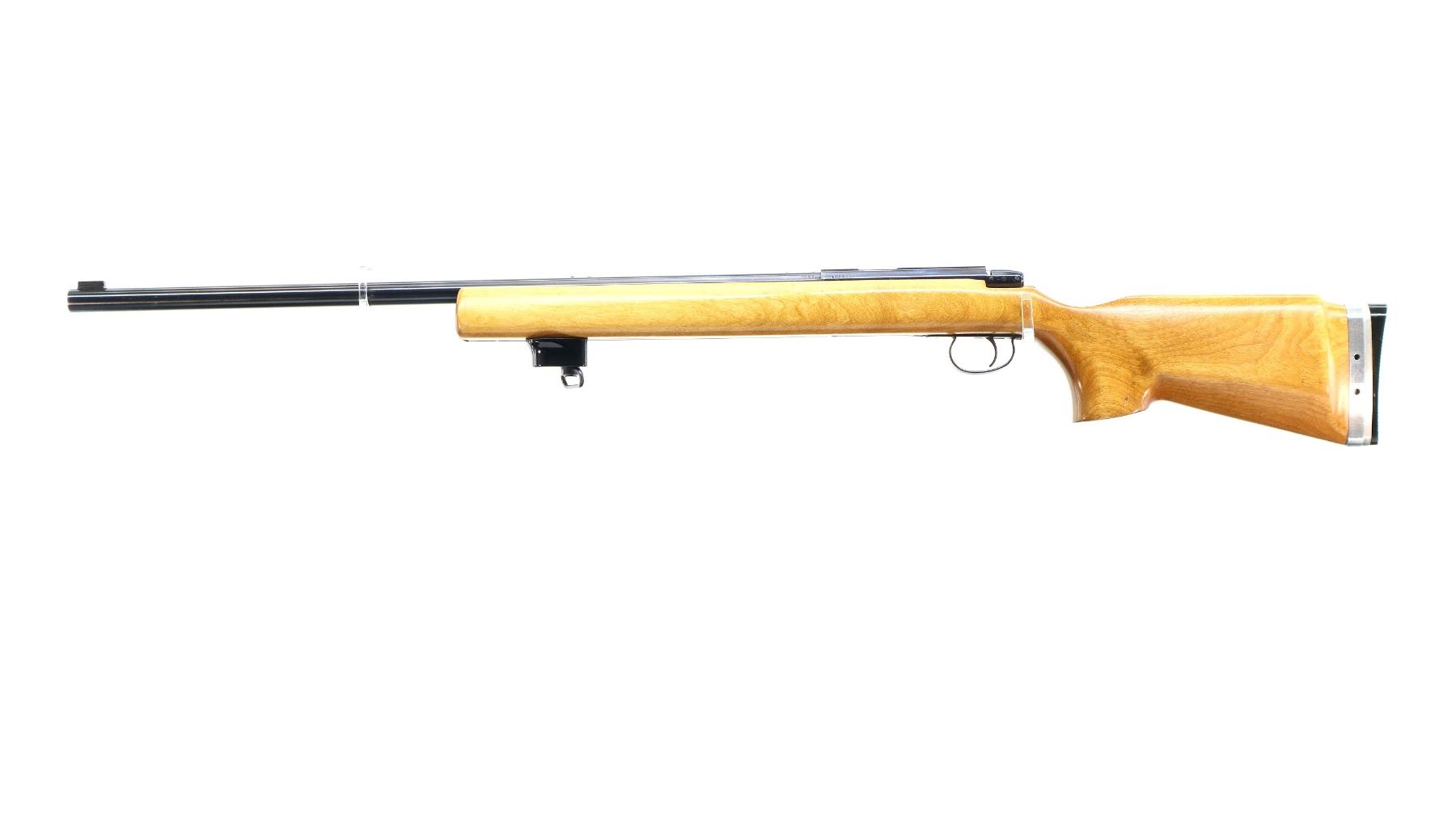 Main Description: No sights, has a Unertl style base at muzzle, possibly reblued finish, heavy barrel drilled and tapped with plug screws installed, grooved receiver. One piece target style wood stock, pistol grip, cheek rest, adjustable checkered black polymer butt plate, full length rail under forearm with black polymer hand stop and swivel.
