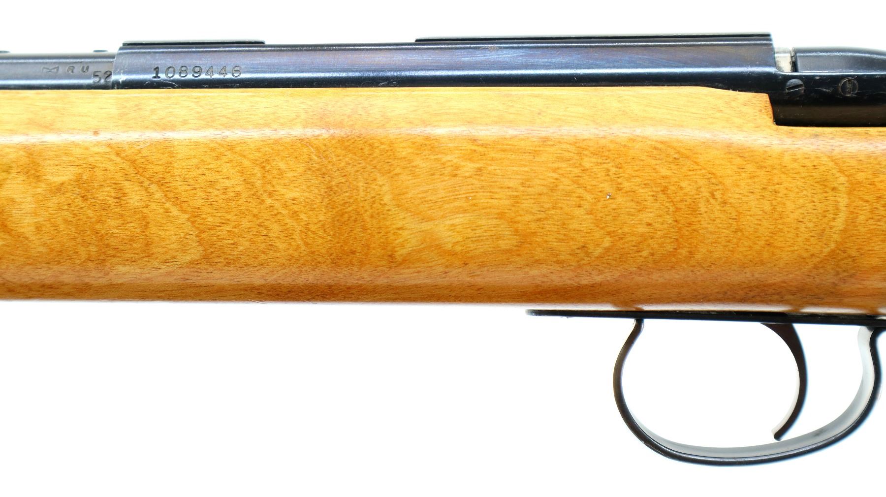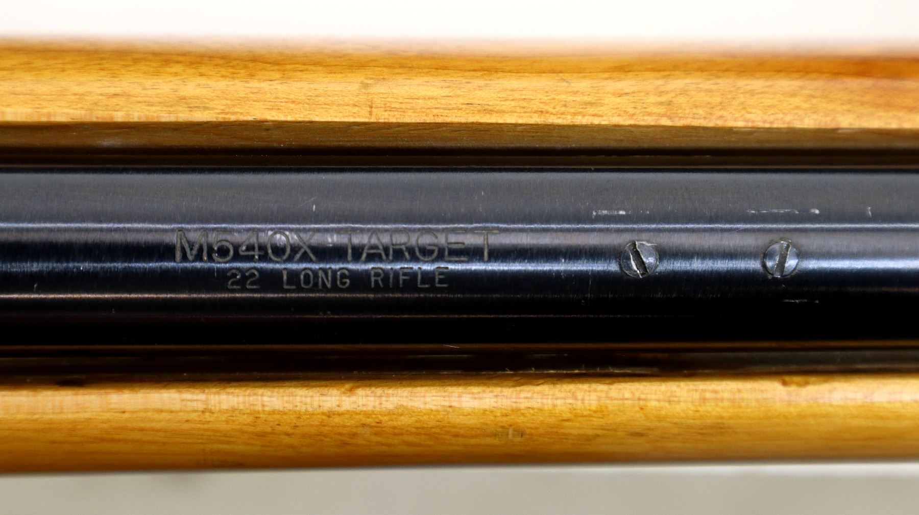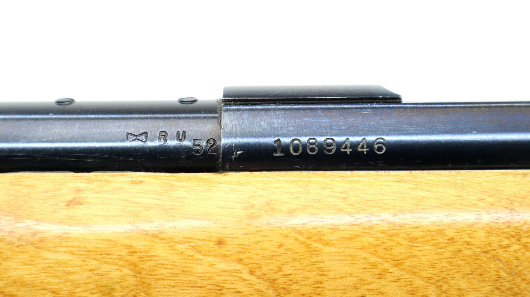 Main Description: No sights, has a Unertl style base at muzzle, possibly reblued finish, heavy barrel drilled and tapped with plug screws installed, grooved receiver. One piece target style wood stock, pistol grip, cheek rest, adjustable checkered black polymer butt plate, full length rail under forearm with black polymer hand stop and swivel.