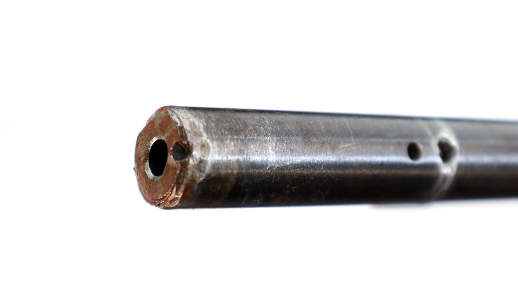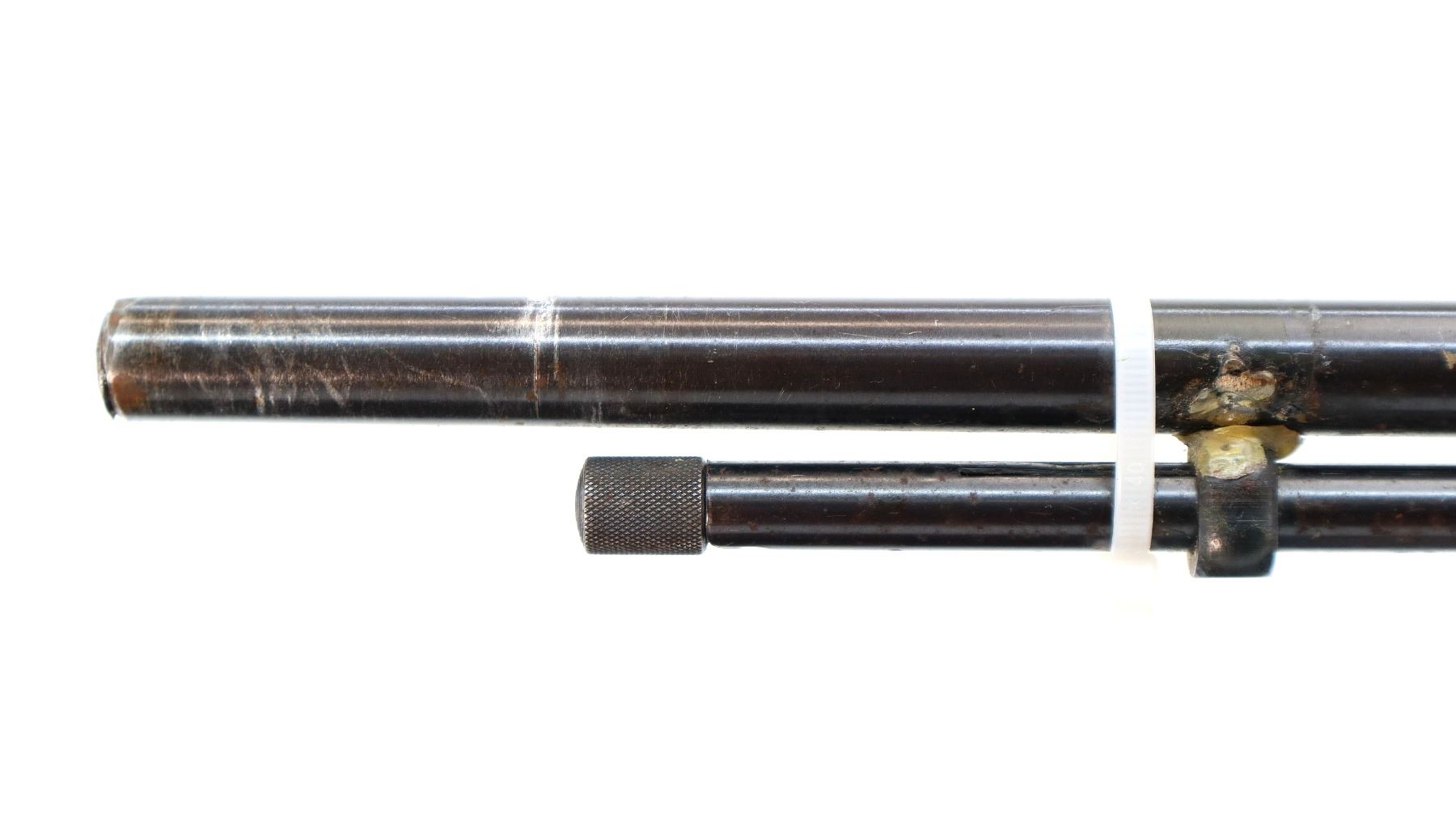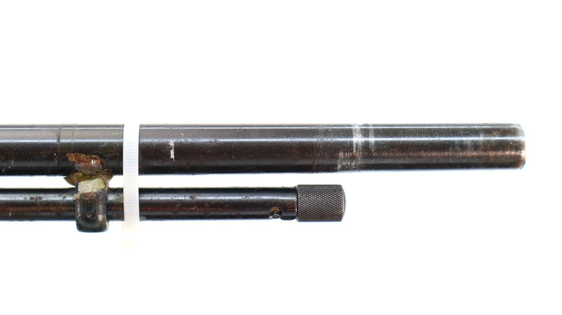 Main Description: Missing front and rear sights, holes are present, barrel appears to be shortened, grooved black alloy receiver. Two piece wood stocks, forearm does not fit properly requires adjustment or repair, checkered pistol grip and black polymer butt plate, grip cap, missing rear swivel hole is present, front magtube band not attached requires repair has welds visible.