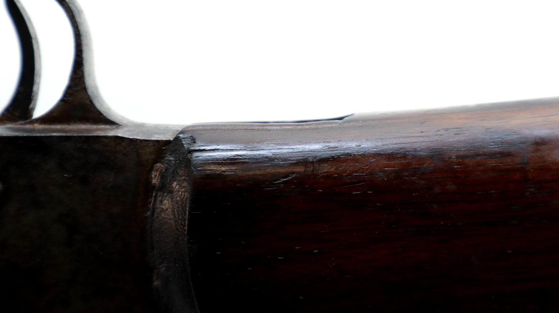 Main Description: Blade front sight, u notched rear sight, checkered spur hammer, extractor is present. Two piece wood stocks, straight grip chipped and cracked behind receiver, smooth steel butt plate.