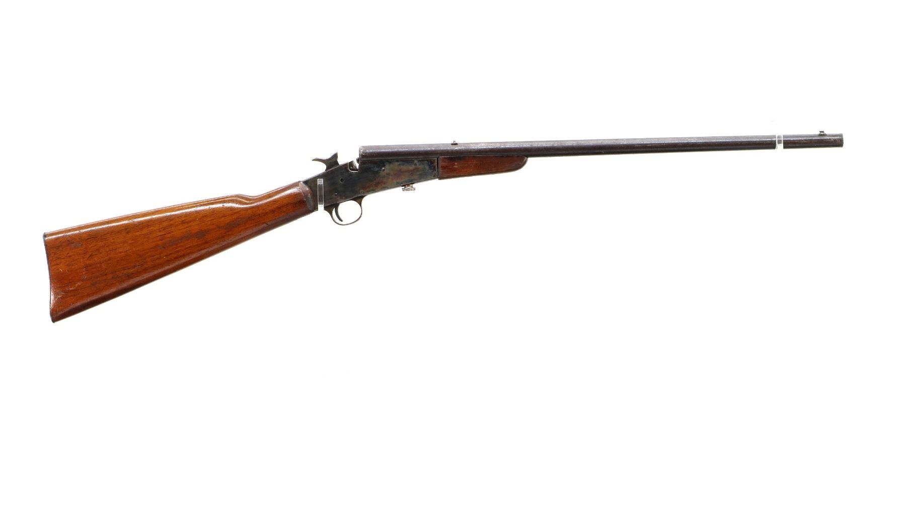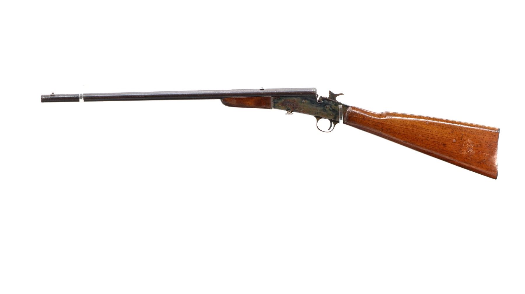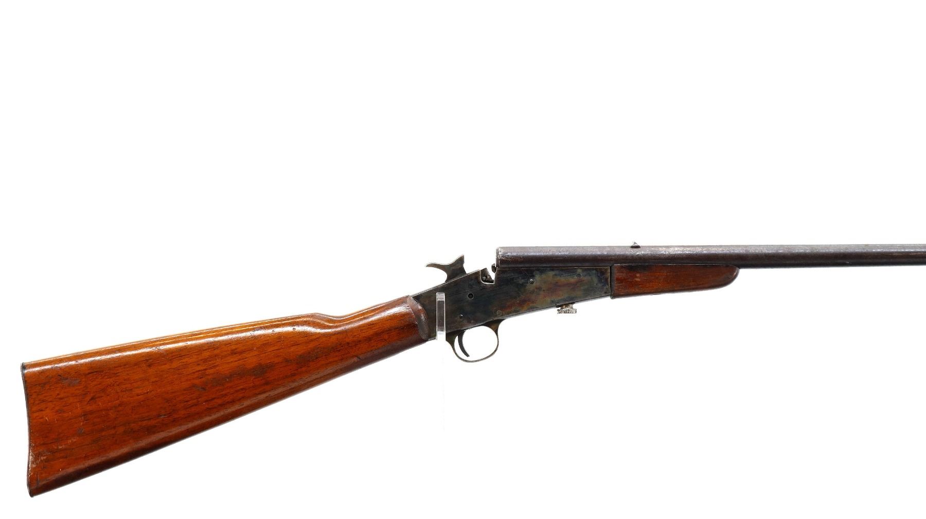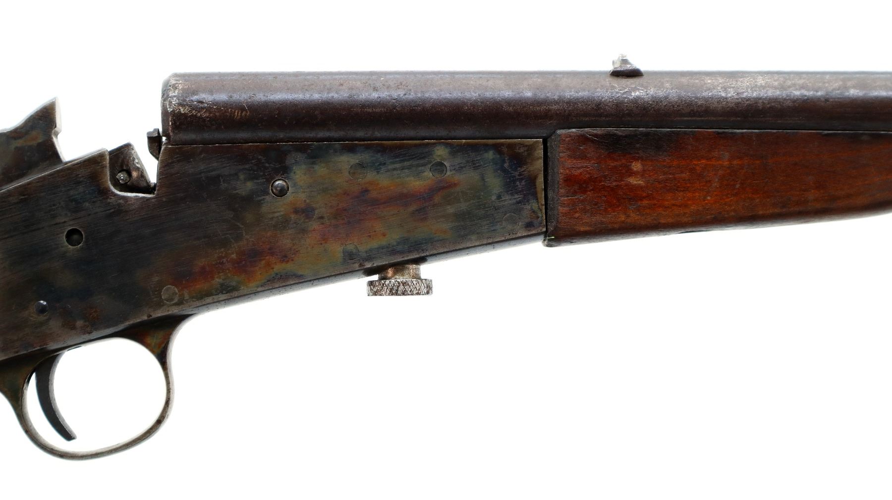 Main Description: Blade front sight, u notched rear sight, round barrel, colour case hardened receiver, grooved spur hammer, missing opening lever extractor is present. Two piece wood stocks, straight grip cracked behind receiver, smooth steel butt plate.