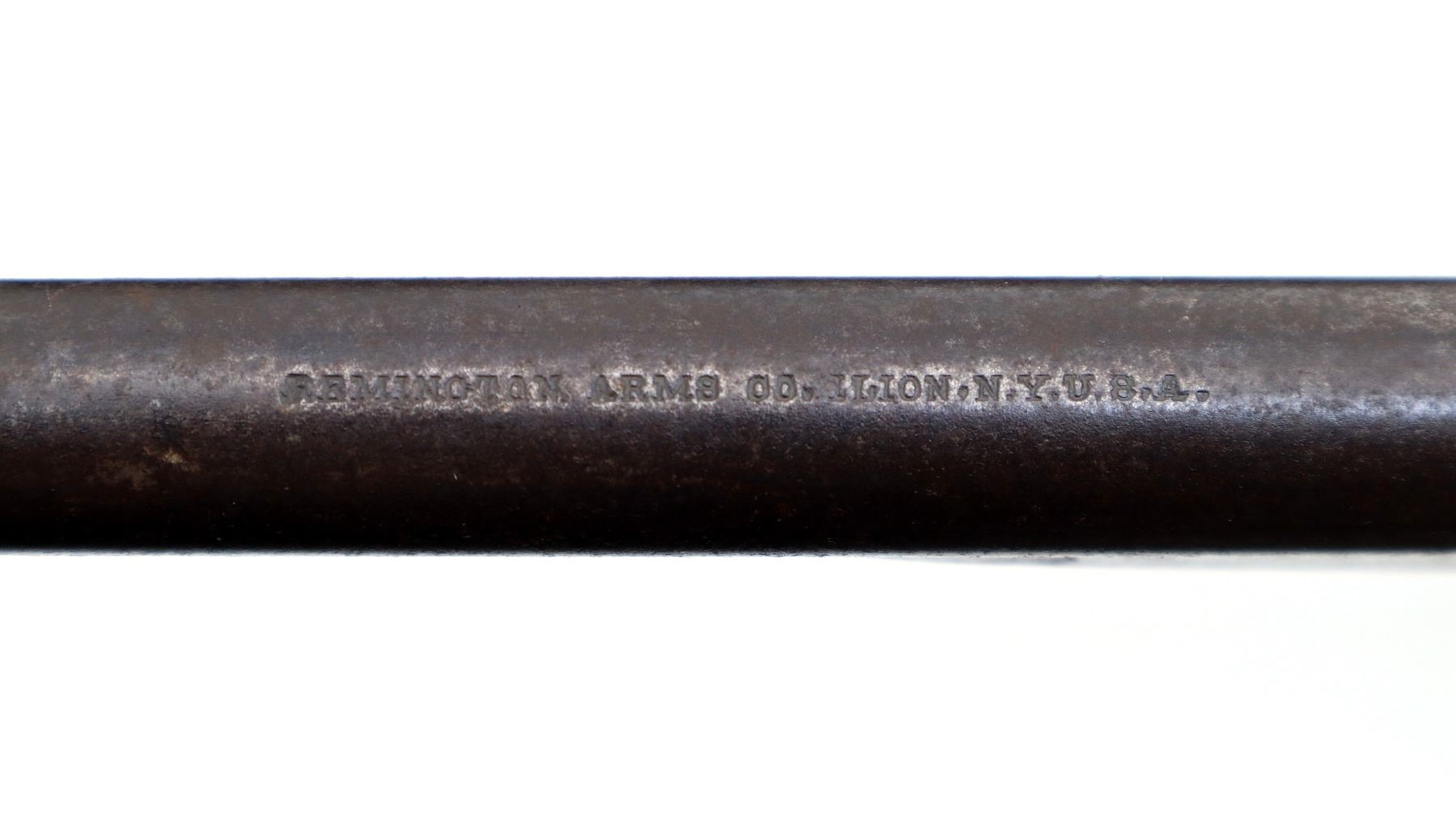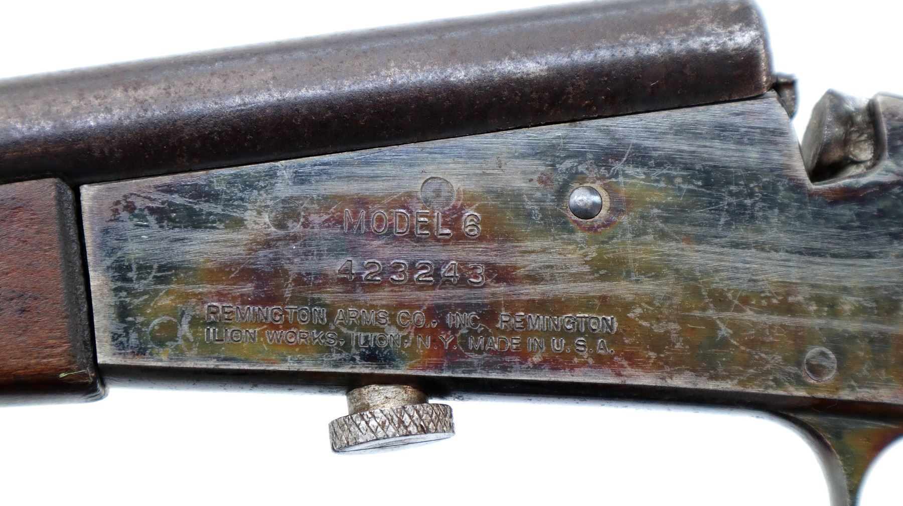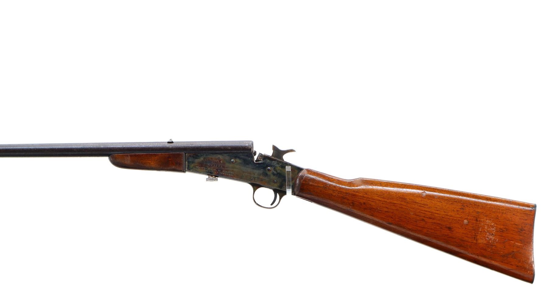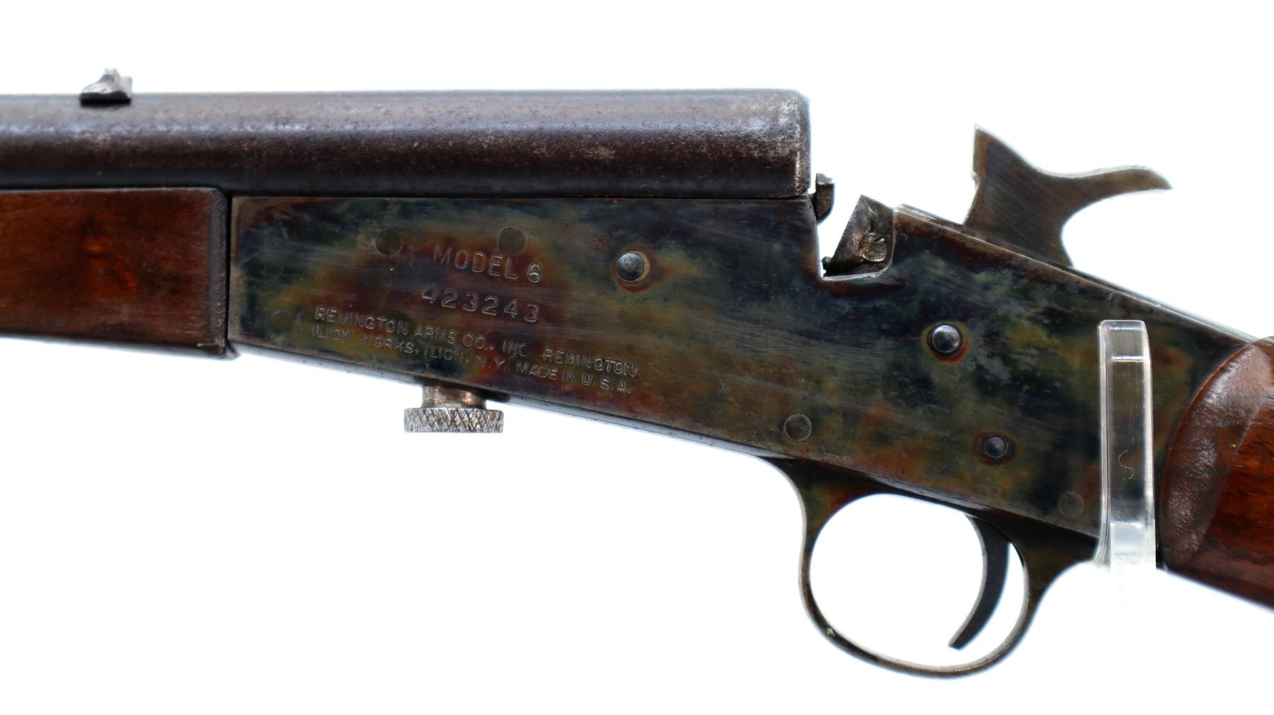 Main Description: Blade front sight, u notched rear sight, round barrel, colour case hardened receiver, grooved spur hammer, missing opening lever extractor is present. Two piece wood stocks, straight grip cracked behind receiver, smooth steel butt plate.