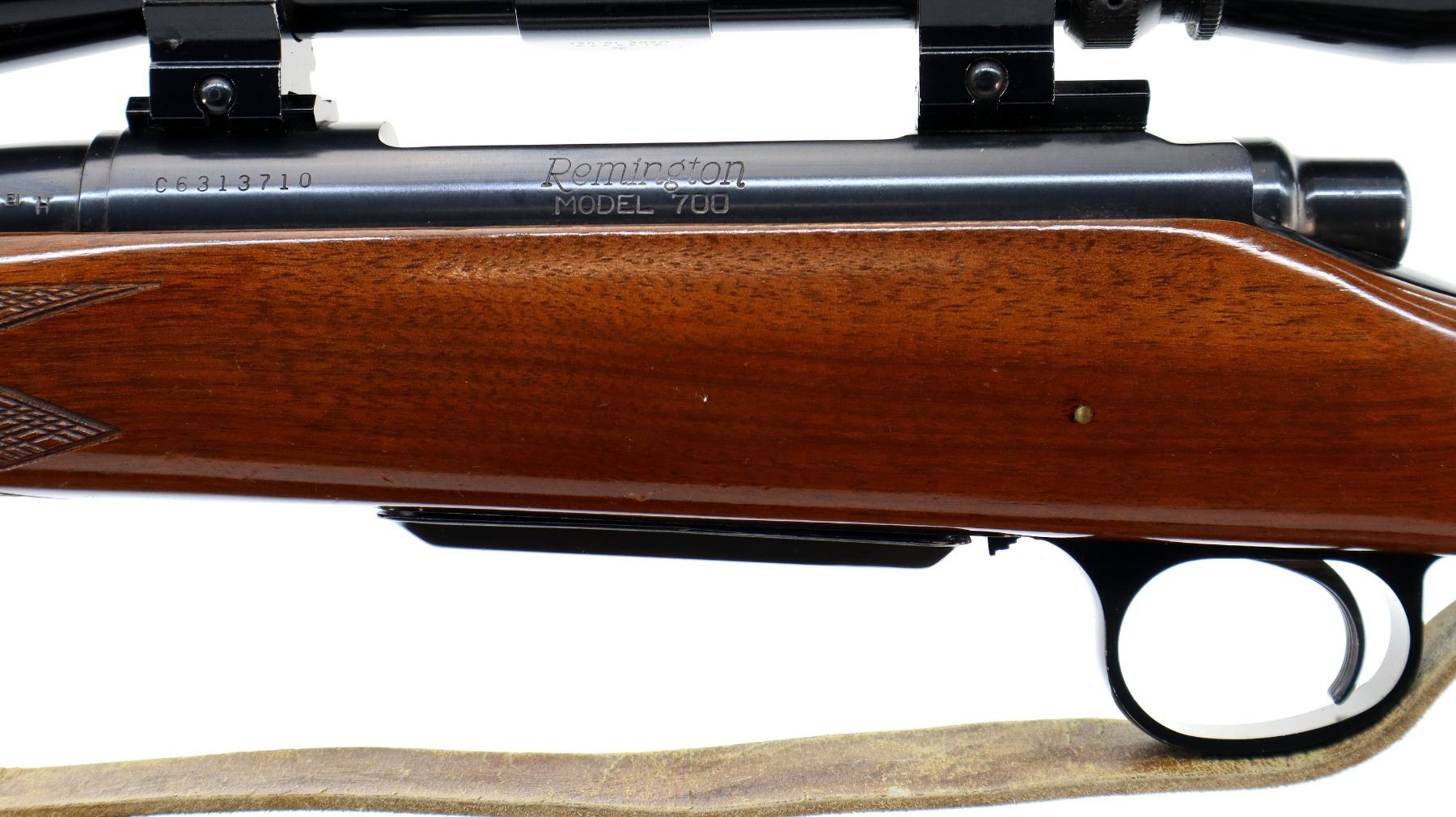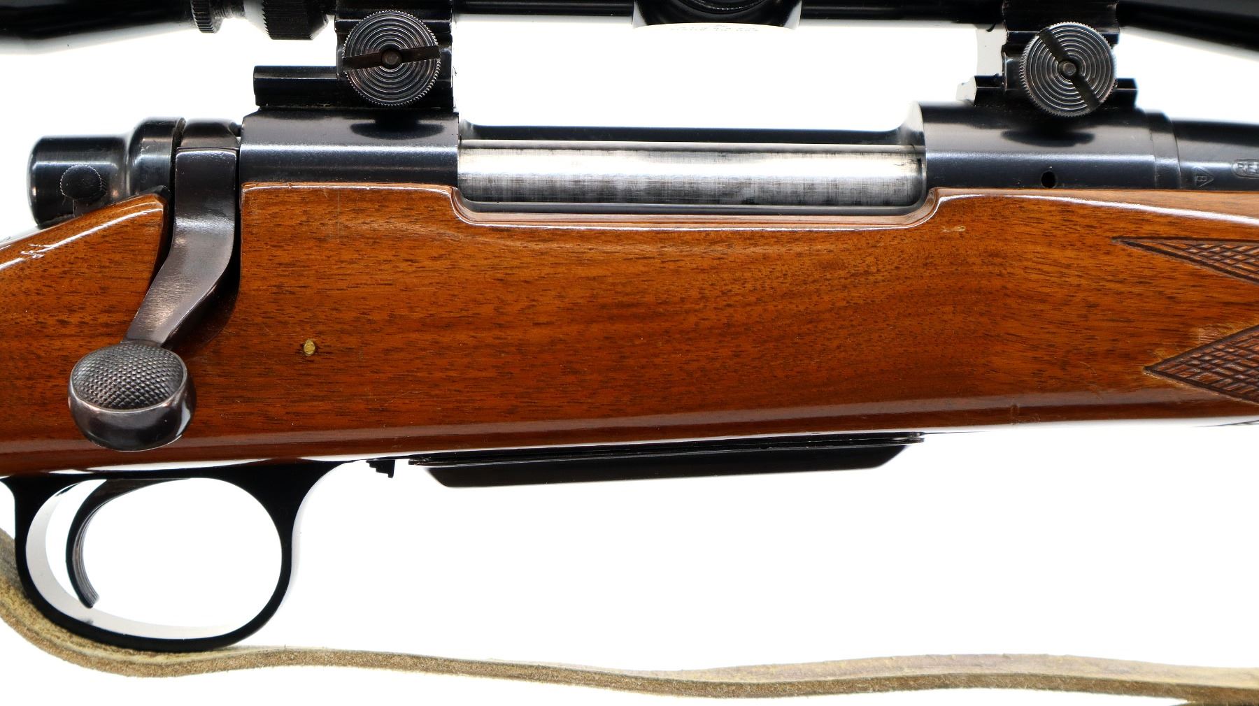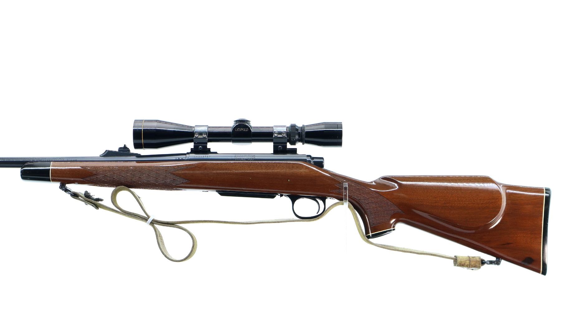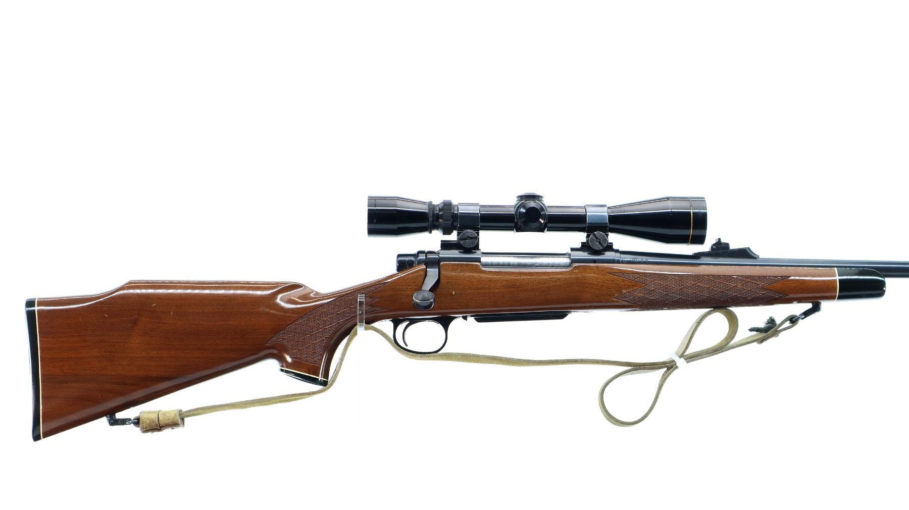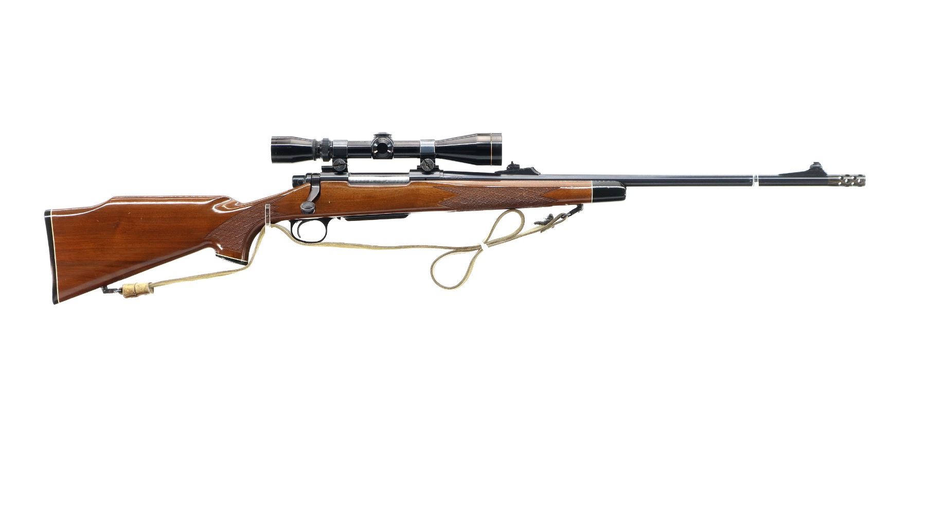 Main Description: Blade front sight with ramp, adjustable u notched rear sight, blued finish, threaded muzzle with ported brake installed, receiver drilled and tapped with Leupold Vari X II 3-9x40 scope installed, clear optics with duplex crosshair. Jeweled bolt with checkered knob. One piece wood stock, black polymer forend and pistol grip caps, checkered forearm, pistol grip and black polymer butt plate. Cheek rest, grip cap, sling swivels with tan leather sling.