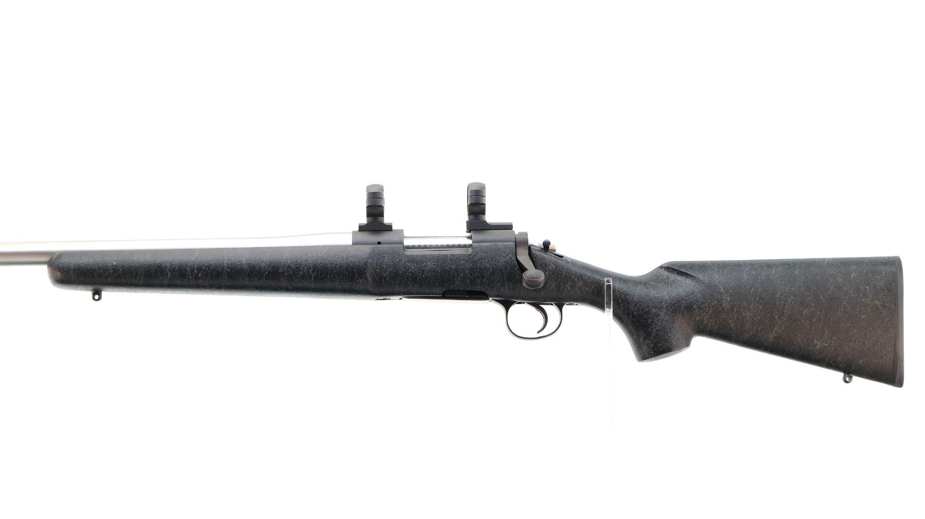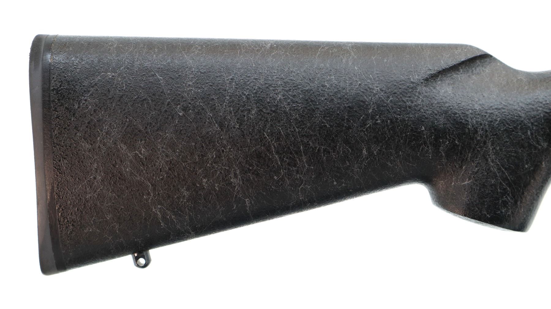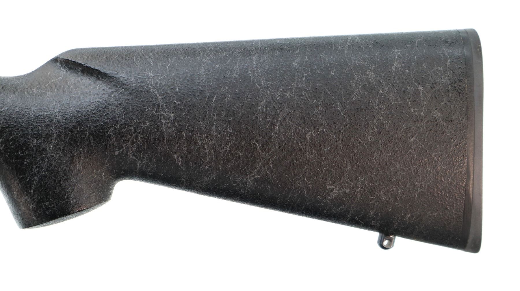 Main Description: No sights, stainless heavy barrel, Parkerized receiver drilled and tapped with two piece turn in 1" rings and bases installed, left hand ejection port, jeweled bolt with checkered knob. One piece black/grey spiderweb fiber glass stock, wide forearm, pistol grip, black rubber recoil pad, swivel studs.