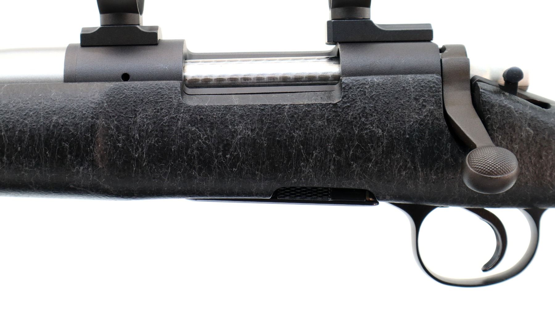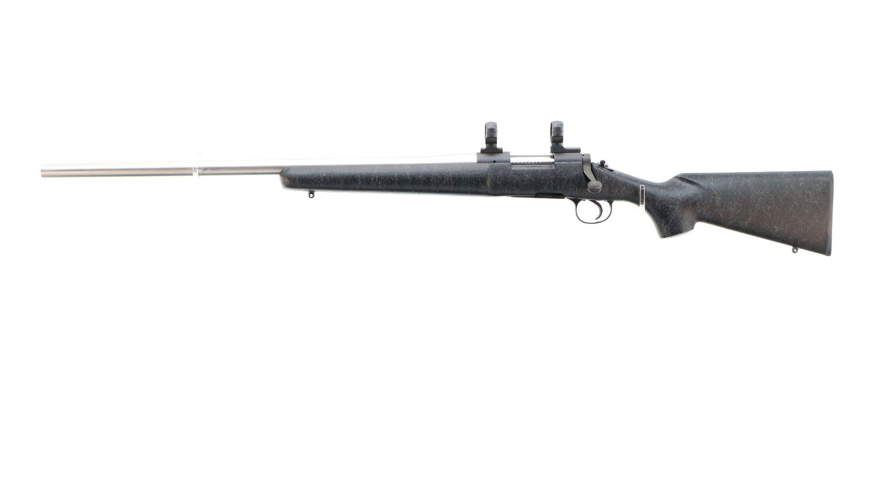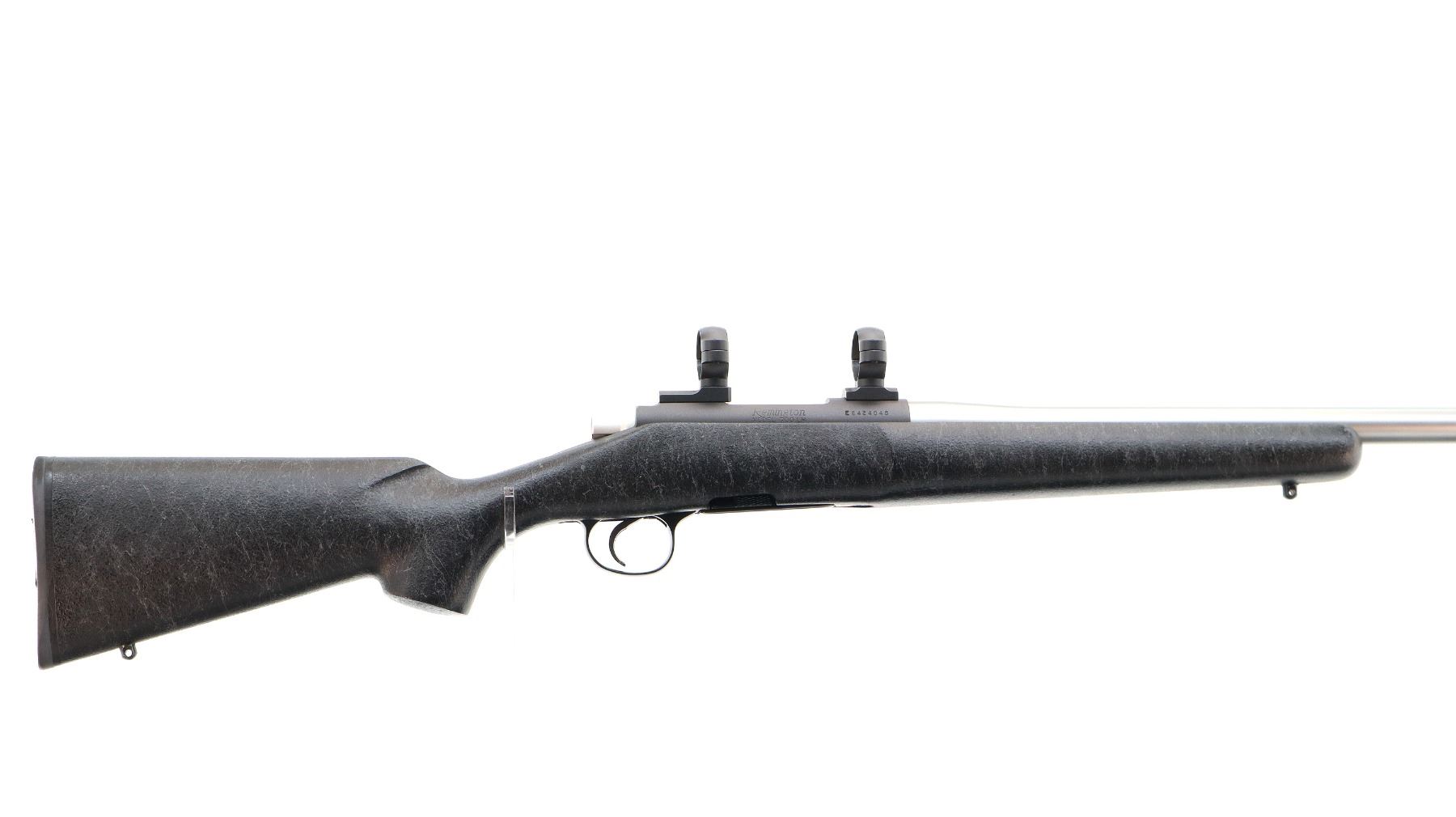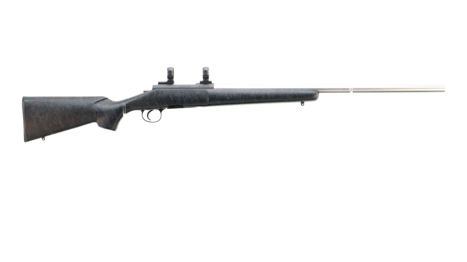 Main Description: No sights, stainless heavy barrel, Parkerized receiver drilled and tapped with two piece turn in 1" rings and bases installed, left hand ejection port, jeweled bolt with checkered knob. One piece black/grey spiderweb fiber glass stock, wide forearm, pistol grip, black rubber recoil pad, swivel studs.