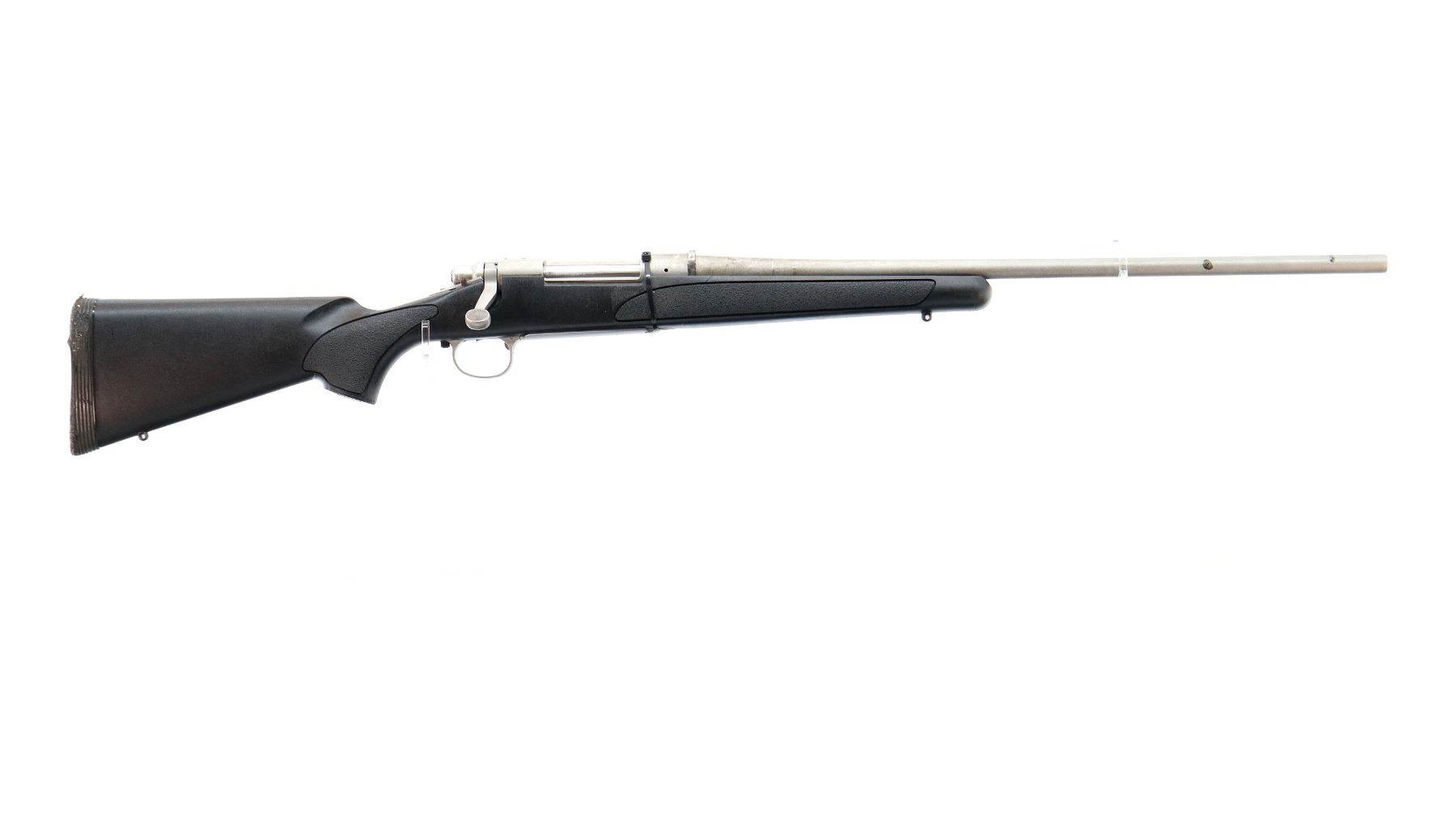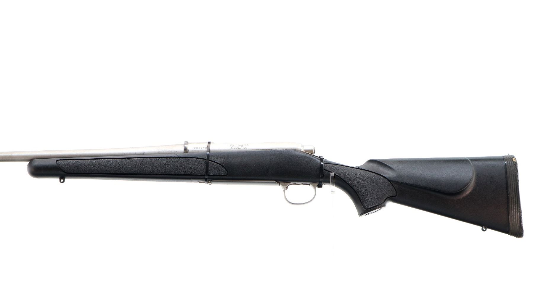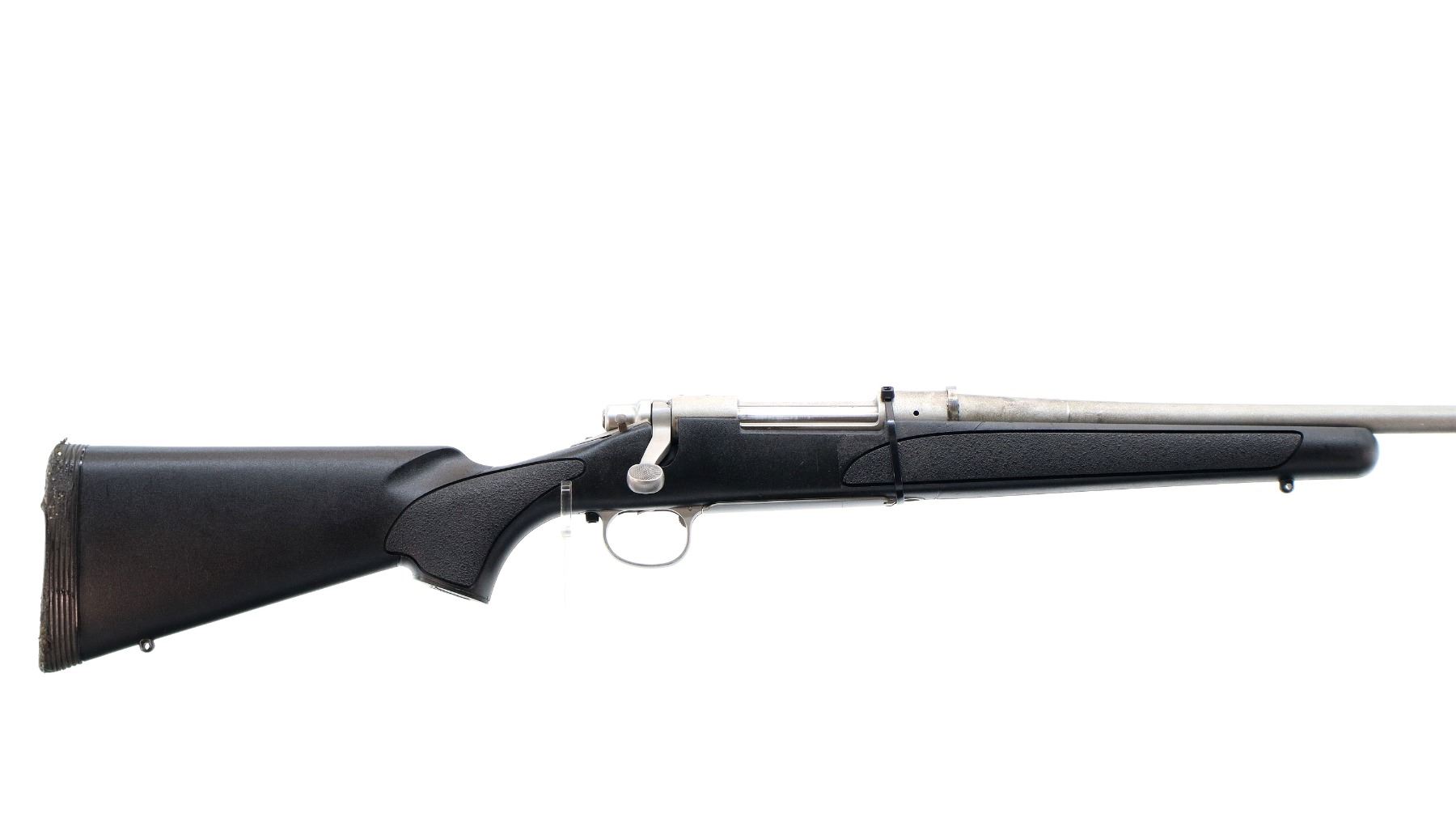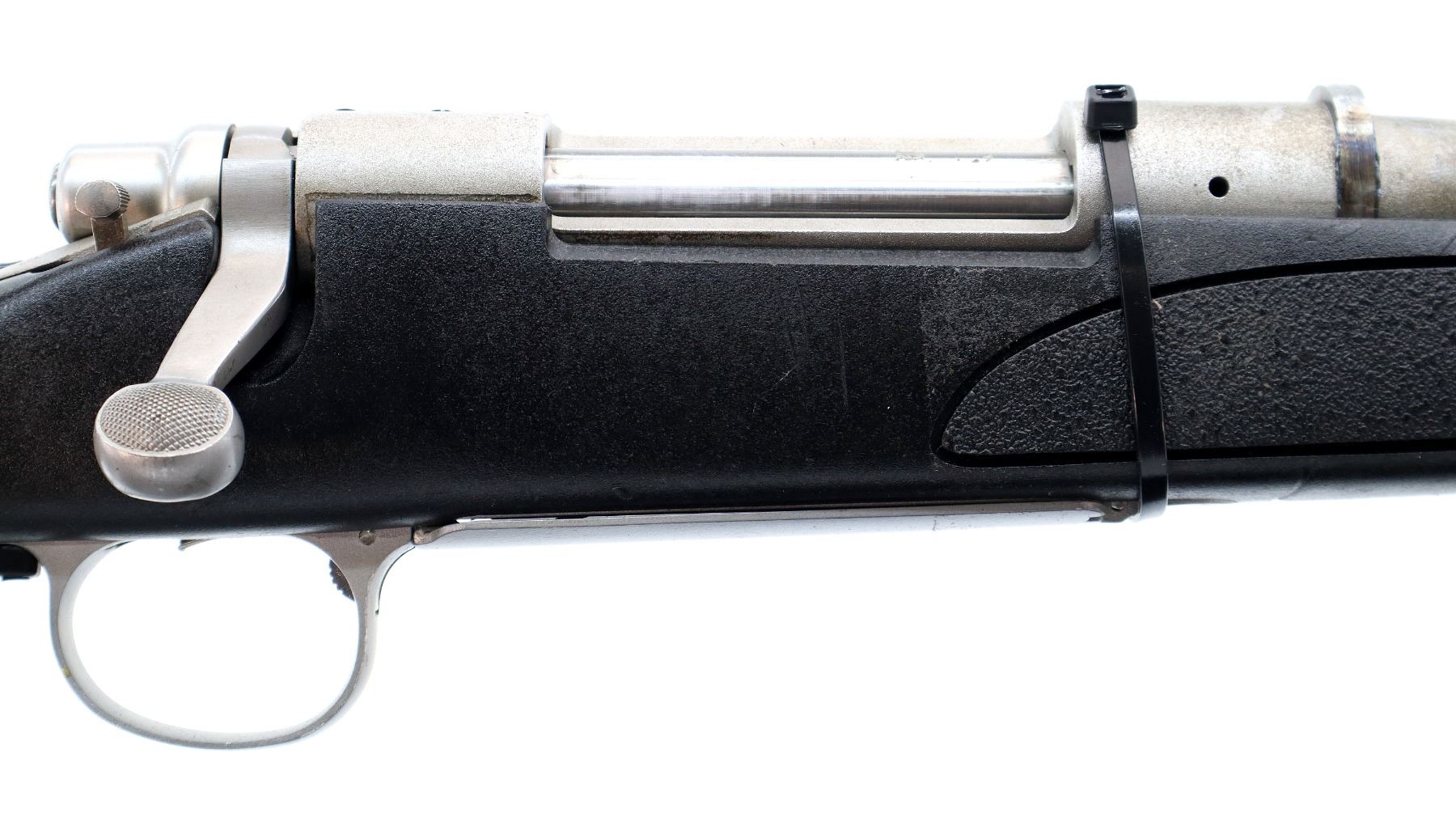 Main Description: No sights, stainless finish, recoil lug in front of receiver appears custom made requires fitting. Receiver drilled and tapped, checkered bolt knob, missing bolt stop assembly action screws and magwell box, trigger is broken. Has a one piece black synthetic stock, textured forearm and pistol grip panels, cheek rest, recoil pad is damaged, grip cap, swivel studs.