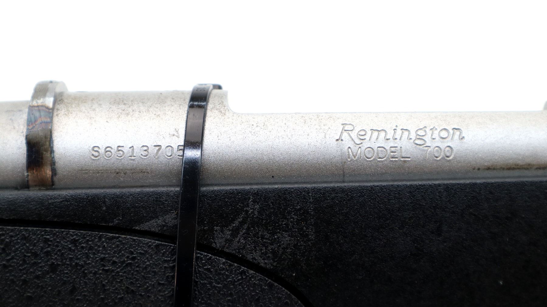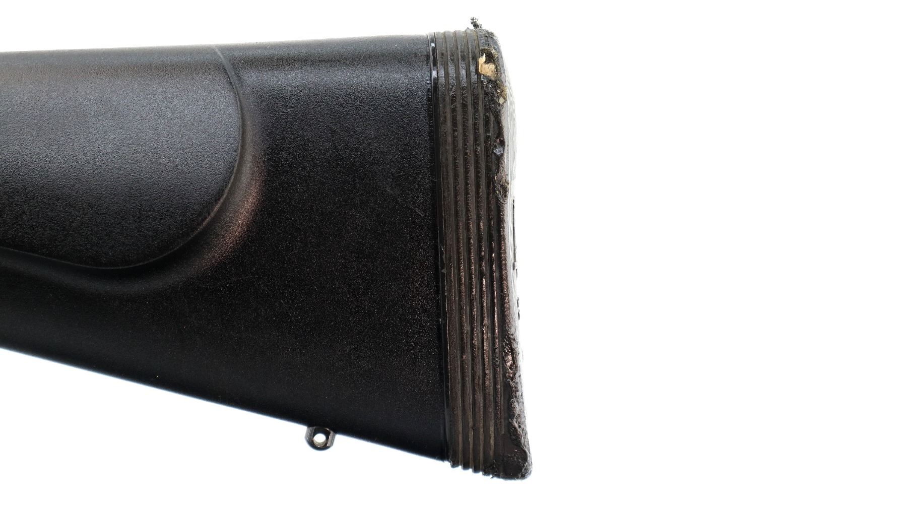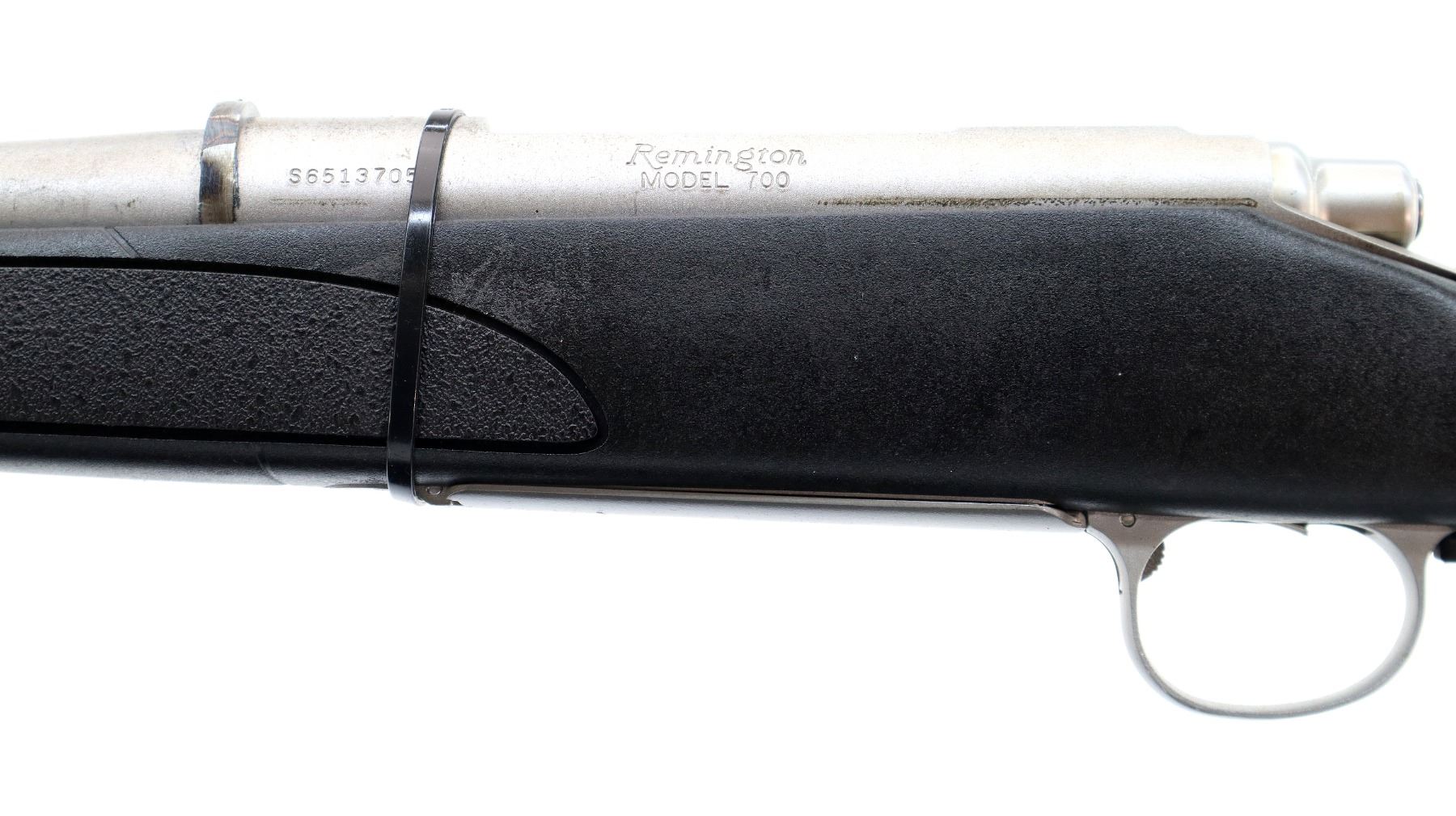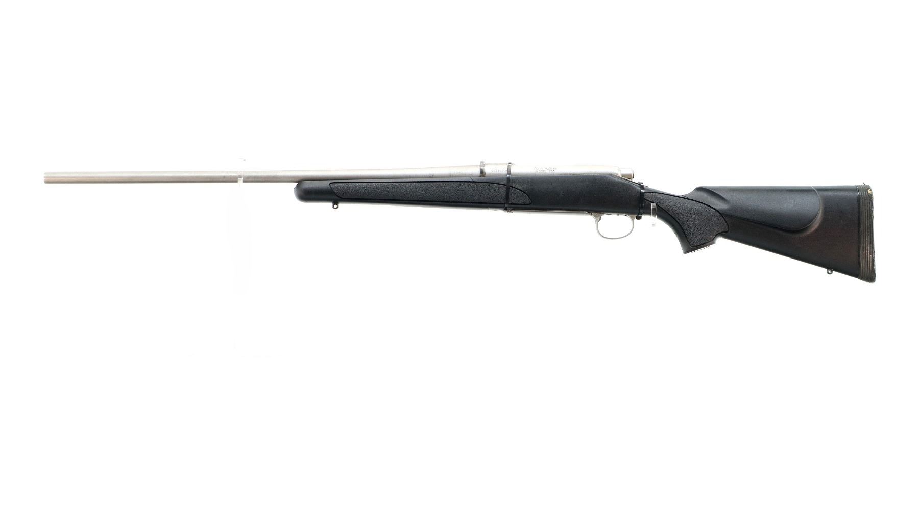 Main Description: No sights, stainless finish, recoil lug in front of receiver appears custom made requires fitting. Receiver drilled and tapped, checkered bolt knob, missing bolt stop assembly action screws and magwell box, trigger is broken. Has a one piece black synthetic stock, textured forearm and pistol grip panels, cheek rest, recoil pad is damaged, grip cap, swivel studs.