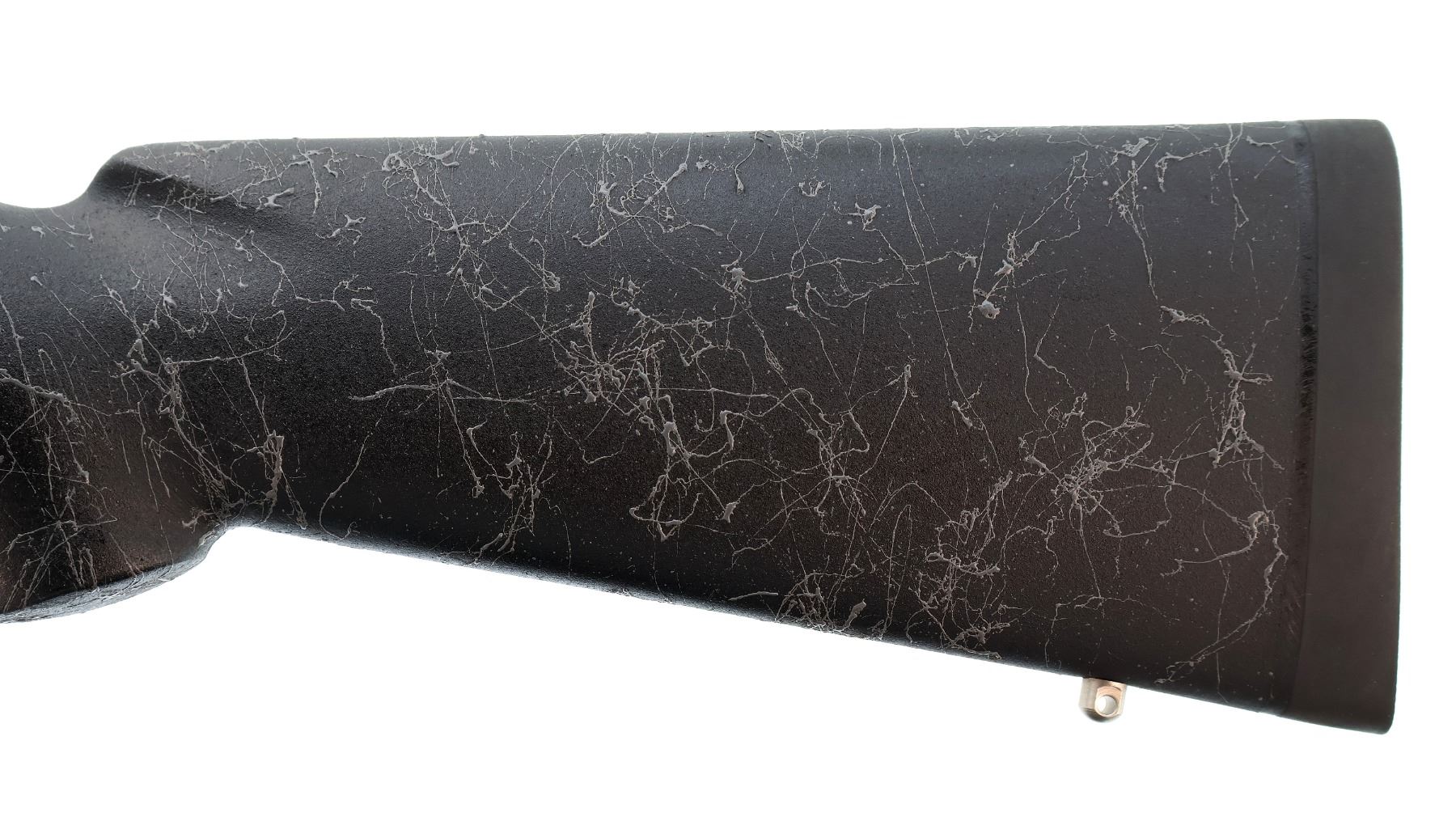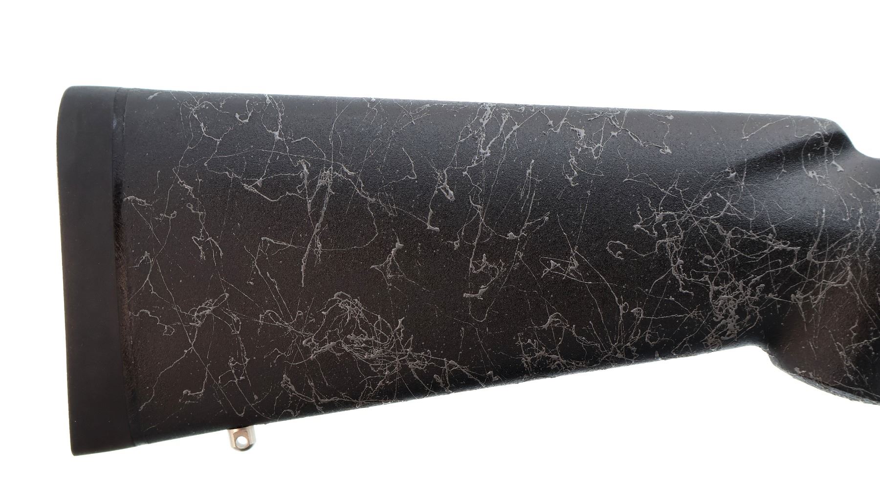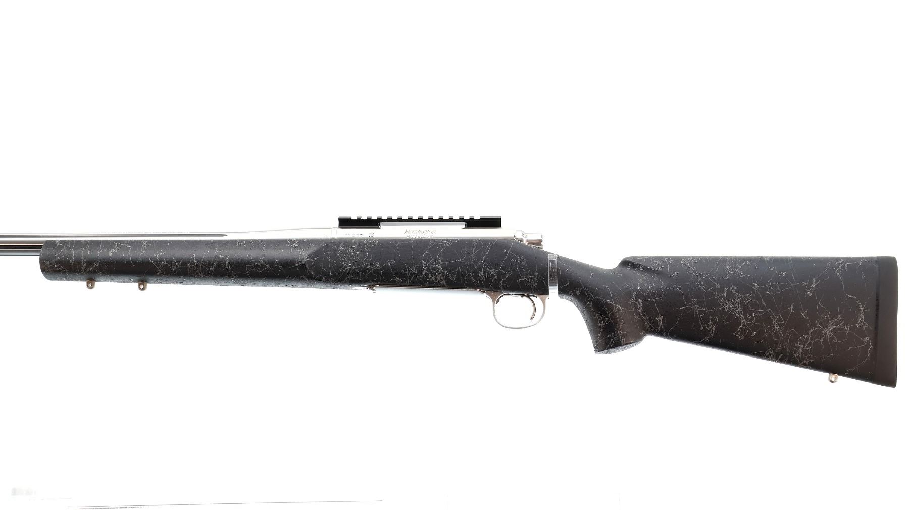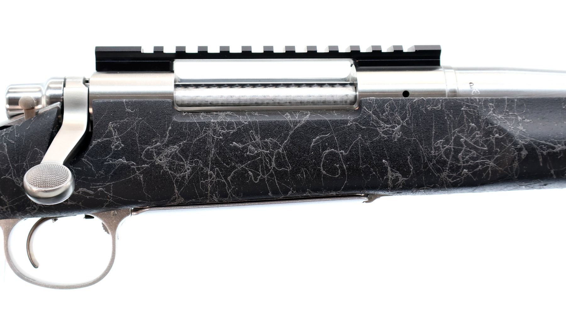Main Description: No sights, stainless finish, fluted heavy barrel threaded at muzzle with cap, receiver drilled and tapped with One piece scope rail installed, jeweled bolt with checkered knob. One piece black/grey spiderweb fiberglass stock, wide forearm, pistol grip, black rubber recoil pad, hinged floor plate, three swivel studs.