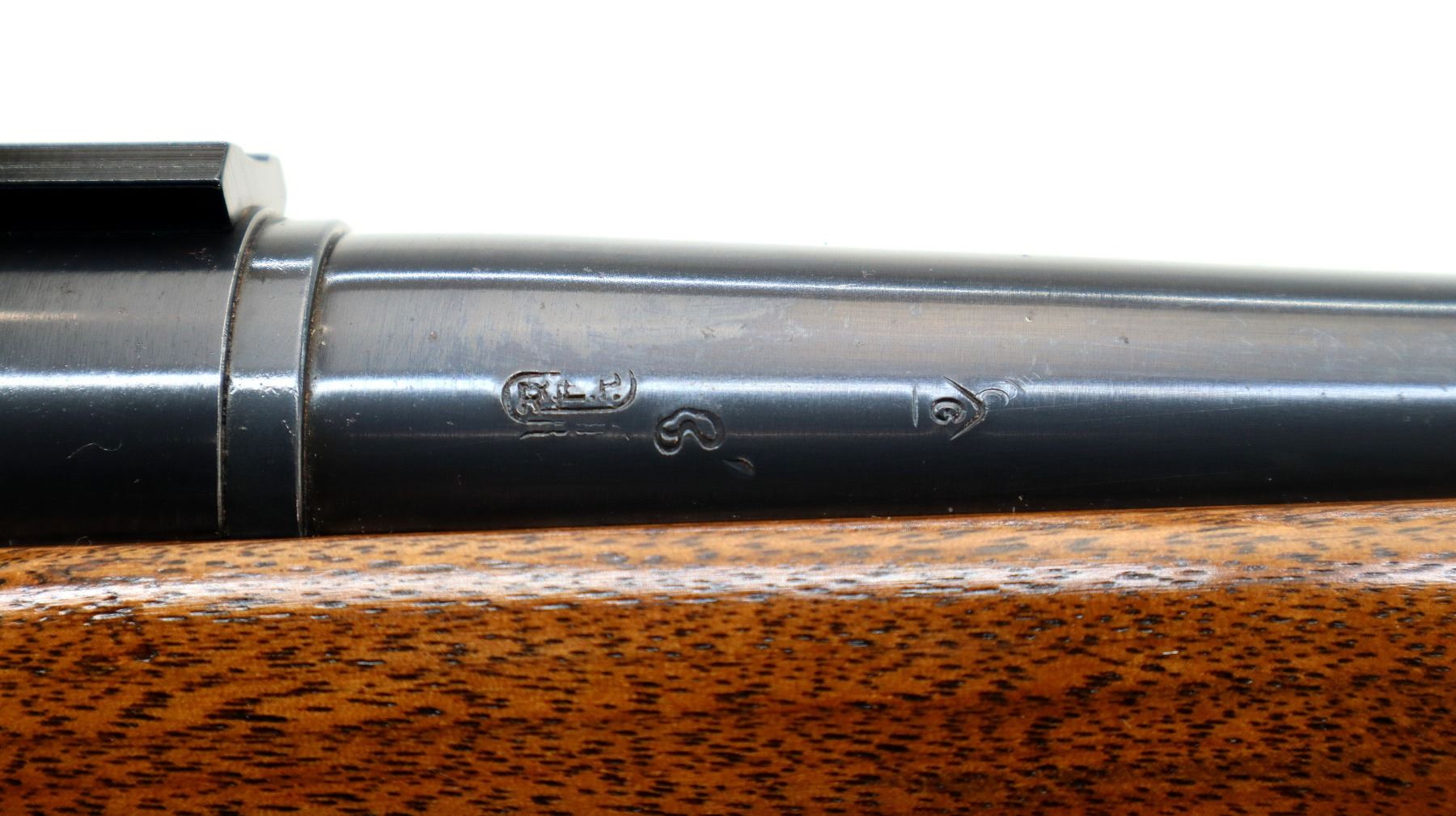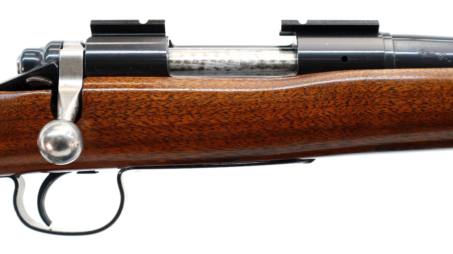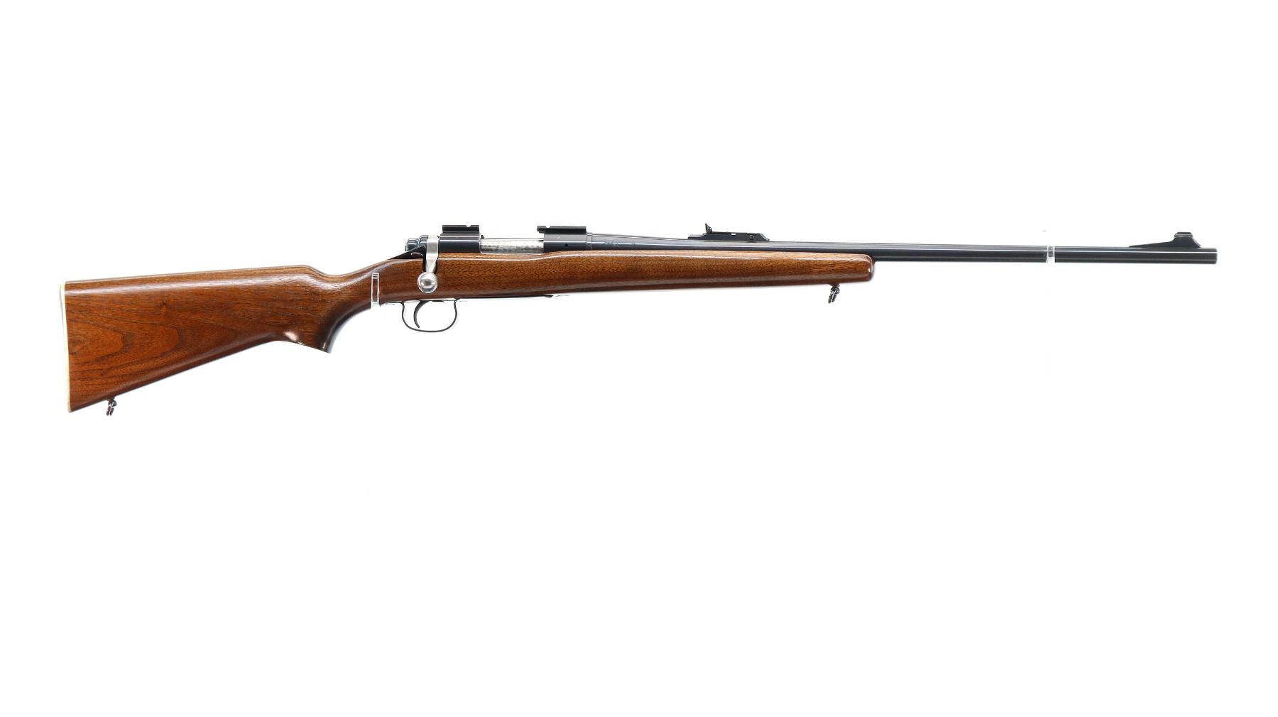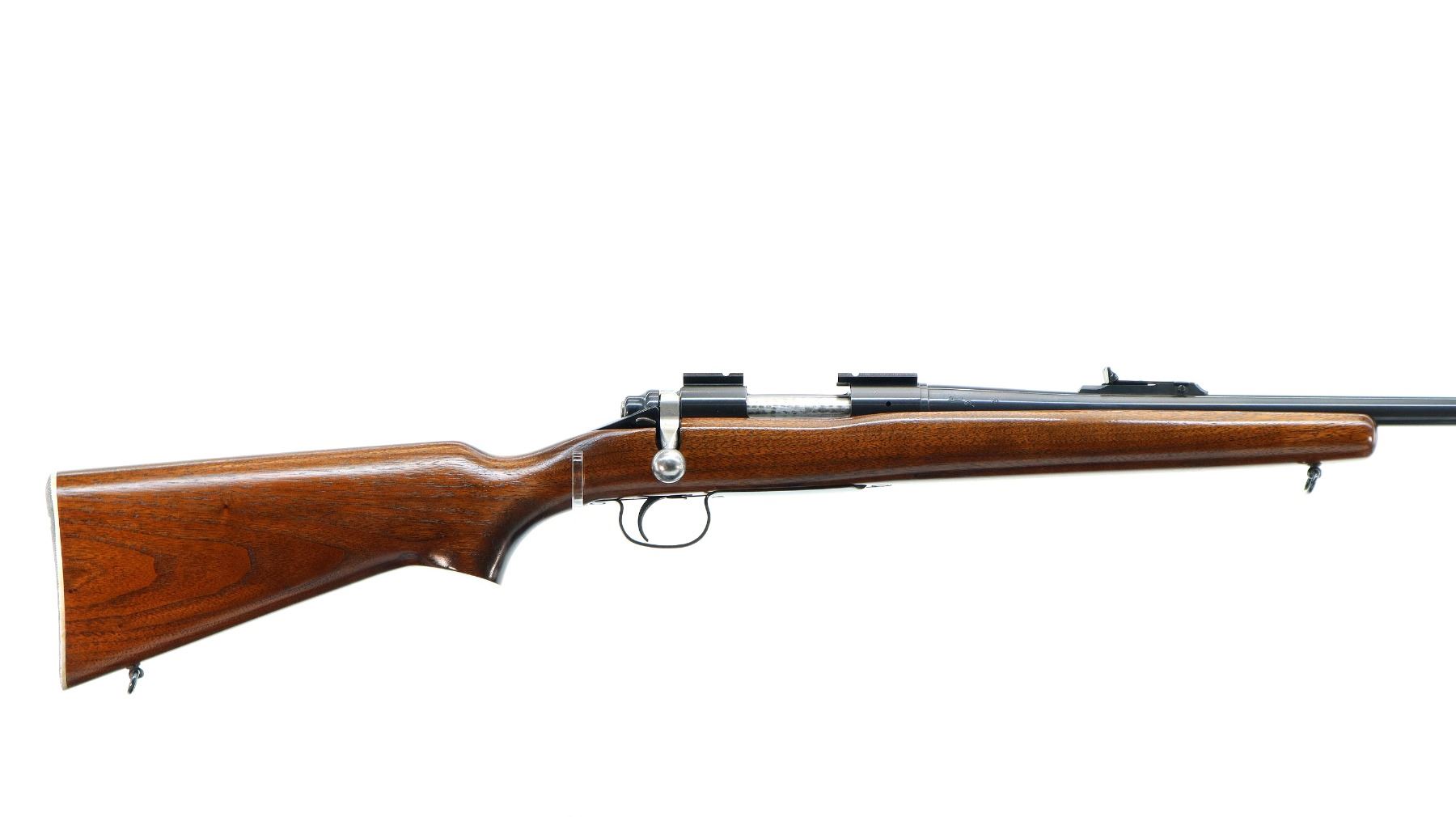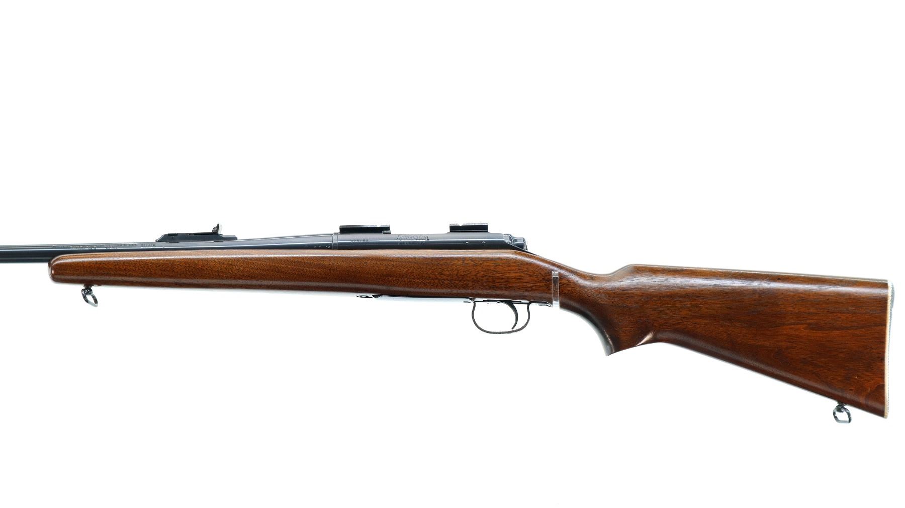Main Description: Blade front sight with ramp, adjustable u notched rear sight, blued finish, receiver drilled and tapped with two piece scope bases installed, jeweled bolt with smooth knob. One piece wood stock, pistol grip, checkered black polymer butt plate, small chip on edge of grip, sling swivels.