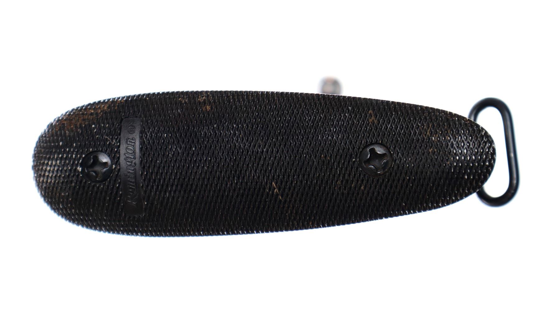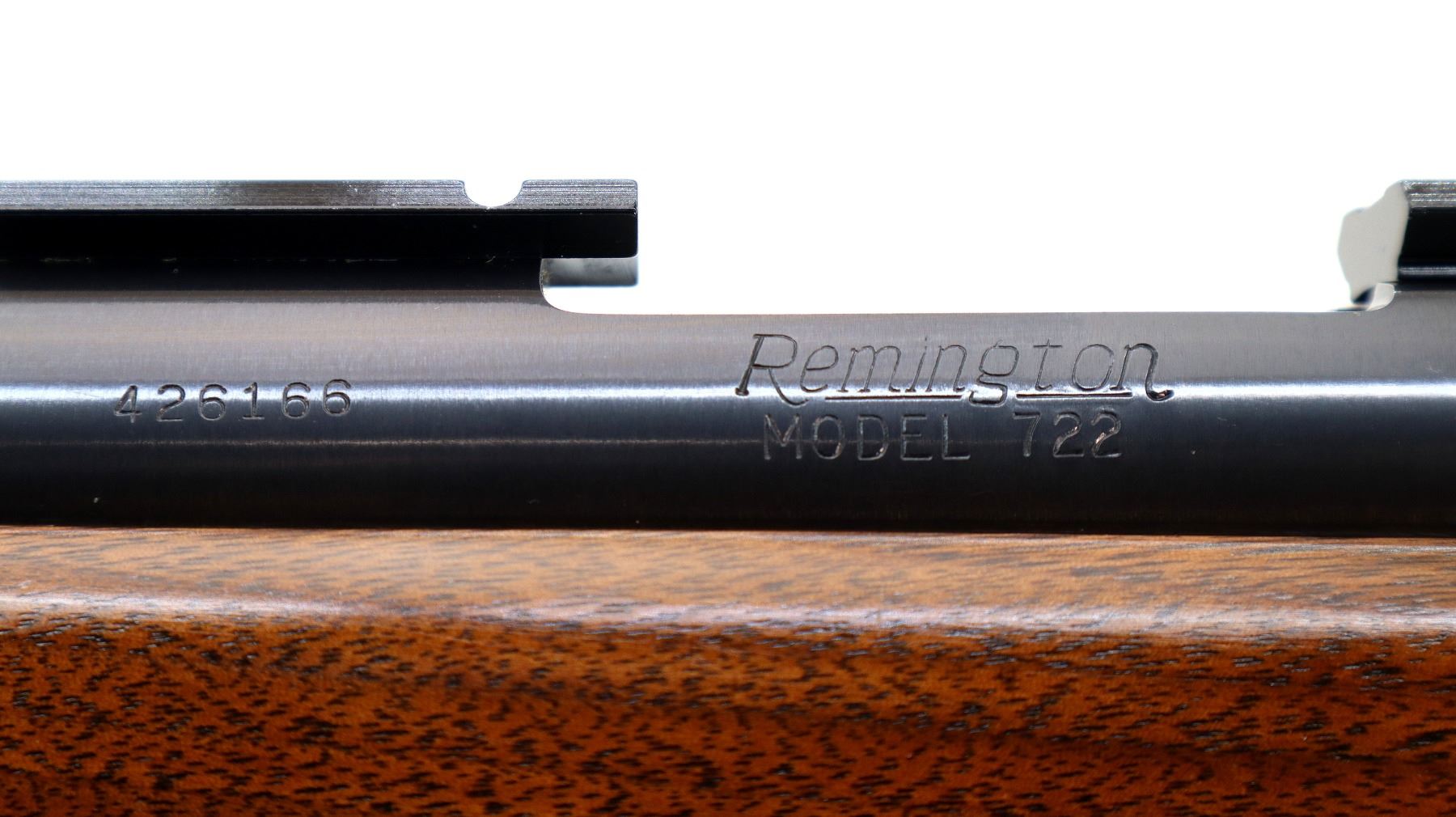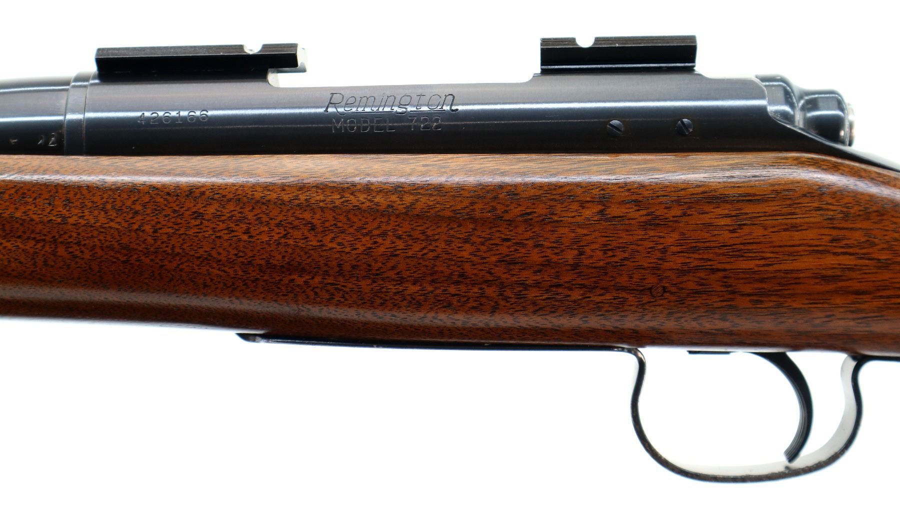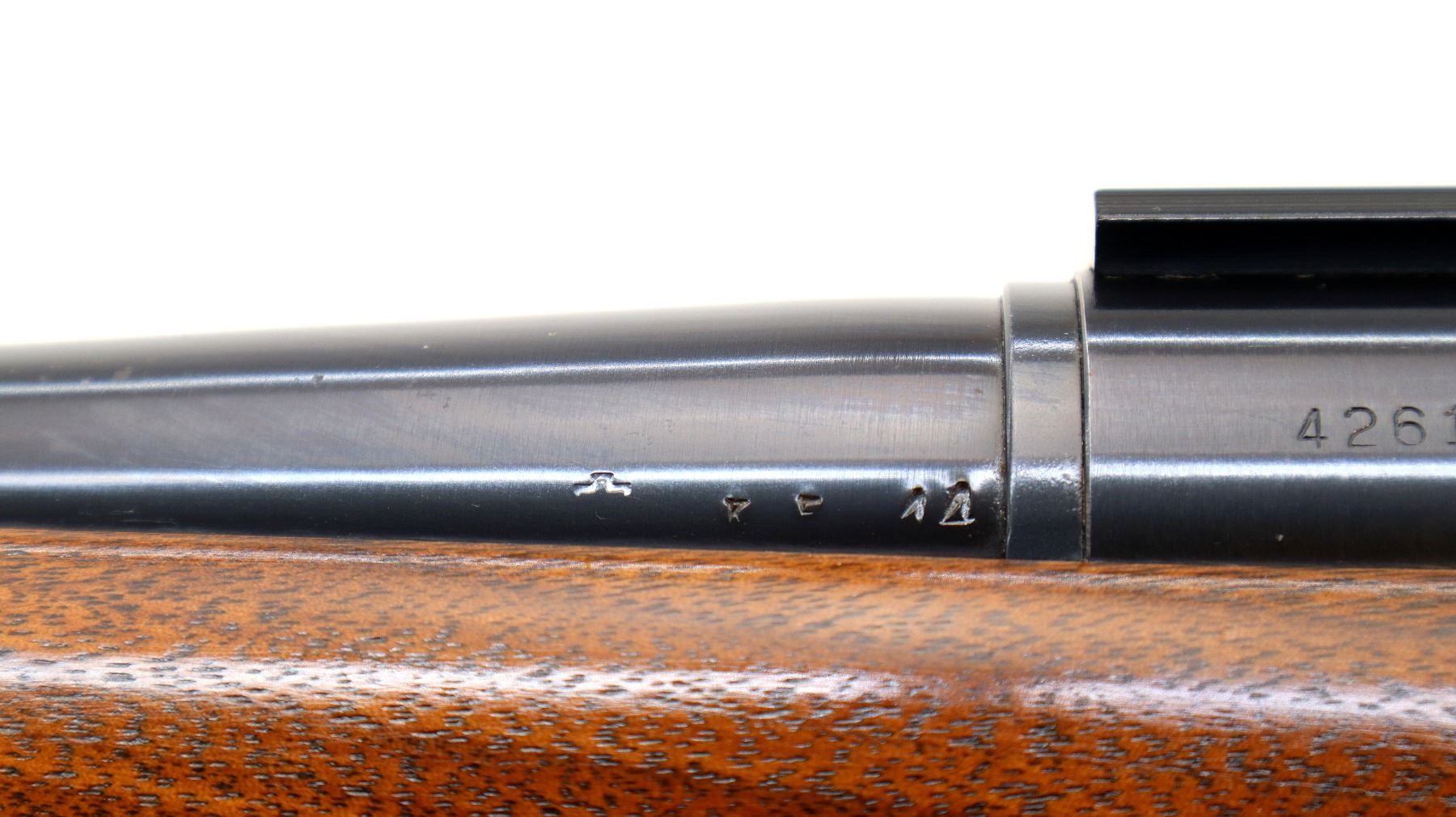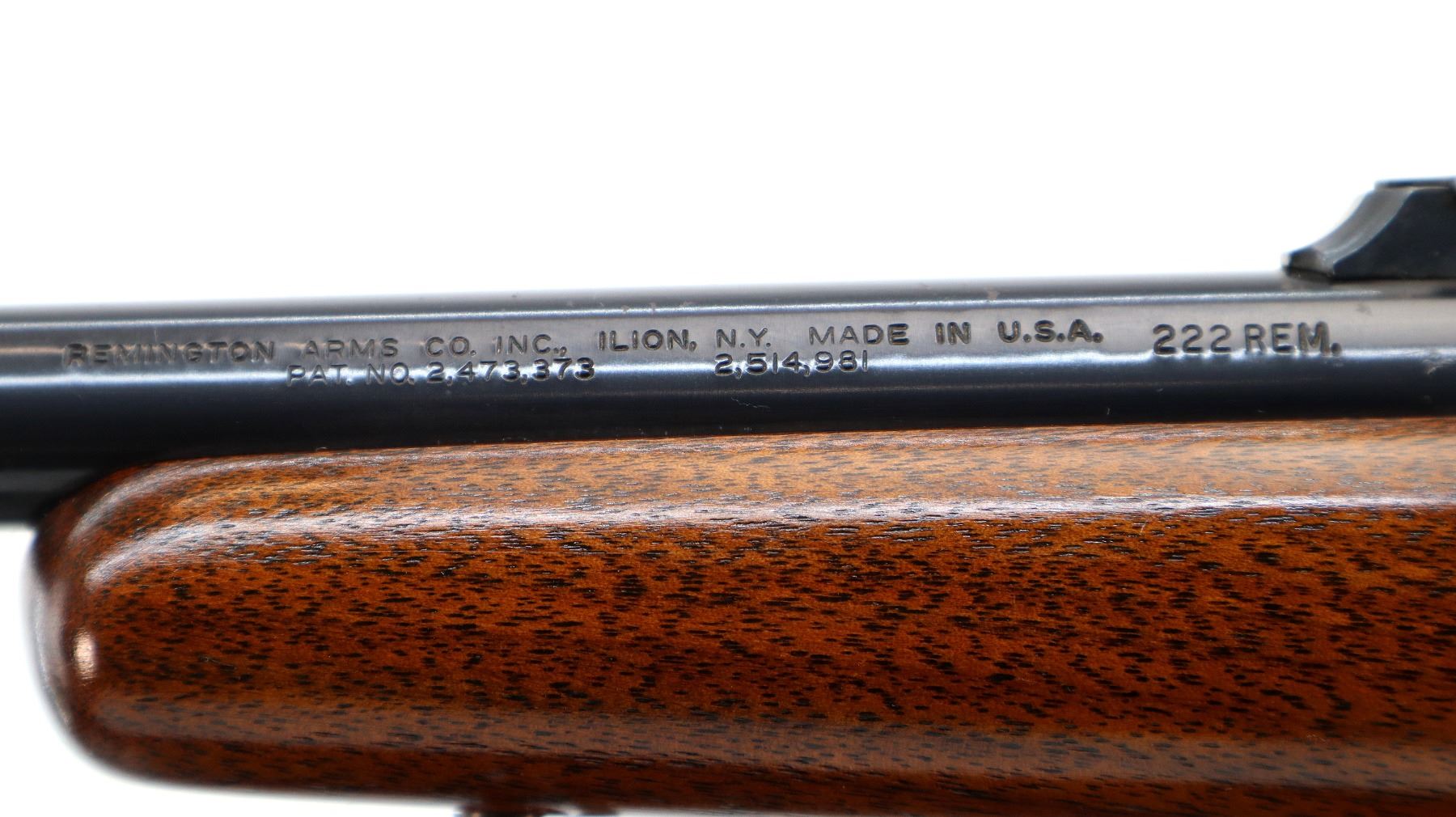 Main Description: Blade front sight with ramp, adjustable u notched rear sight, blued finish, receiver drilled and tapped with two piece scope bases installed, jeweled bolt with smooth knob. One piece wood stock, pistol grip, checkered black polymer butt plate, small chip on edge of grip, sling swivels.