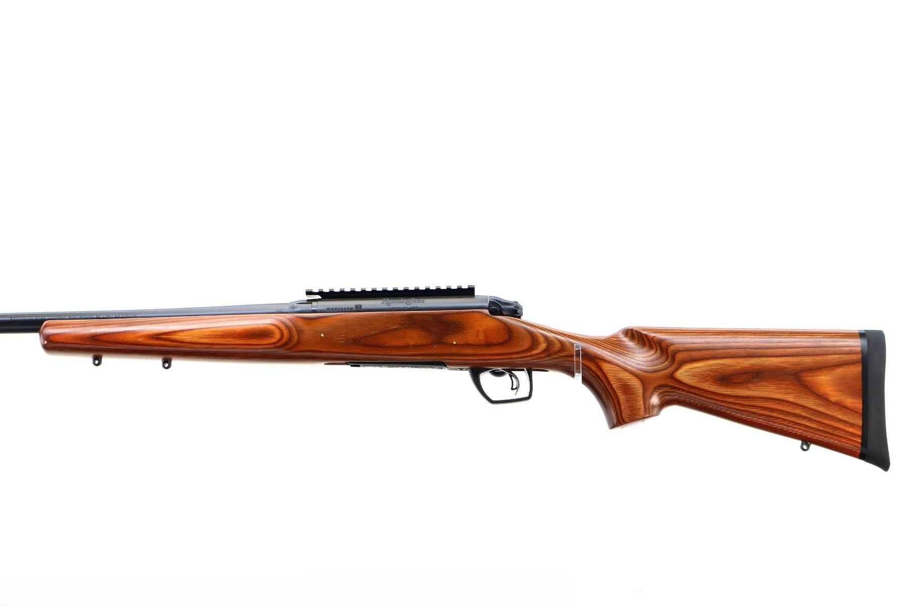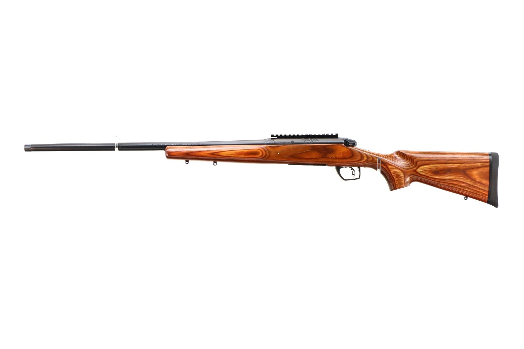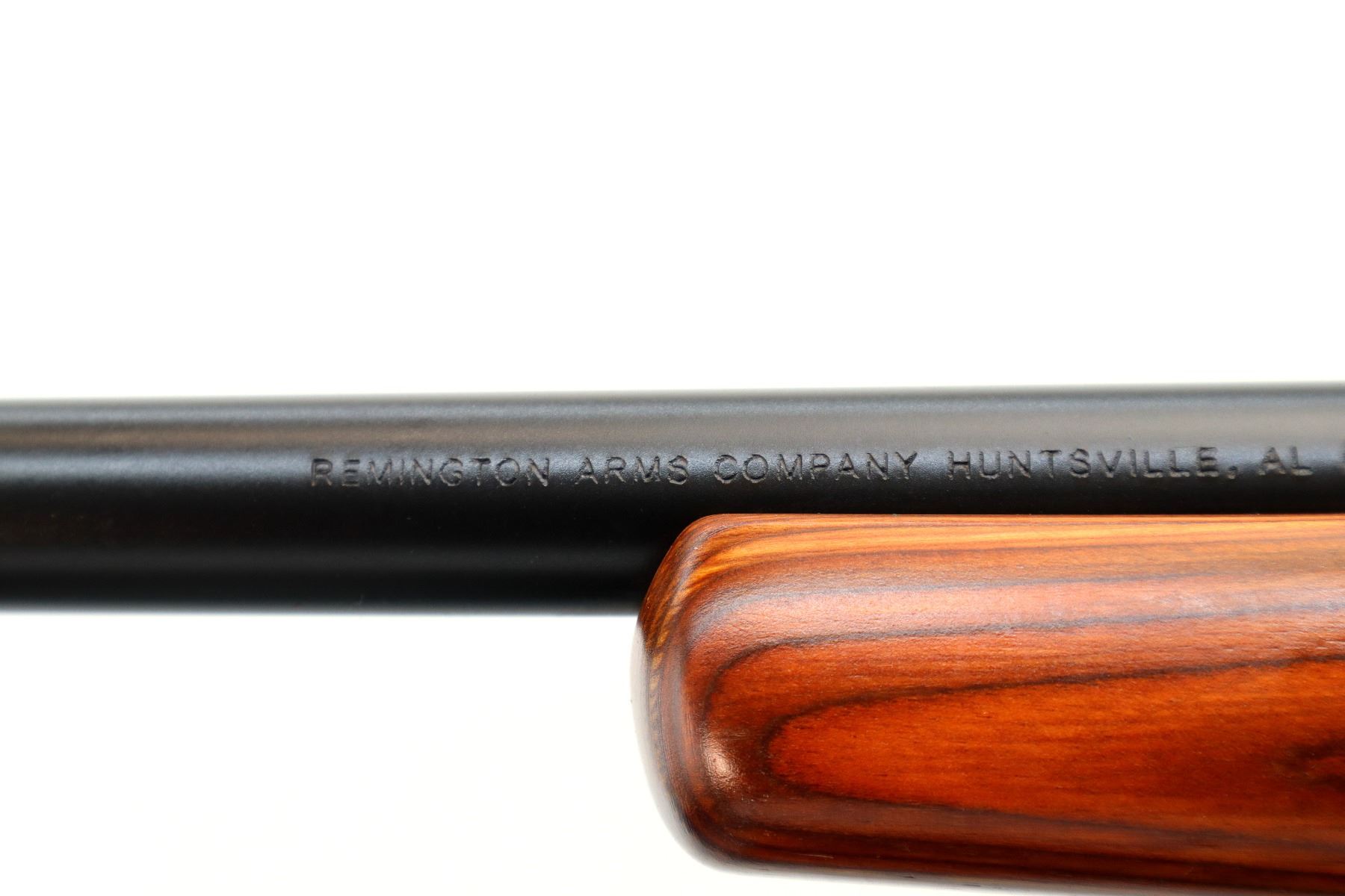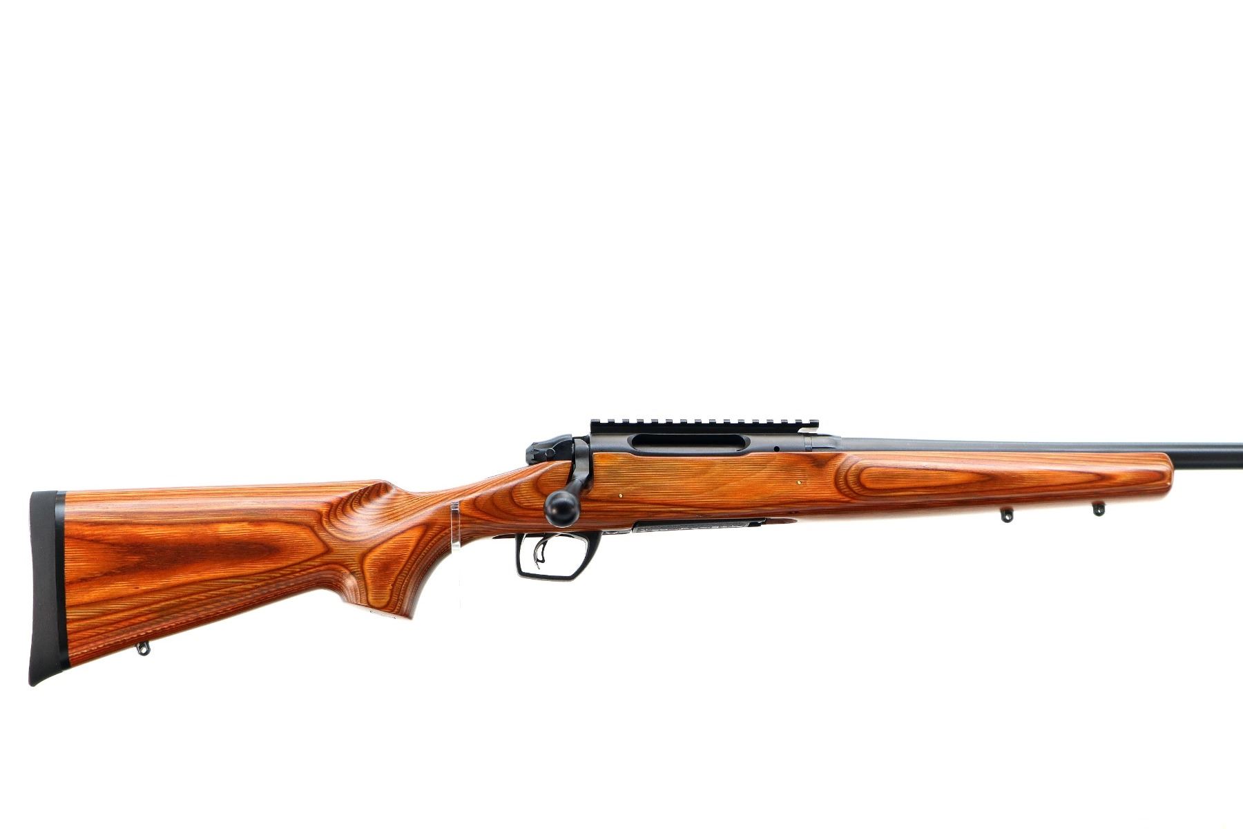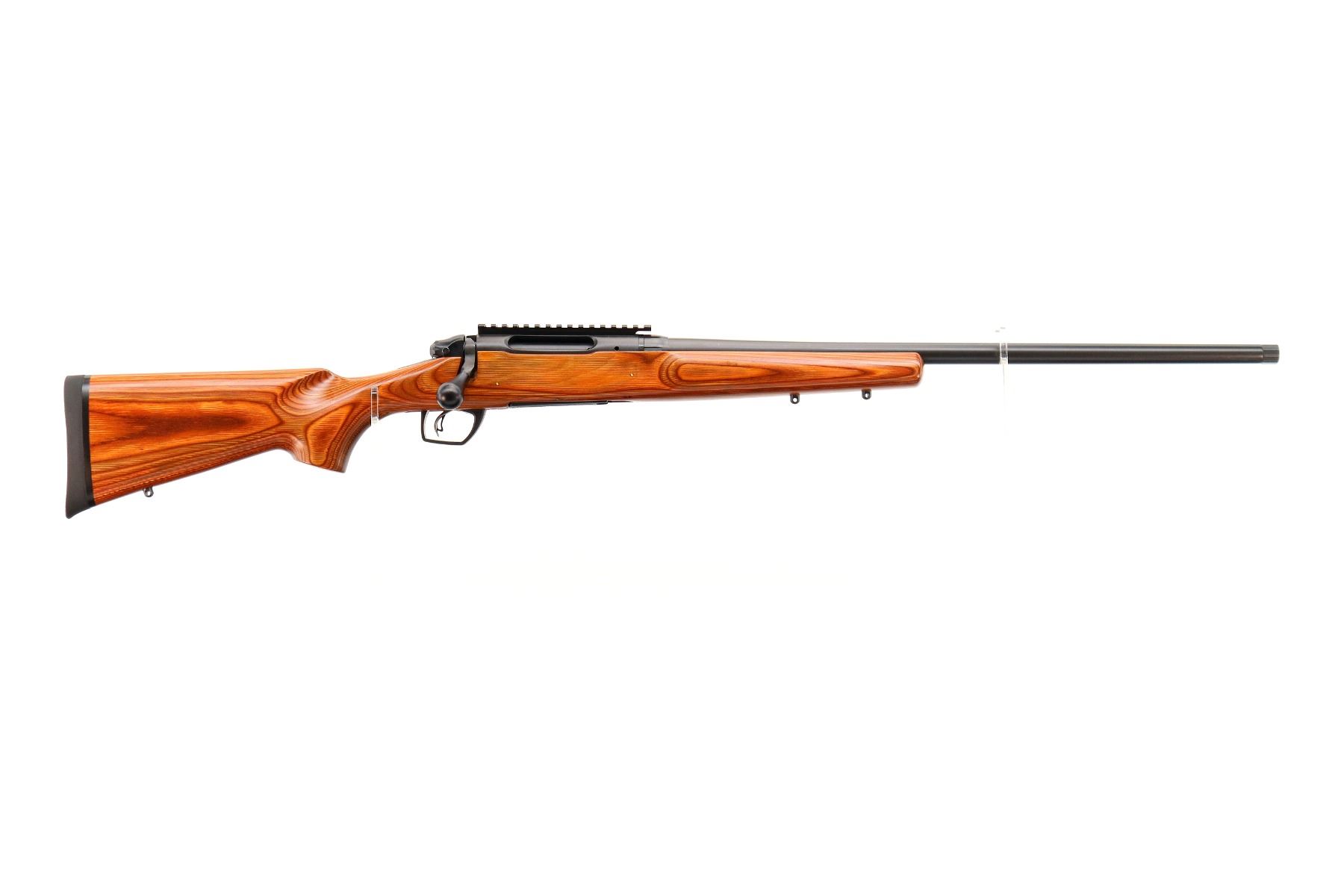 Main Description: No sights, Satin blued metal finish, heavy barrel threaded at muzzle with cap, receiver drilled and tapped with one piece scope base installed, large black polymer bolt knob. One piece brown laminate wood stock, wide forearm, pistol grip, black rubber recoil pad, 13.5" LOP, three swivel studs.