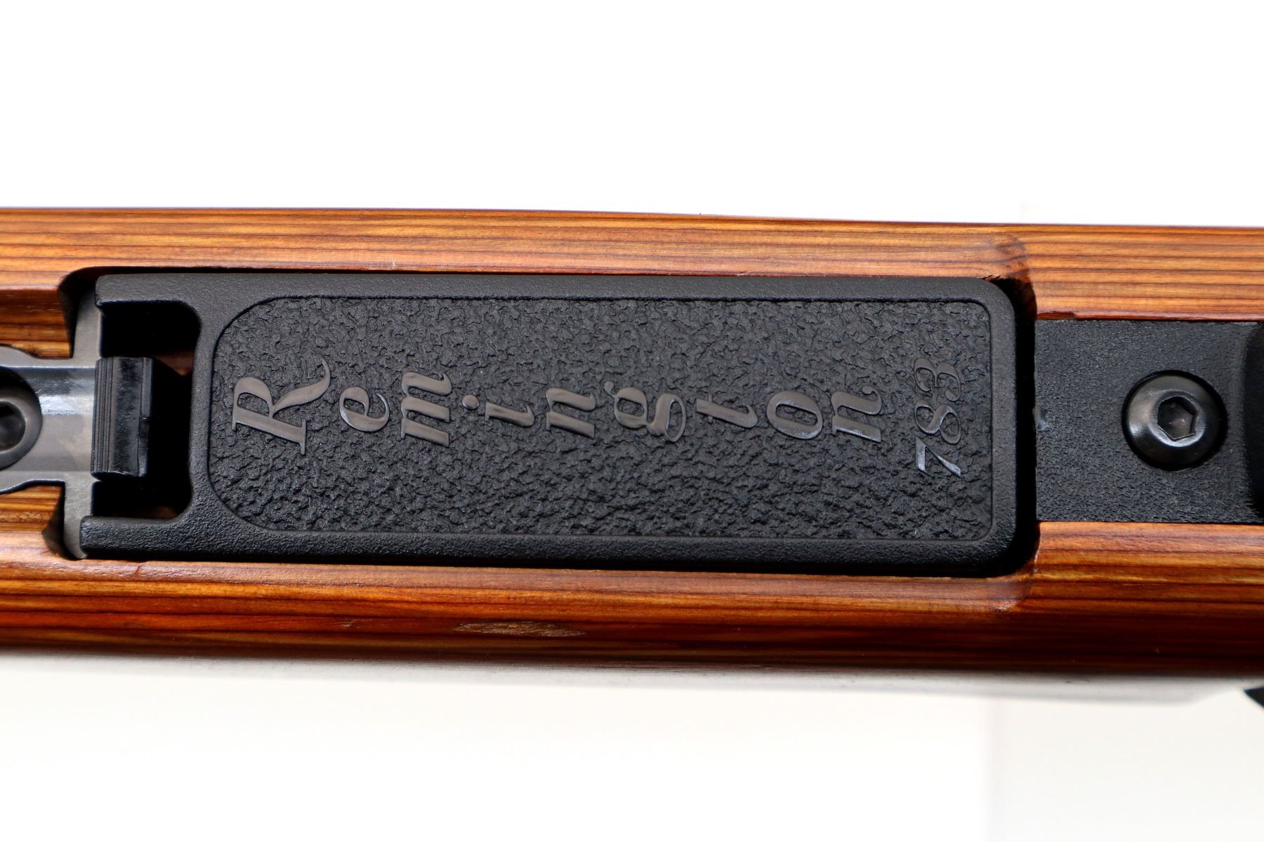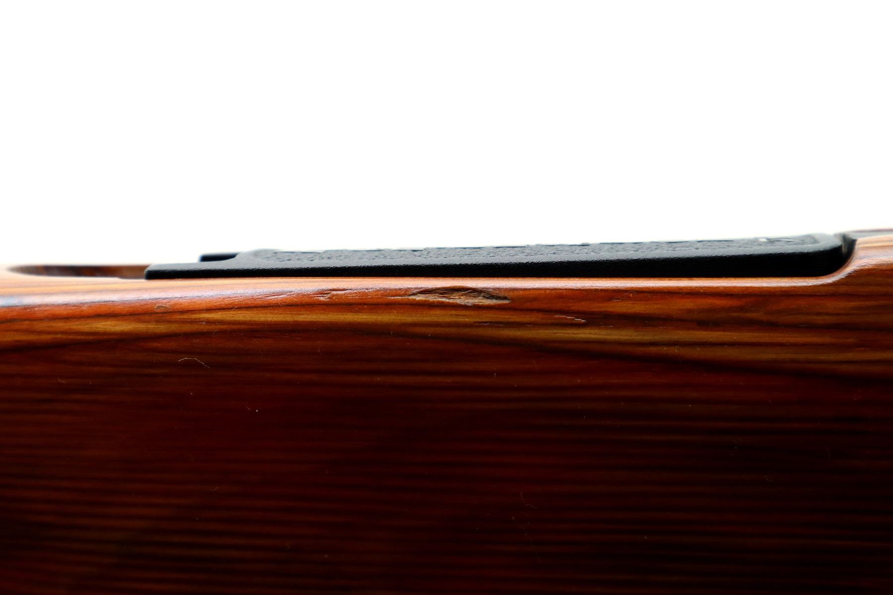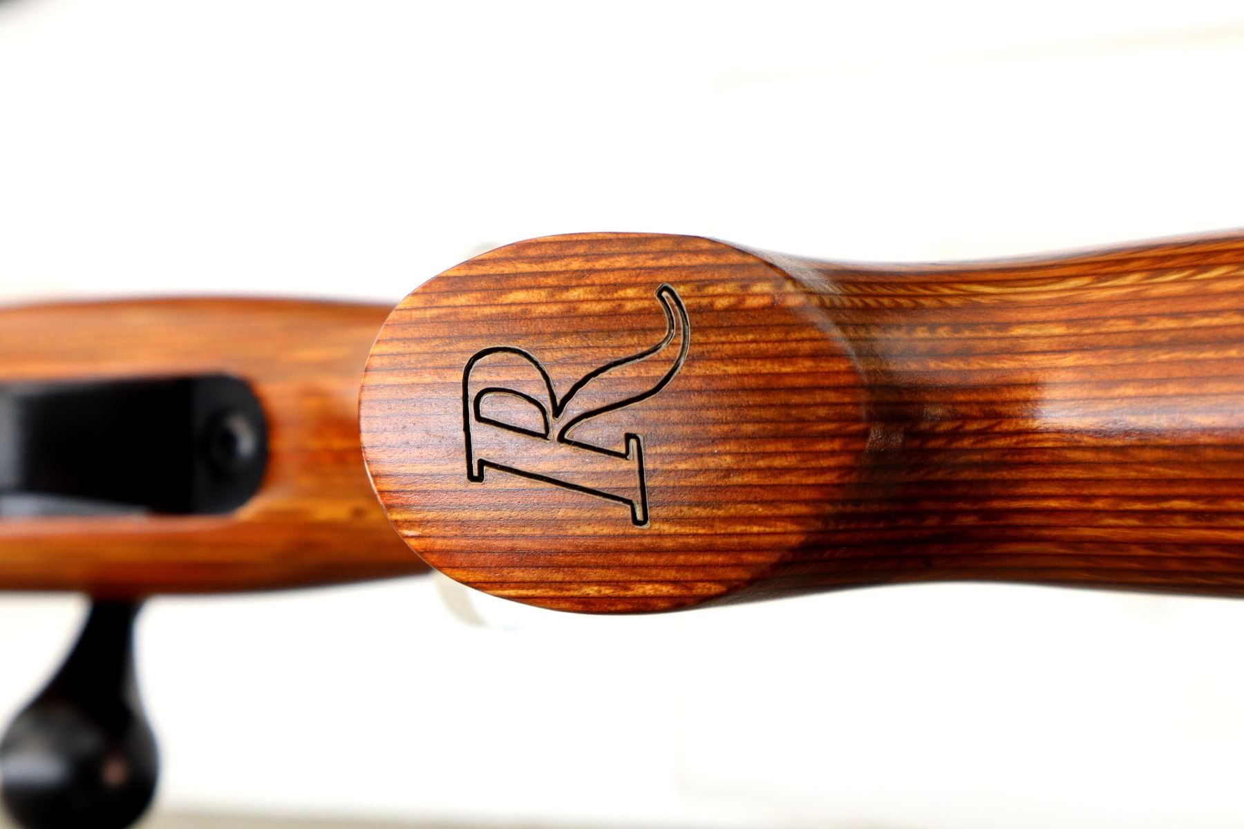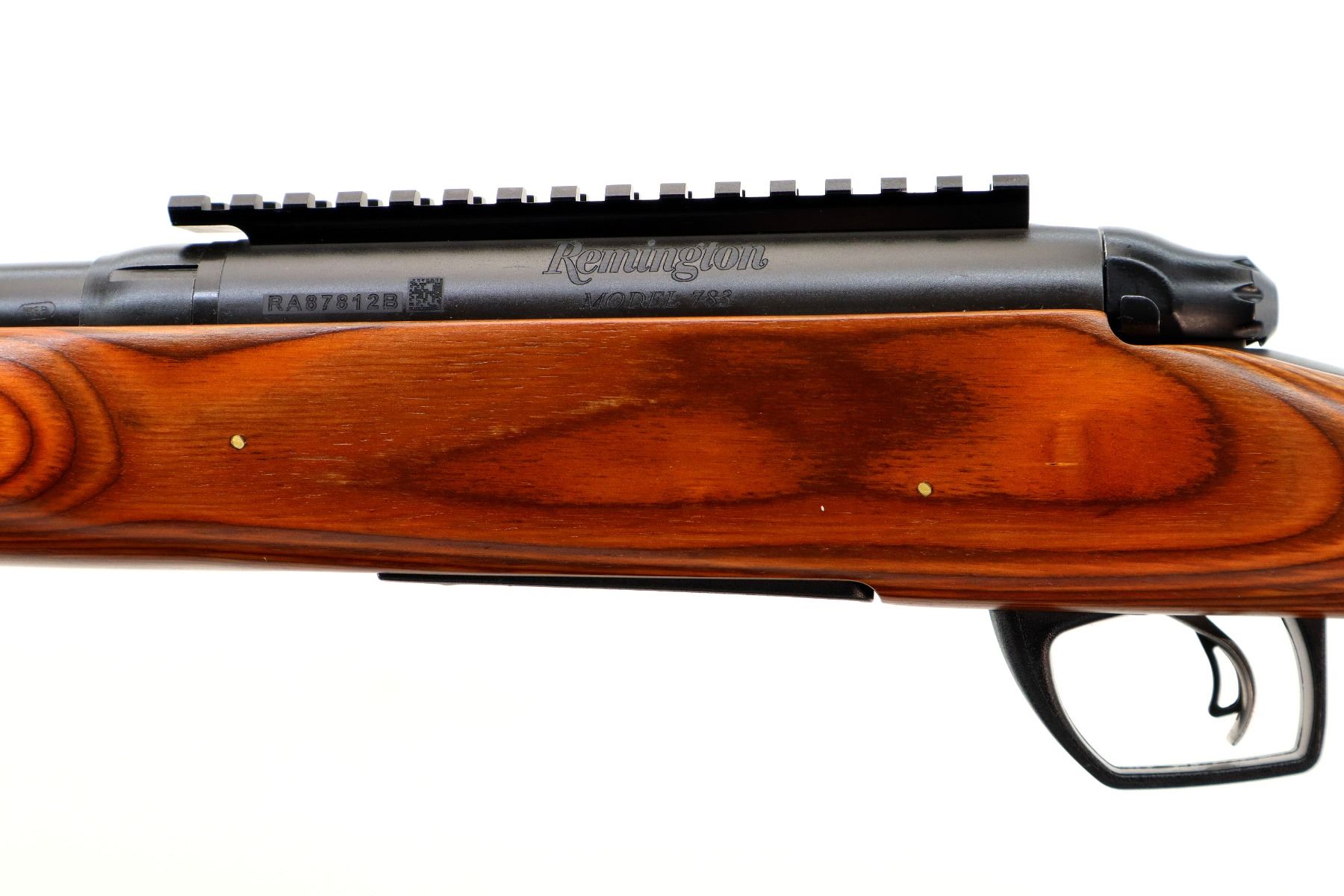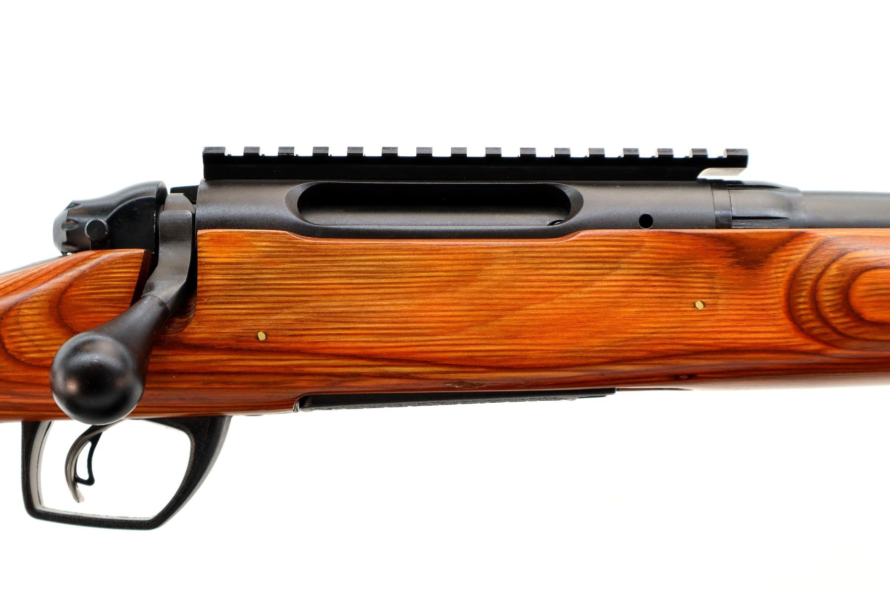 Main Description: No sights, Satin blued metal finish, heavy barrel threaded at muzzle with cap, receiver drilled and tapped with one piece scope base installed, large black polymer bolt knob. One piece brown laminate wood stock, wide forearm, pistol grip, black rubber recoil pad, 13.5" LOP, three swivel studs.