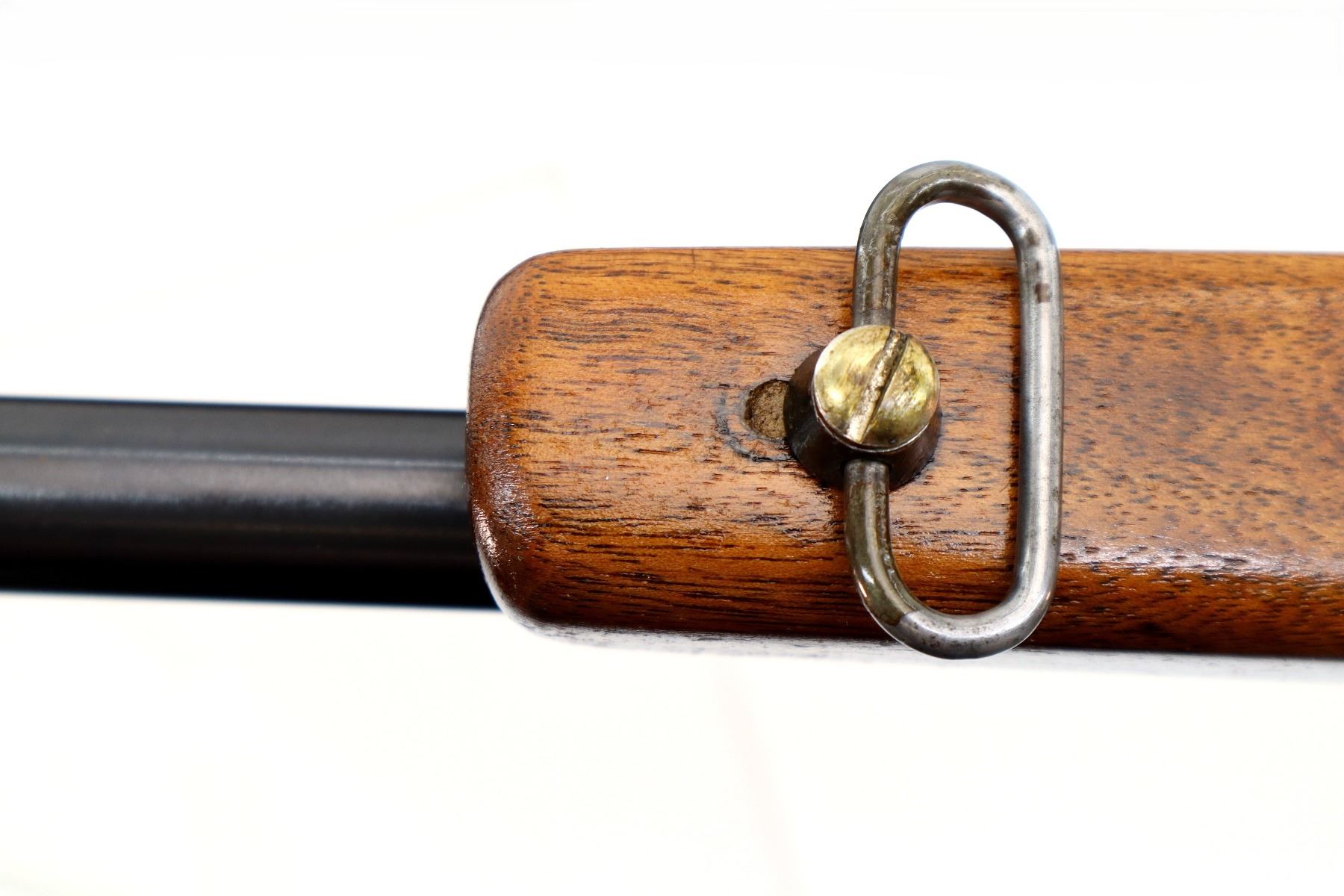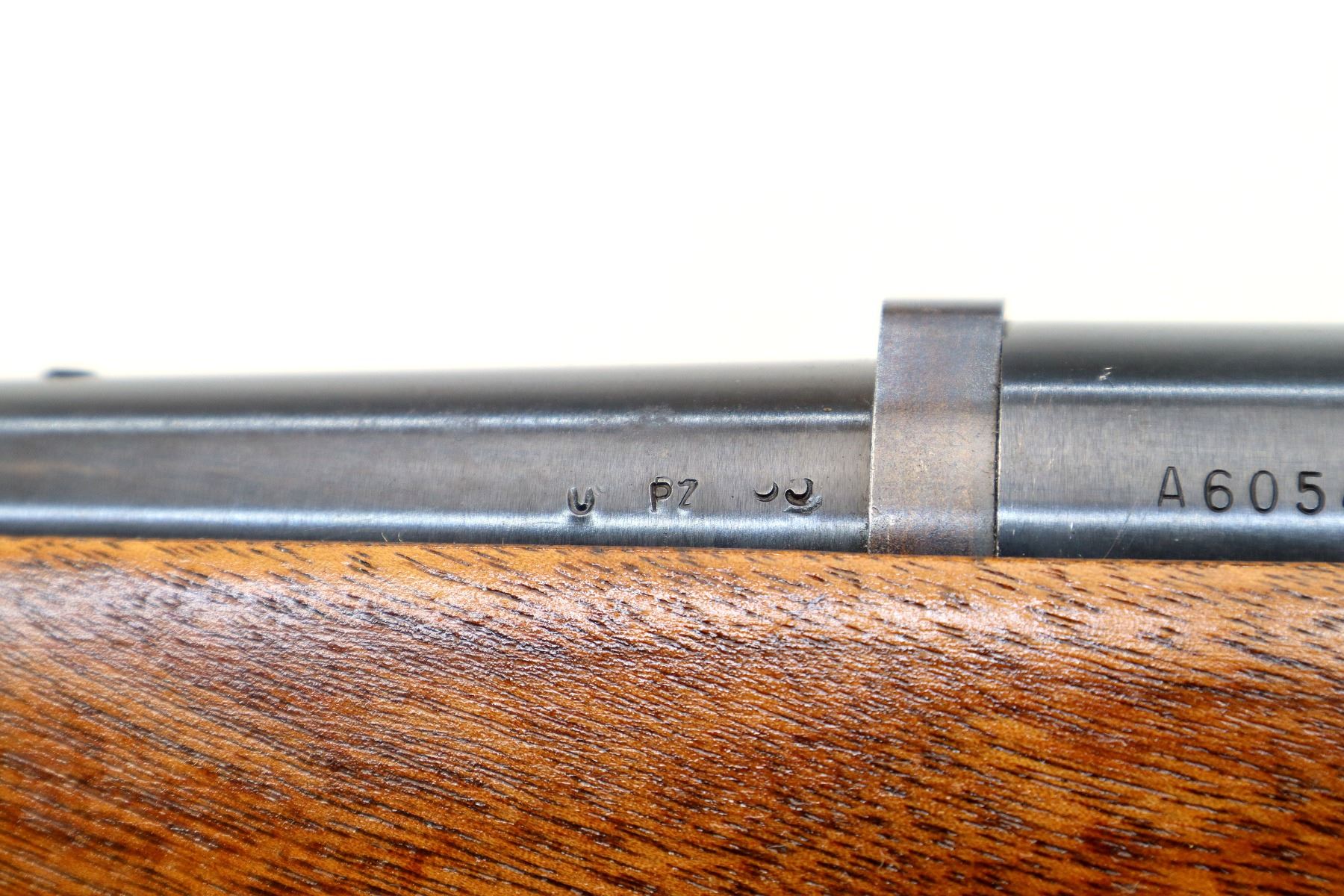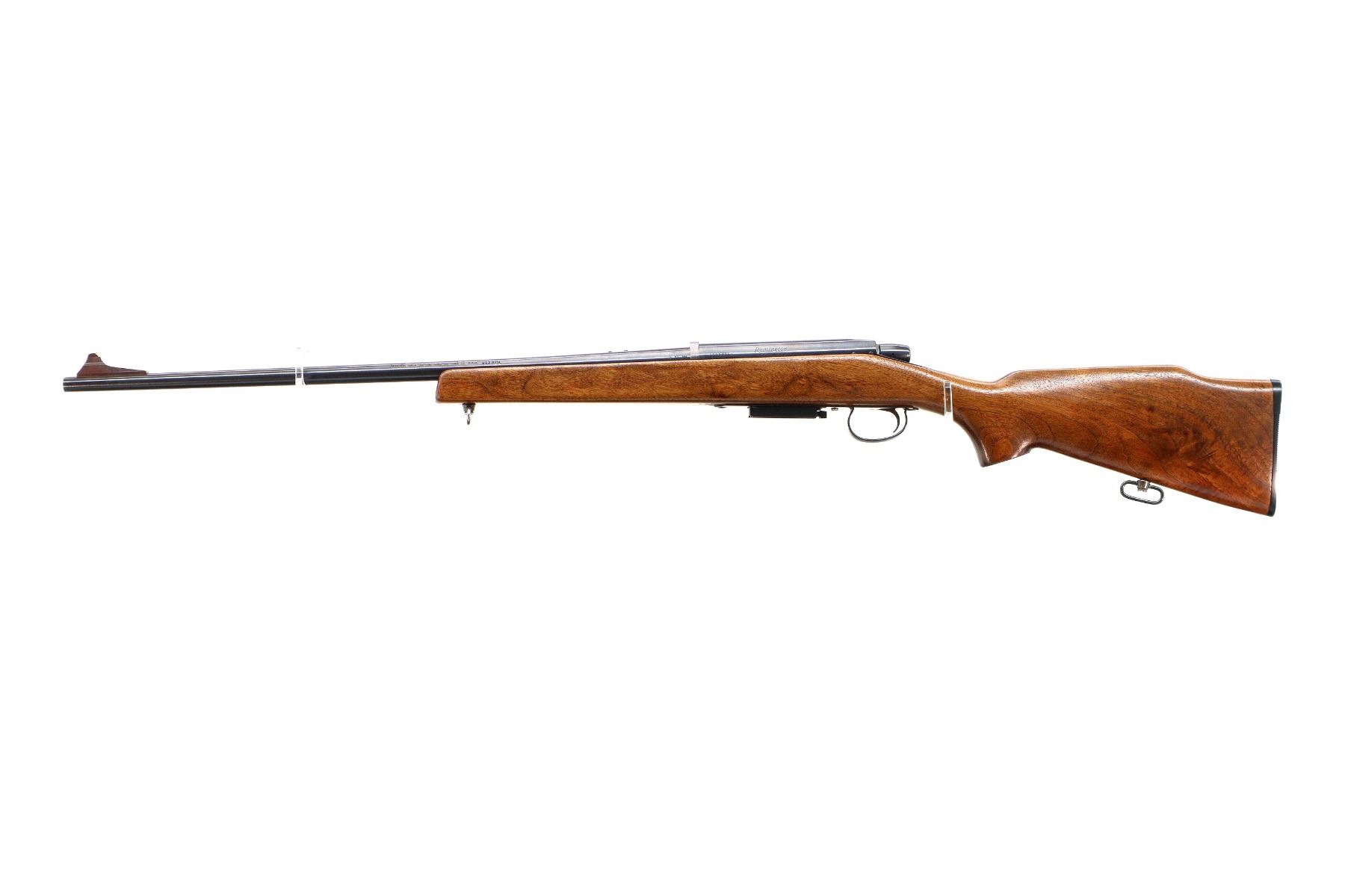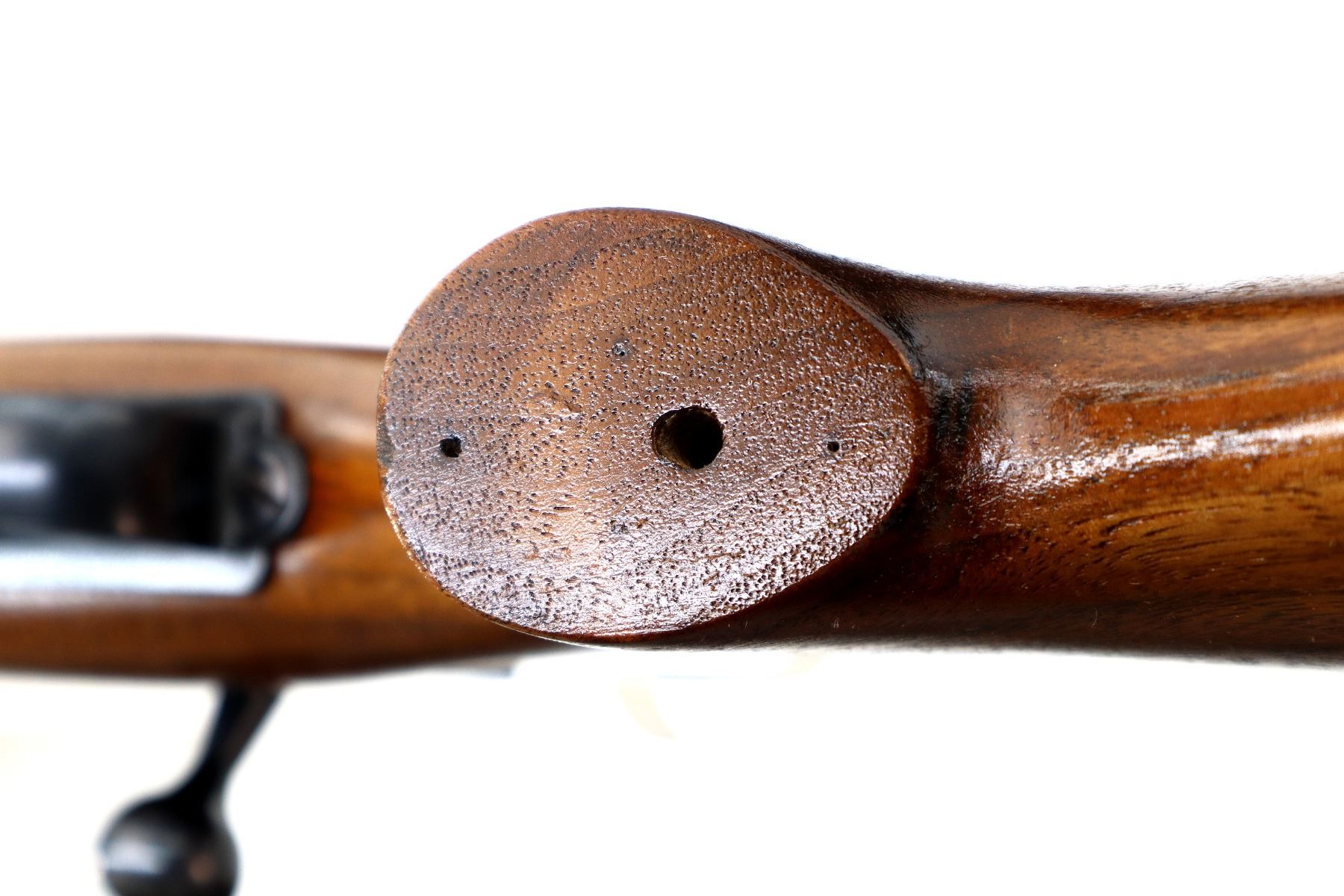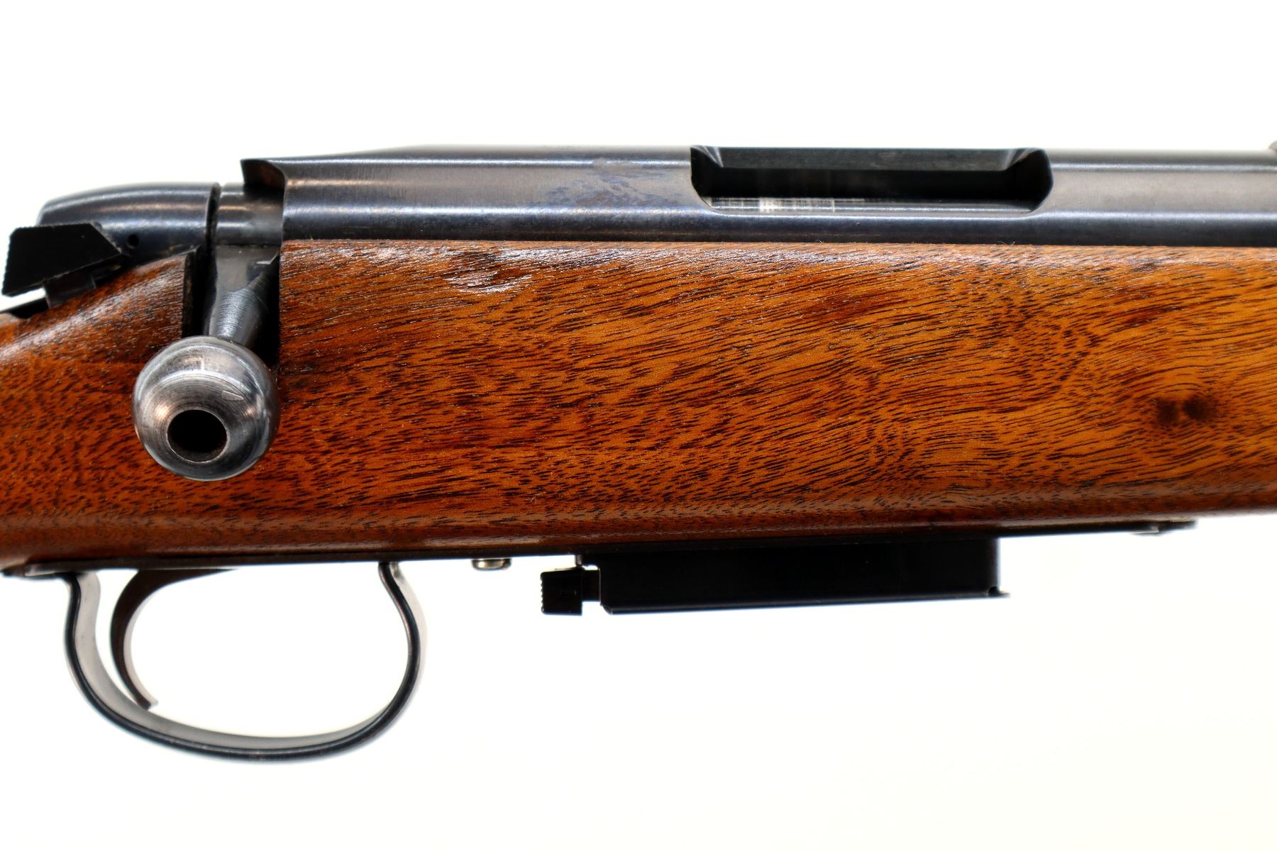 Main Description: Blade front sight with ramp, missing rear sight threaded holes present filled with plug screws, blued finish, receiver drilled and tapped with no plug screws installed, smooth bolt knob. One piece wood stock, pistol grip, raised comb, grooved black polymer butt plate, missing grip cap hole is present, sling swivels.