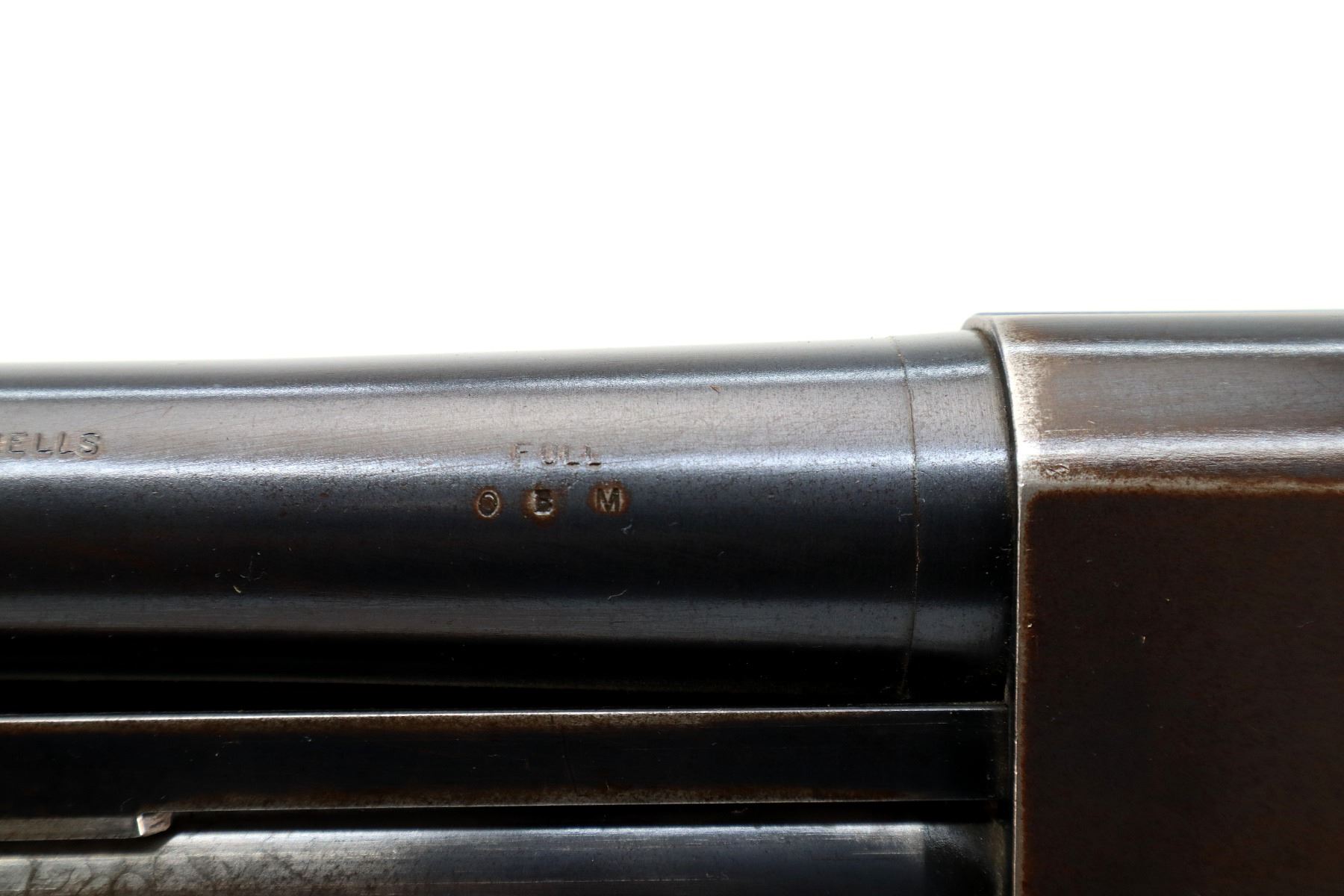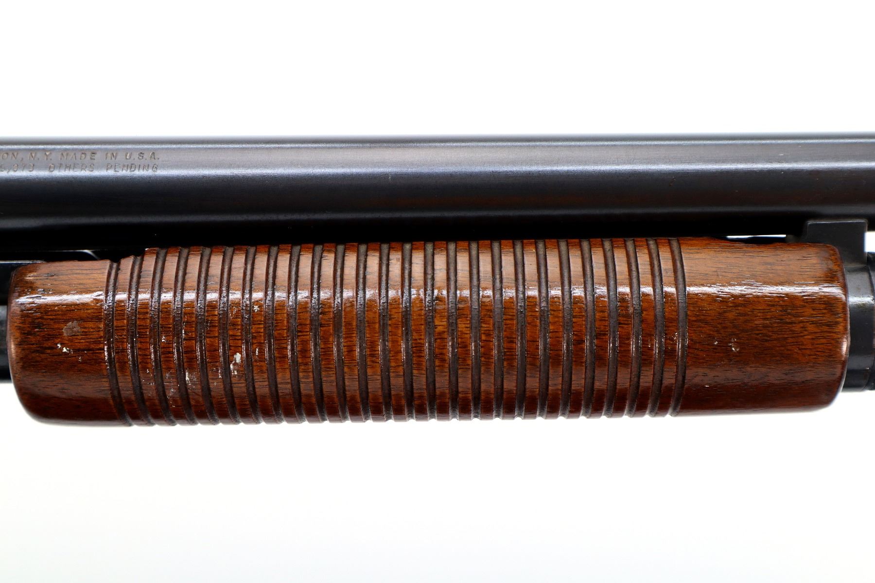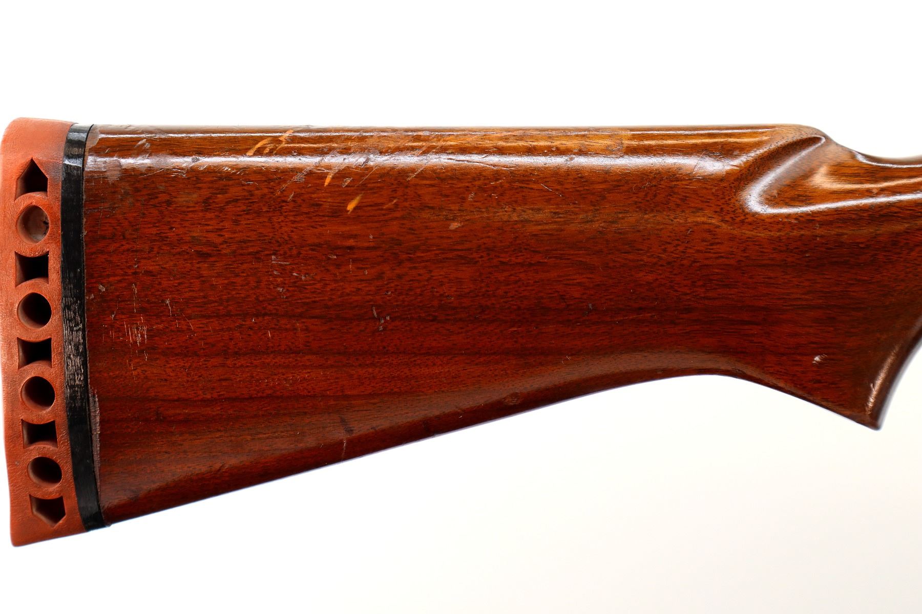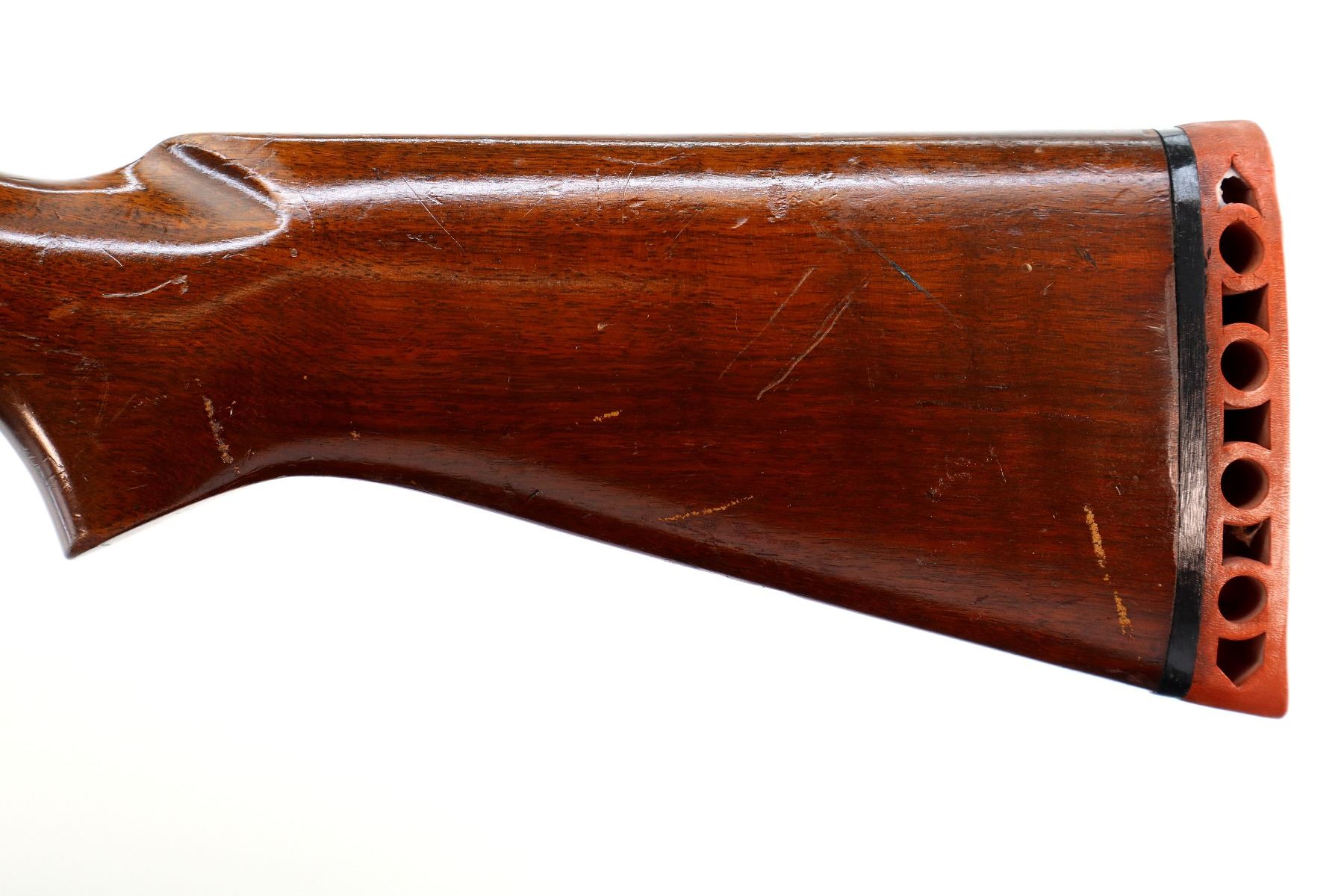 Main Description: Silver bead, round barrel. Two piece wood stocks, grooved forearm, pistol grip, chipped and cracked behind receiver, red vented rubber recoil pad, 13.5" LOP.