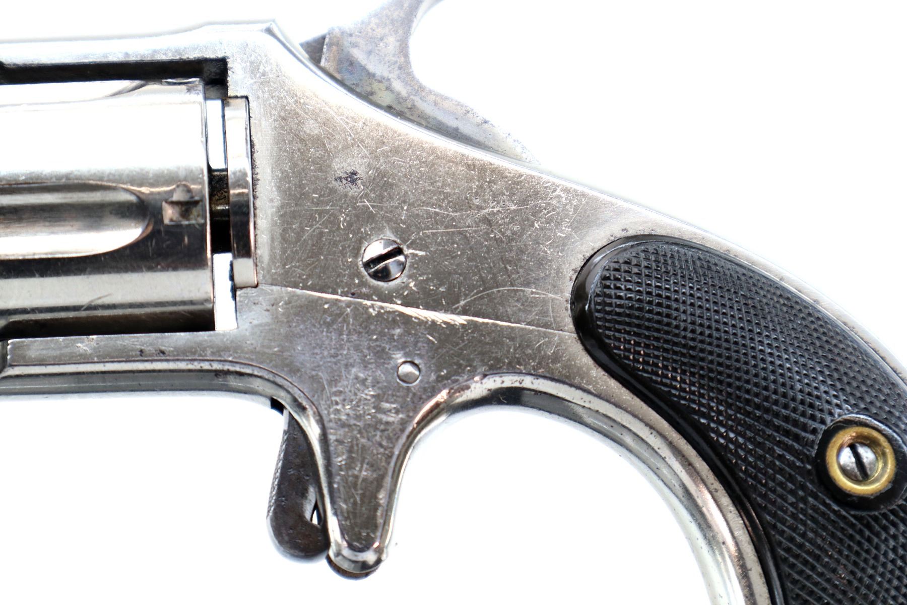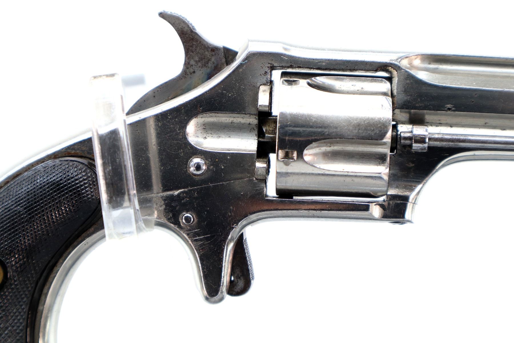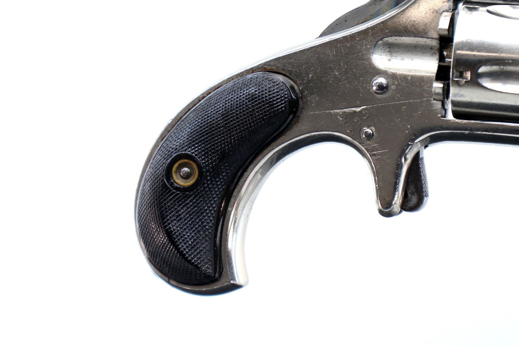 Main Description: Functions mechanically as designed. Blade front sight, fixed u notched rear sight, flat sided barrel with solid rib, Nickel finish, fluted cylinder, checkered spur hammer and trigger. Two piece checkered black polymer grips , ejector rod on right side of barrel.