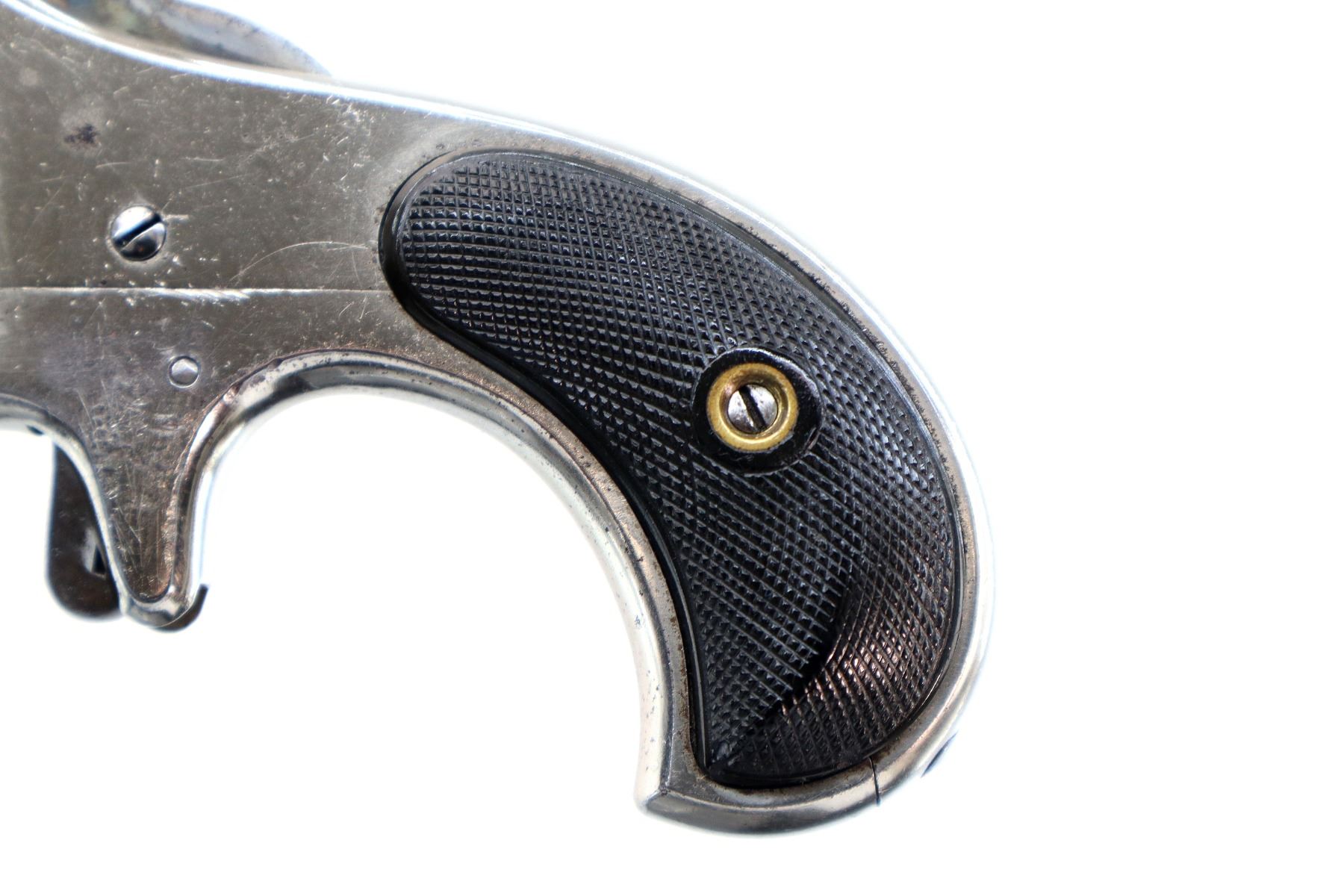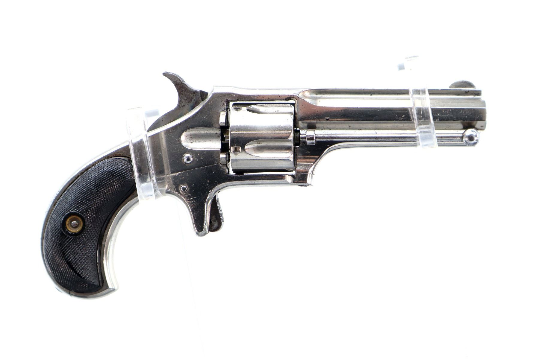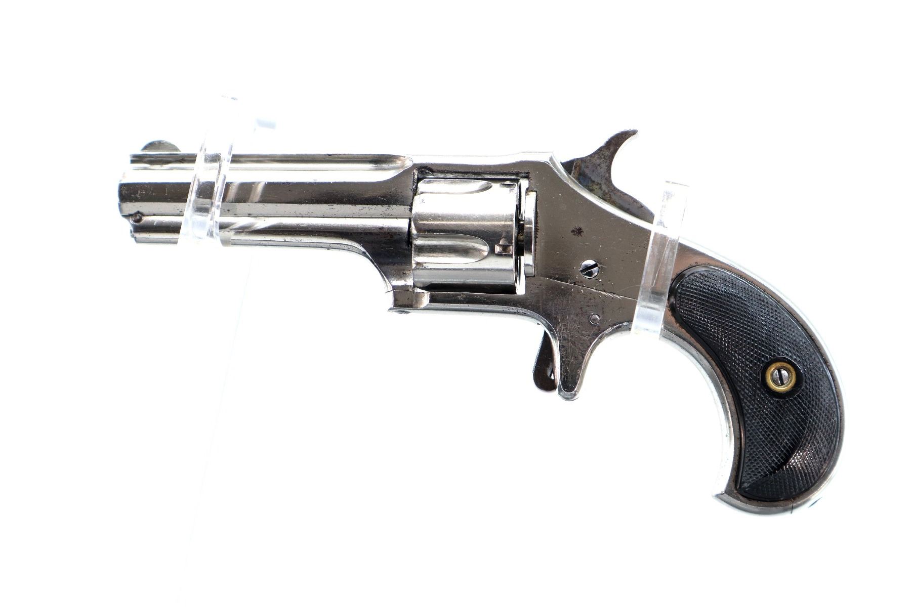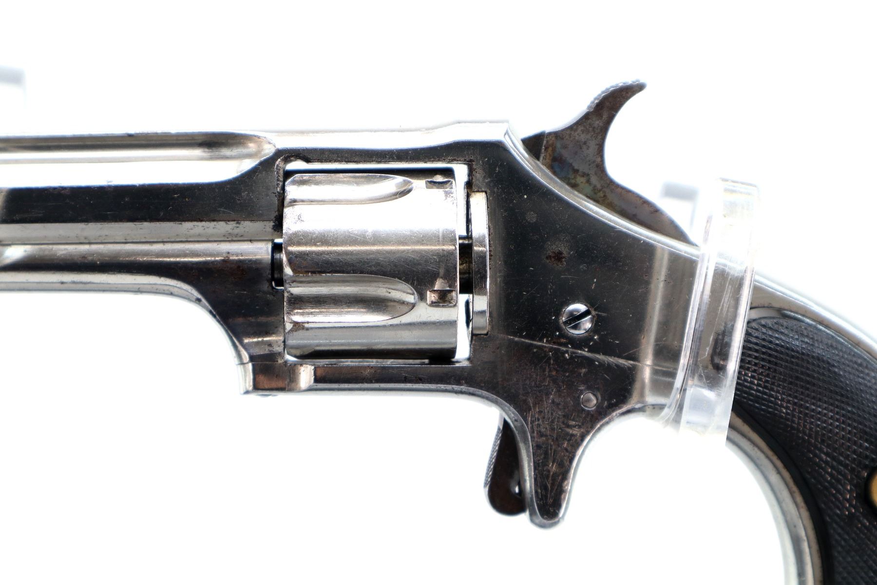 Main Description: Functions mechanically as designed. Blade front sight, fixed u notched rear sight, flat sided barrel with solid rib, Nickel finish, fluted cylinder, checkered spur hammer and trigger. Two piece checkered black polymer grips , ejector rod on right side of barrel.