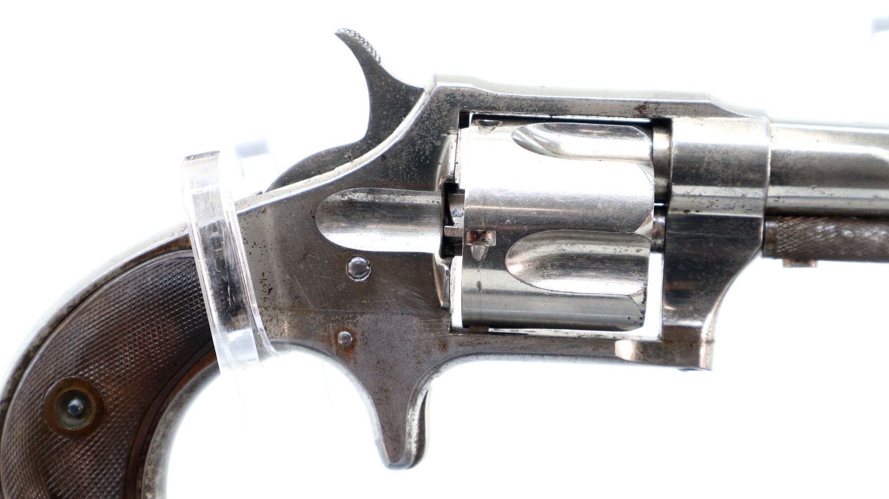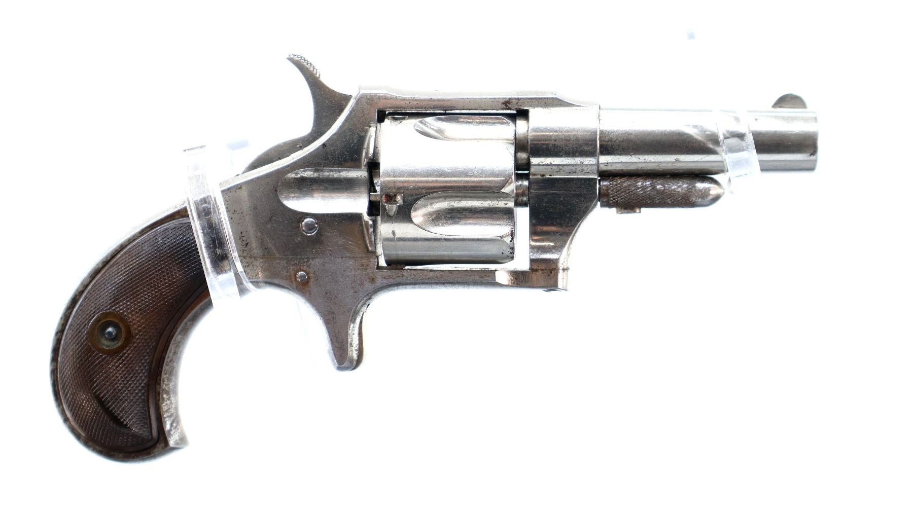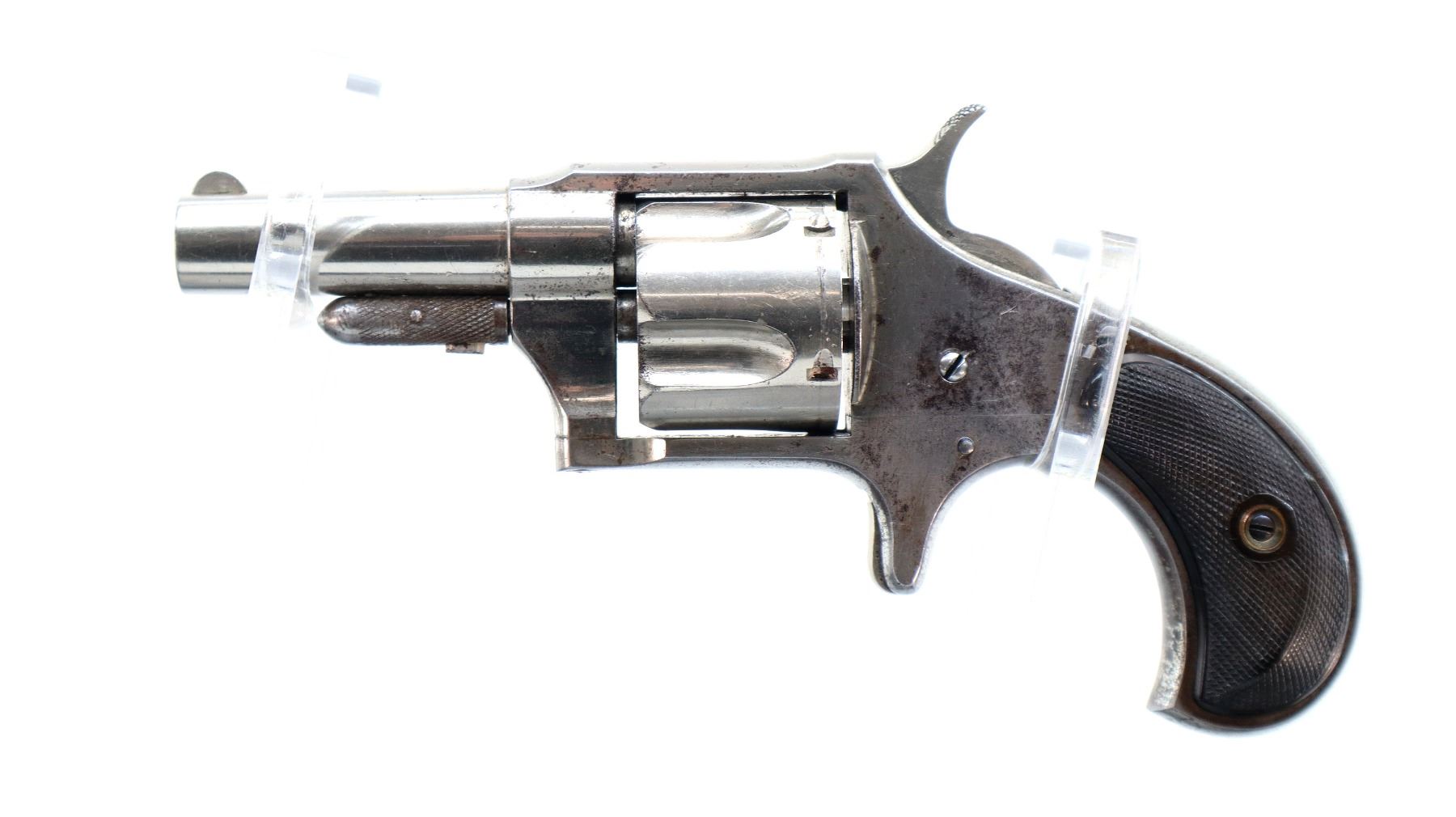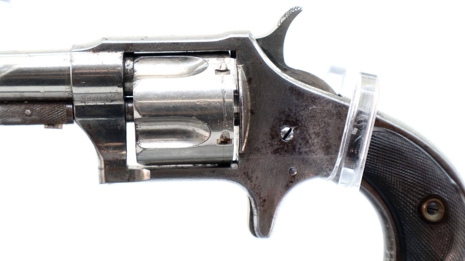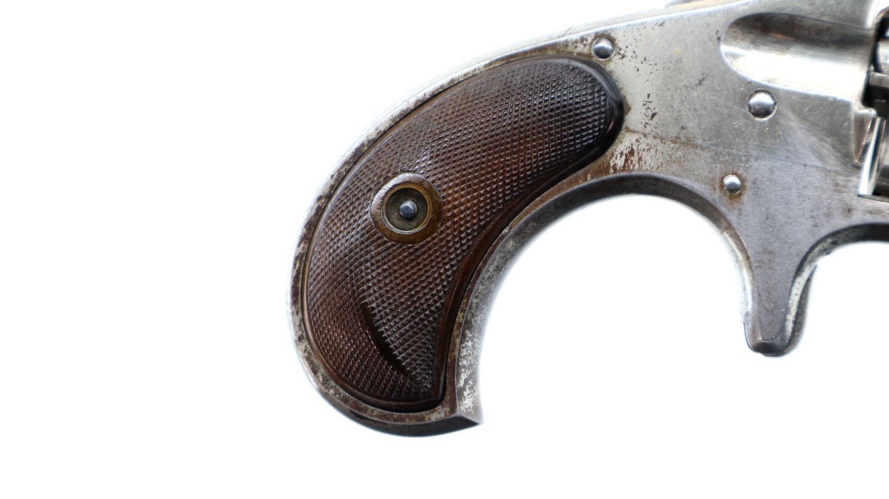 Main Description: Functions mechanically as designed. Blade front sight, fixed u notched rear sight, Nickel finish, fluted cylinder, checkered spur hammer and smooth trigger. Two piece checkered brown polymer grips, checkered cylinder pin.