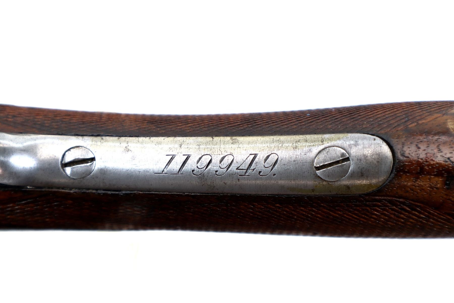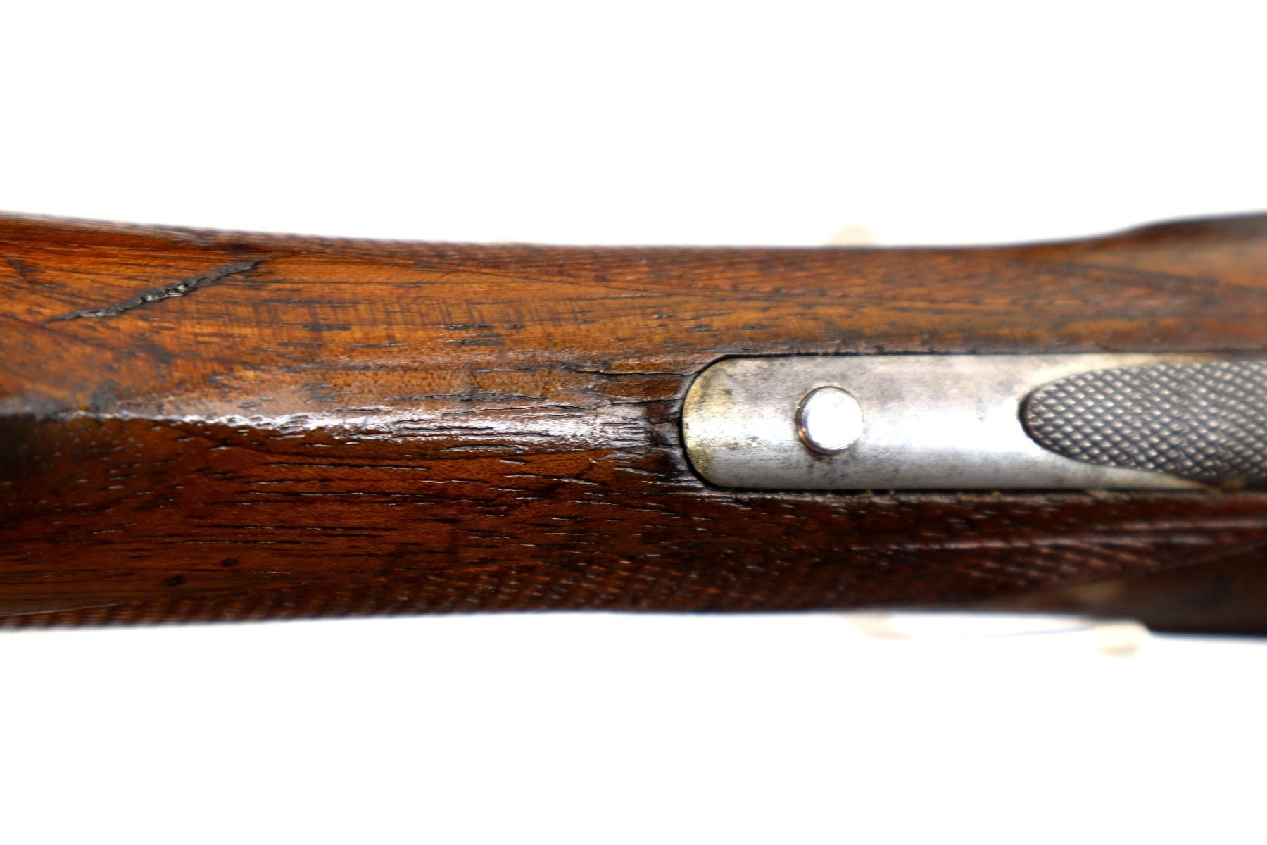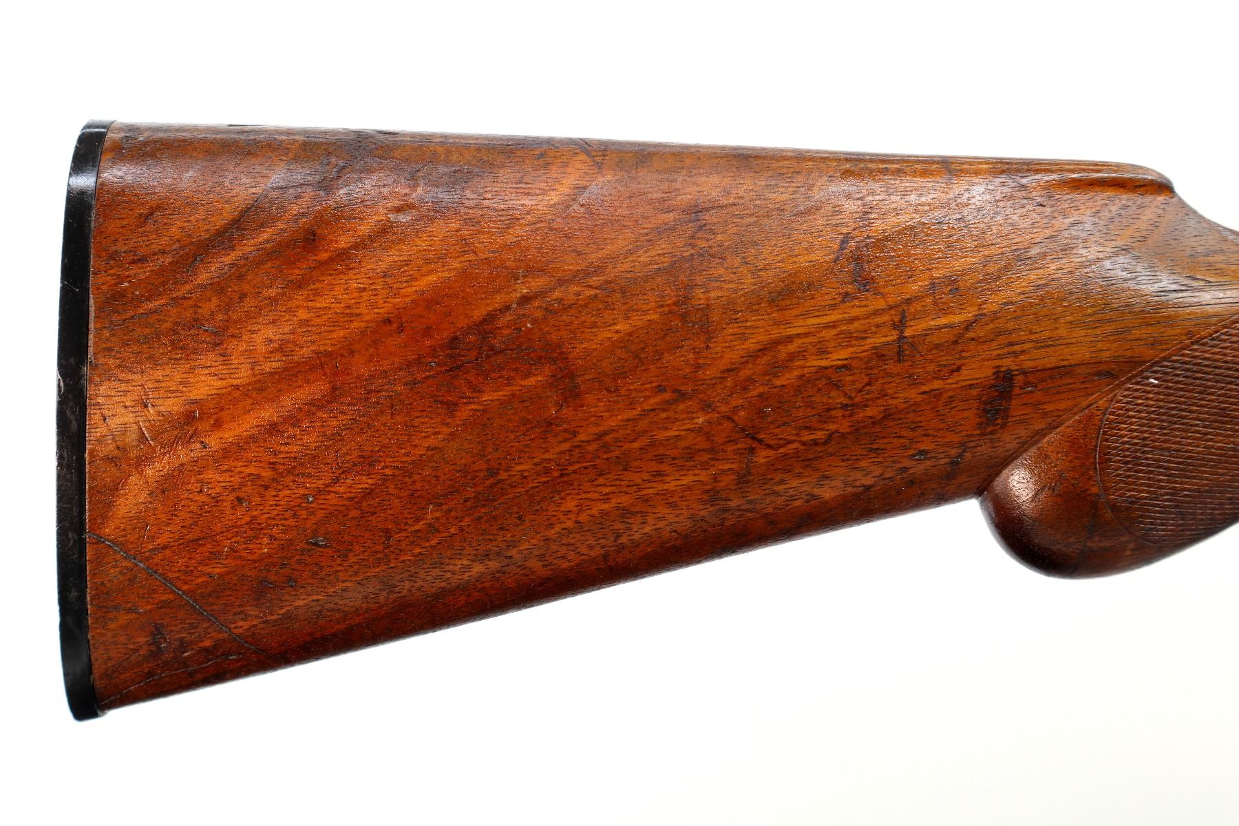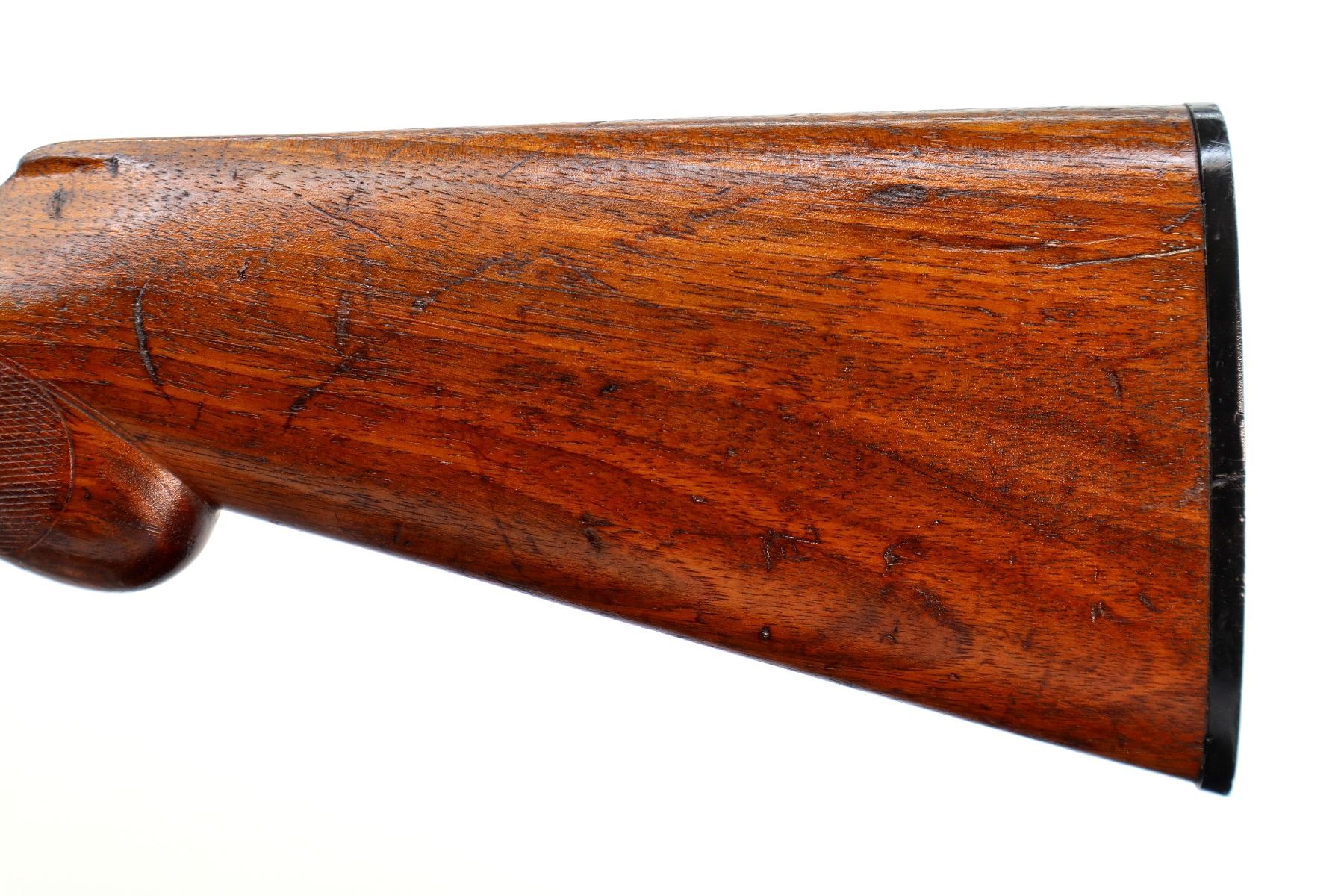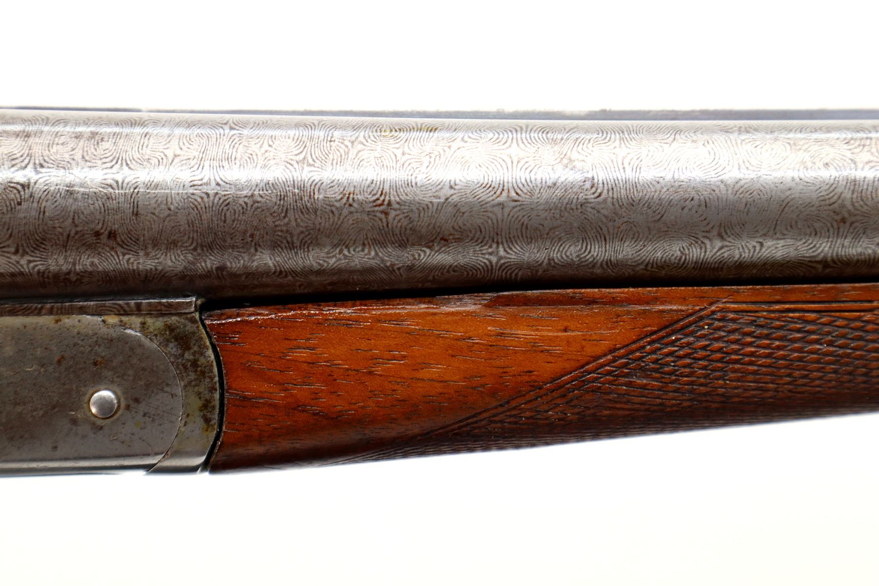 Main Description: Silver bead, Damascus barrels with raised rib that are tight on face, colour case hardened receiver, automatic safety, extractor, double triggers. Two piece wood stocks, checkered forearm and pistol grip, stock chipped, cracked and repaired behind receiver, smooth black polymer butt plate, 13.5" LOP.