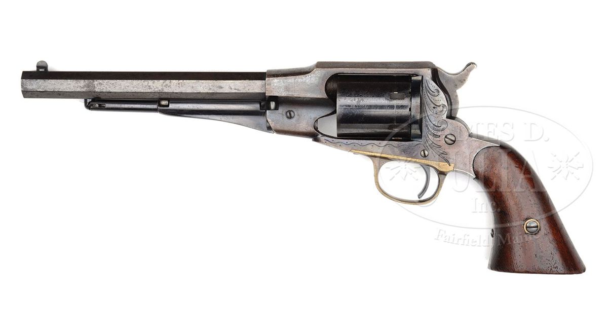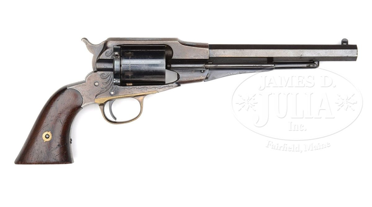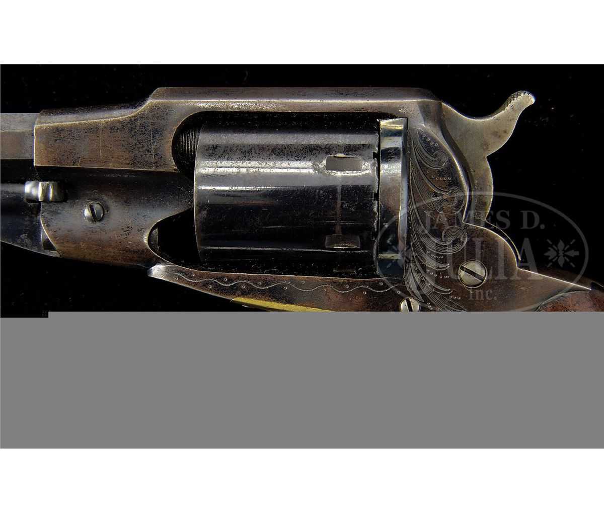 PLEASE NOTE (10/2/13): This gun is a "Remington New Model NAVY" not an "Army" and is of course .36 cal. PLEASE NOTE (9-25-13): This gun is a .36 cal. not a .46 cal as stated in the catalog. SN 42843. Cal. 46 RF. Blue finish with 7-1/2" oct bbl, pinched post front sight and usual 3-line address. Right side of the frame has an attached ejector rod housing and the cylinder pin is single wing. Mounted with smooth 2-pc walnut grips, matching numbered to this revolver. Frame has light flourishes of foliate engraving with snake & dot patterns below the cylinder opening. Right side of the conversion ring has a loading gate. Although this model revolver was produced in fairly large quantities, they were extremely popular throughout the Civil War and later on the American frontier, usually serving under severe conditions with limited or no maintenance and are rarely ever found with high orig finish and almost never encountered with engraving, especially blue finish conversion revolvers. PROVENANCE: Michael Leff Estate Collection. CONDITION: Extremely fine. Probably unfired. Overall retains about 50% thinning orig blue with the balance flaked, not worn to a medium dark patina mixed with fine, light surface rust. Cylinder retains 60-70% glossy orig blue with the balance flaked to a medium dark patina. Trigger guard is a dark mustard patina. Hammer retains about all of its strong case colors. Grips are sound, showing heavy edge wear, a few nicks and scratches and retain about 75% orig varnish. Mechanics are fine, brilliant shiny bore appears to be unfired. 4-49703