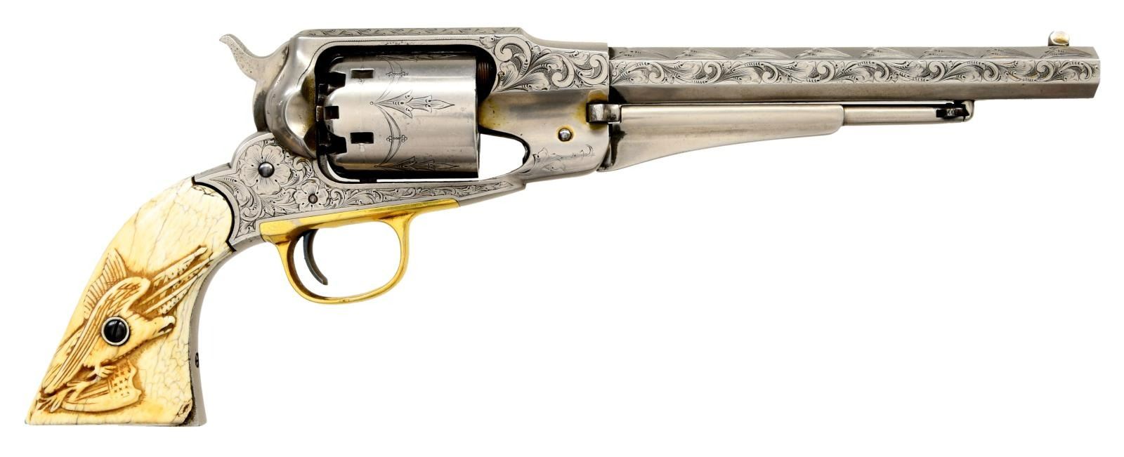 CALIFORNIA STATE SEAL GRIPS. Cal. 44. S# 48924. Bbl. 8" octagon. Round six shot cyl. Frame, cyl. & bbl. have 75% coverage of New York style engraving. Engraving features flowers on the side of the action w/ vine type foliate scroll on other frame & bbl. areas. Cyl. has banner connected floral highlights. Spectacular 2 piece Ivory grips. Left panel has raises carving of the California state seal marked "EUREKA" around the top. Right panel depicts an American eagle w/ shield & flags. Major parts have "C" or "H" inspector initials. The new model army was the second most common revolver used by Union troops during the Civil War. Approx 122,000 were mfg. 1863-1865. CONDITION: gun retains most silver finish showing dark tarnish in protected areas. Brass trigger guard has a bright polish. Grips have an aged & weathered appearance w/ chips & cracks missing around action, backstrap & butt areas. Sound action. Bore retains sound rifling showing scattered pitting. (01-24183/DS). ANTIQUE. $5000-8000.