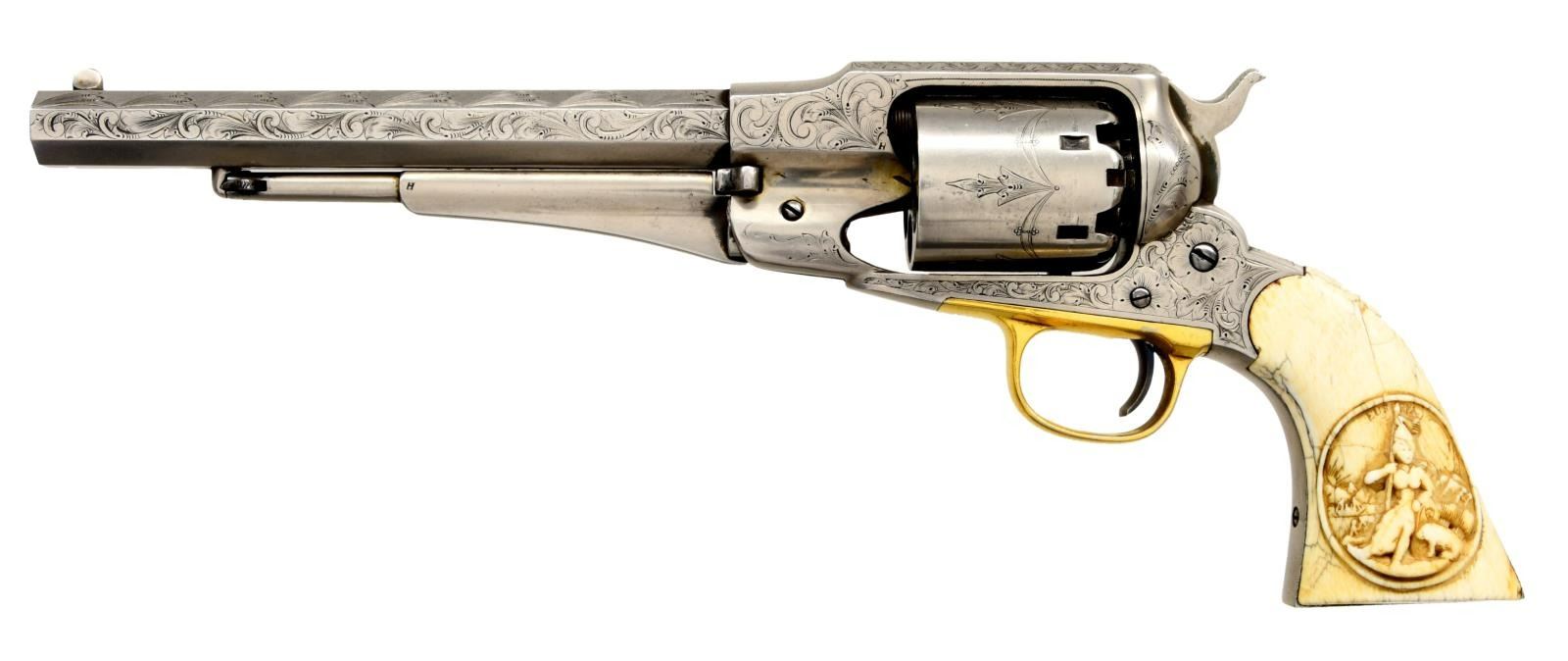 CALIFORNIA STATE SEAL GRIPS. Cal. 44. S# 48924. Bbl. 8" octagon. Round six shot cyl. Frame, cyl. & bbl. have 75% coverage of New York style engraving. Engraving features flowers on the side of the action w/ vine type foliate scroll on other frame & bbl. areas. Cyl. has banner connected floral highlights. Spectacular 2 piece Ivory grips. Left panel has raises carving of the California state seal marked "EUREKA" around the top. Right panel depicts an American eagle w/ shield & flags. Major parts have "C" or "H" inspector initials. The new model army was the second most common revolver used by Union troops during the Civil War. Approx 122,000 were mfg. 1863-1865. CONDITION: gun retains most silver finish showing dark tarnish in protected areas. The three line barrel address on top of barrel has been removed during buffing. Brass trigger guard has a bright polish. Grips have an aged & weathered appearance w/ chips & cracks missing around action, backstrap & butt areas. Sound action. Bore retains sound rifling showing scattered pitting. (01-24183/DS). ANTIQUE. $4000-7000.