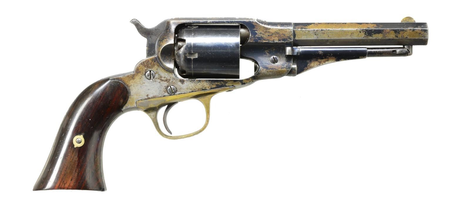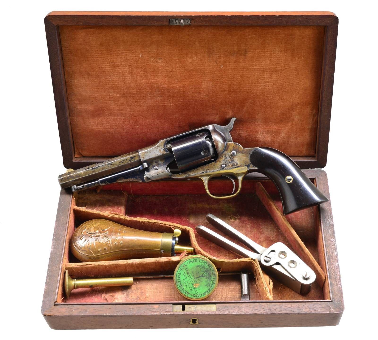Cal. 36. S# 4802. Bbl. 4 1/2" oct. w/ German Silver blade front sight. 5 Shot rnd. cyl. Blue finish w/ silver finished brass trigger guard. 2 Piece rosewood grips. Estimated quantity of 18,000 mfg. 1865-1873. UNATTACHED ACCESSORIES: period presentation case w/ fitted interior. Case contains eagle flask, 2 cavity mold, nipple wrench, cleaning rod, cap tin & bullet seater. Case interior has faded worn appearance. CONDITION: 50% blue blending w/ areas of flaking. Trigger guard retains 40% silver finish. Grips have very good finish. Crisp mechanics. Bore is bright w/ strong rifling. (01-18636/DS). ANTIQUE. $1,500-2,250.