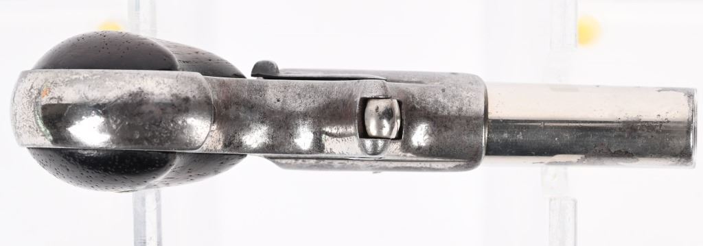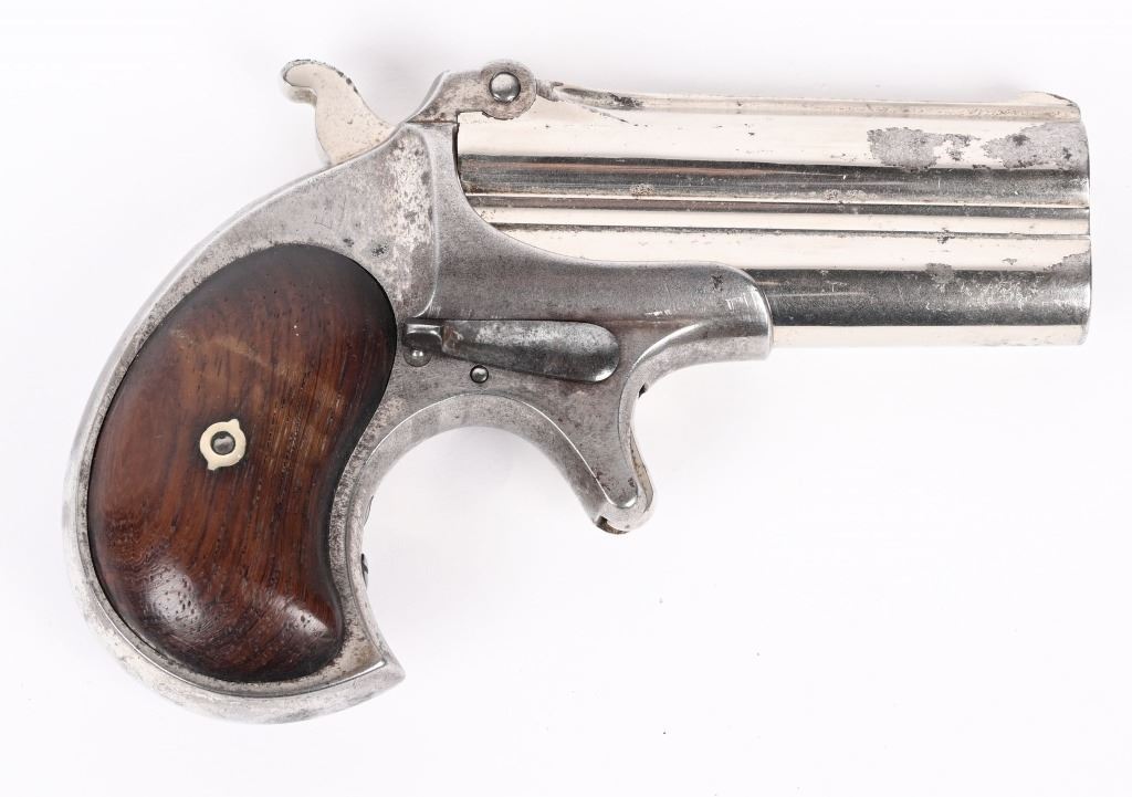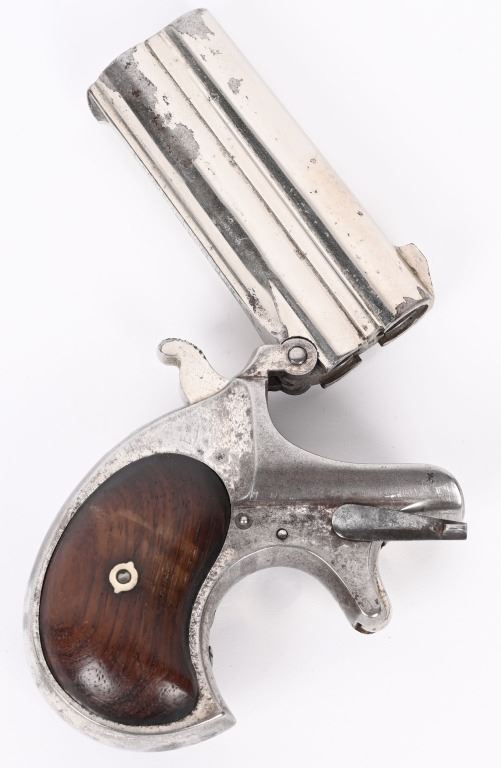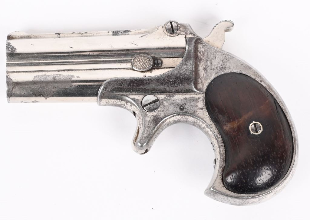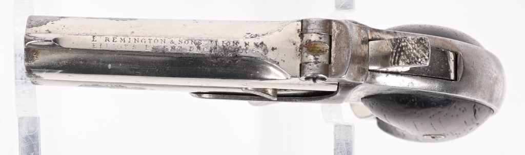 SERIAL NUMBER 3543 BARREL 3" CALIBER 41 RIM FIRE MANUFACTURED CIRCA 1868. Nickel finished with 2 piece smooth rosewood grips. 2 line Remington address on top barrel flat. Serial number on underside of barrel. Fine solid hinges with no cracks. CONDITION, Very good with over 75% nickel finish remaining with more on barrels than frame. Bores are oxidized with visible rifling. A very fine antique range Remington Deringer with proper operating action. ANTIQUE