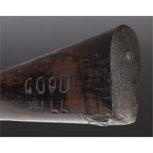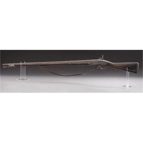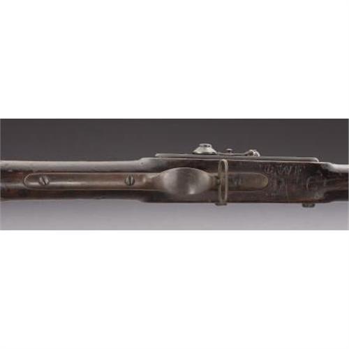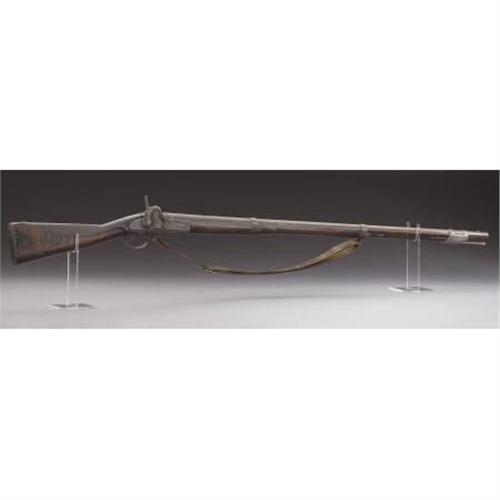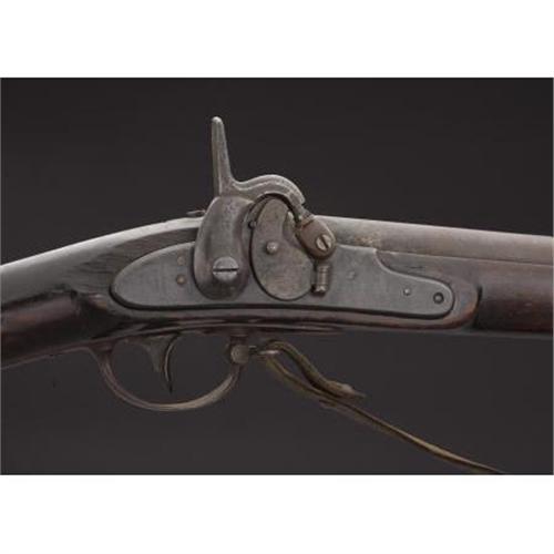<B>REMINGTON PERCUSSION CONVERSION OF U.S. ARMY MUSKET CIRCA 1850S</B></I> 42” smoothbore barrel in .68 calibre. Maynard tape primered lock marked “E. REMINGTON - ILION, N.Y. - 1851 - U.S.” Fitted with a sling that is of a later period than the musket. A “DB” is stamped on the forward section of the triggerplate. A “B” is stamped on the rear portion. No other visible markings are present on metal surfaces. Functioning action.<BR><BR><B>Condition:</B></I>This old musket has great character. Carved into the wood stock in large letters is: “GOOD WILL” upside down at left rear of butt, “82” is stamped on right side of stock at butt, “CWF” and a “C” are additionally carved in stock just forward of triggerplate. Metal surfaces go from a very dark, almost black color to brown. Stock chipped near lockplate. Even though the butt plate is heavily pitted as well as lighter pitting on barrel bands and at breach area of barrel, it's still a good looking old musket that was surely used throughout our Civil War.<BR><BR><b>Shipping:</b> Bats, Clubs, Sticks, Swords, Rif (<a target="_blank" href="http://www.heritageauctions.com/common/shipping.php">view shipping information</a>)