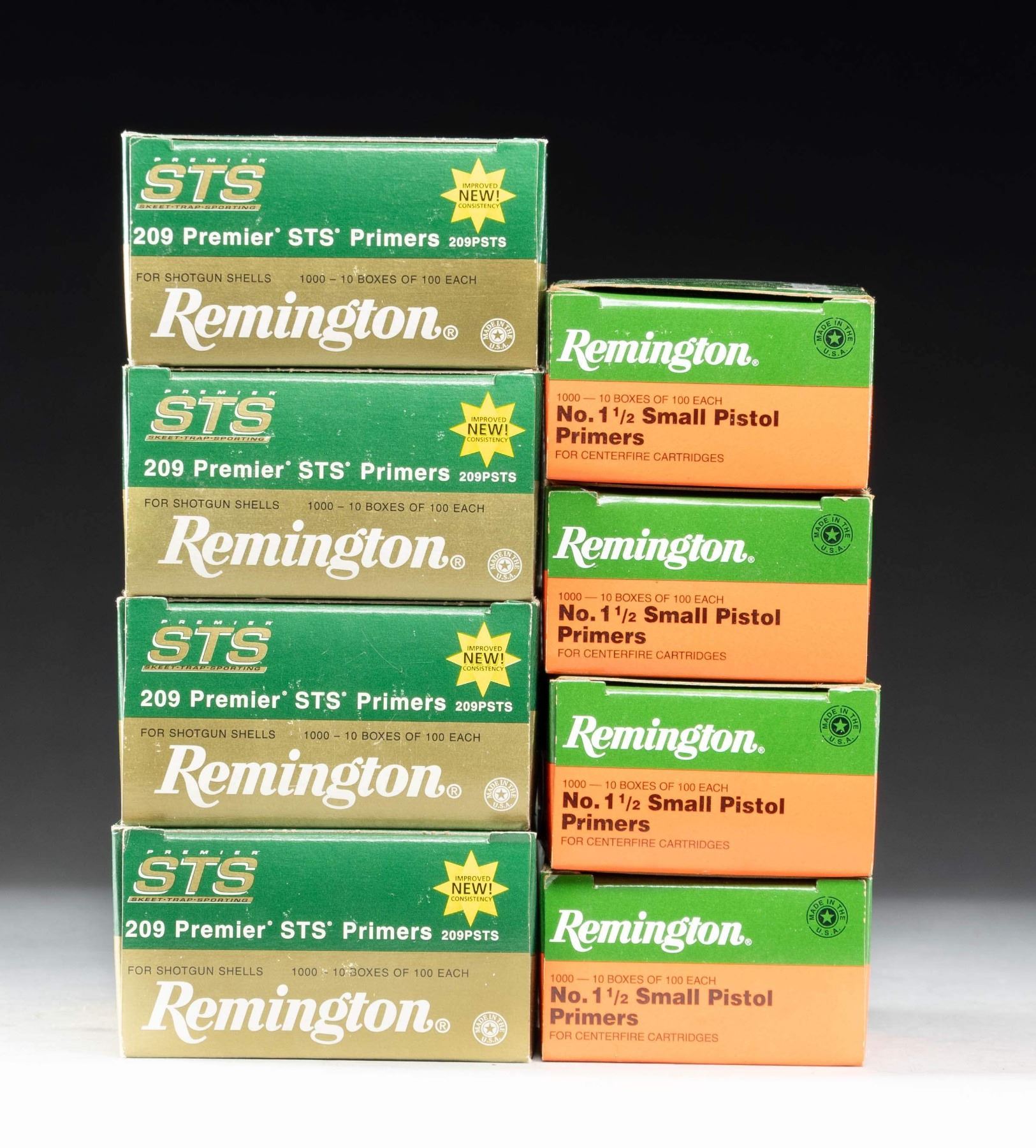 Each brick of 1,000 primers contains 10 boxes of 100 primers. 4 boxes of each size; 8,000 total primers. 209's are for shot shells and 1 1/2's are small pistol primers. (02-25301/NW). NON-GUN. $350-450.