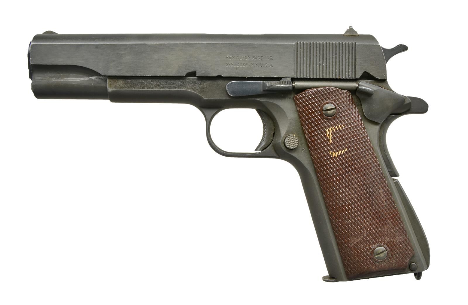 Cal. 45 ACP. S# 1313030. Bbl. 5". 1943 mfg. with fixed front and notch rear sights with narrow checkered hammer, stamped trigger and High Standard barrel. Checkered magazine release and serrated mainspring housing. Grips are Keyes Fibre full checkered. “FJA” inspector marked left side frame with crossed cannon Ordnance mark right rear of frame. MAGS: 1-7 rd. unmarked Parkerized. CONDITION: metal surfaces are reparkerized over scattered dings, dents and some fine to light pitting mostly right side of the slide. Grips show moderate wear with flattened points and scratches near the bottom of each panel. Bore is reasonably bright with worn rifling and light to moderate pitting in the grooves. (22-4238/CW). CURIO. $1,000-1,400.