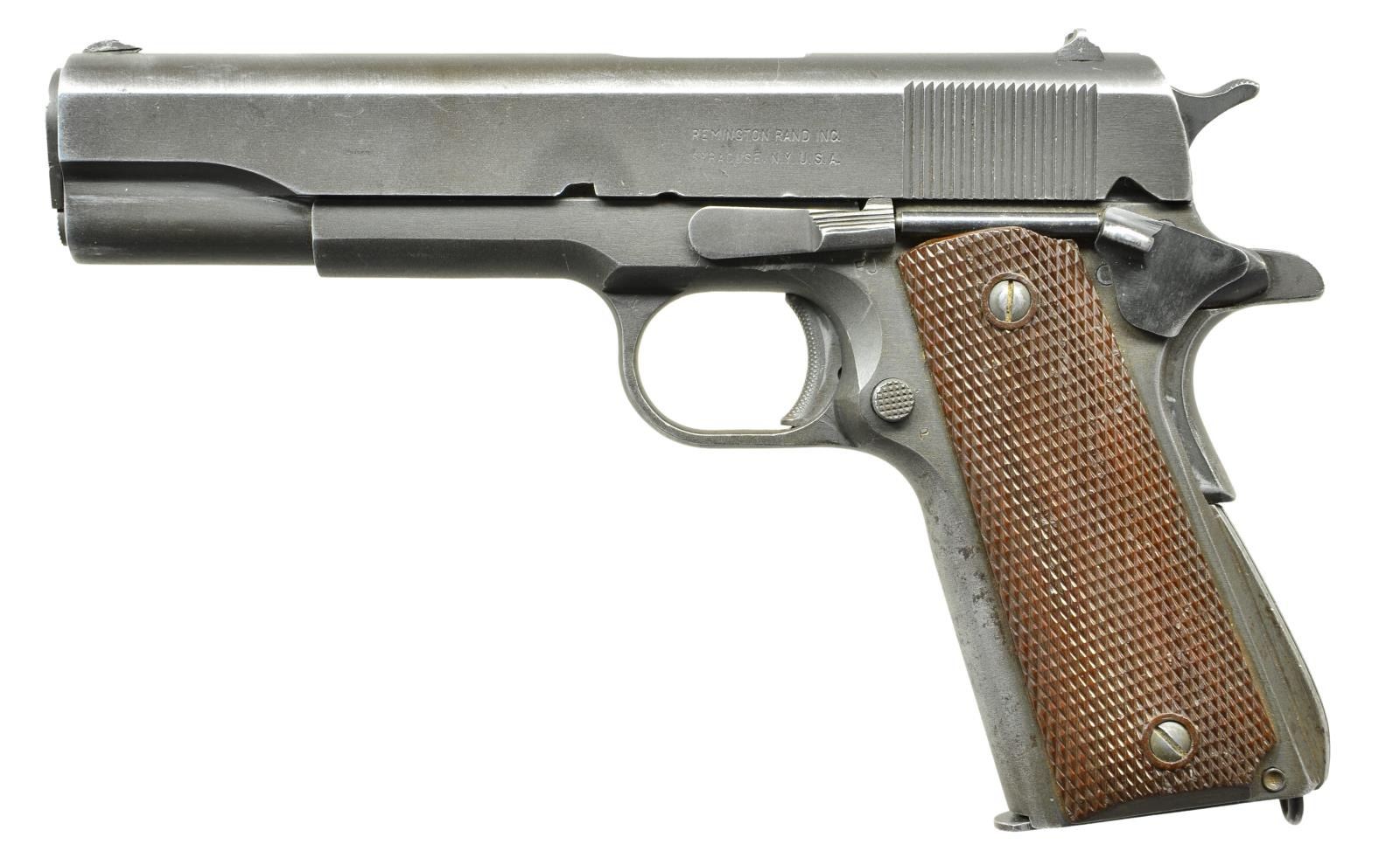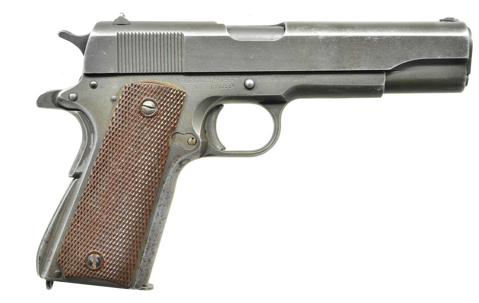 Cal. 45 ACP. S# 1993514. Bbl. 5" w/ very faint markings appearing to be correct Type 19 Flannery. Mfg. 1945 w/in largest contract of WWII (184,600 units); only contract larger was by Colt (347,000 units) during 1918. All correct features including 8 rib arched mainspring housing, grooved slide lock, checkered thumb safety w/out undercut & Type 10 Keyes Fibre sm. ring plastic grips. MAGS: 1 well worn unmarked 7 rd. CONDITION: good general appearance w/ likely older refinish as crossed cannons barely visible; all other markings clear. Bbl. exterior w/ excellent refinish along w/ near excellent bore; markings extremely difficult to discern. Noticeable high point wear throughout plus typical scratch from improper slide stop installation along w/ additional scratches from its removal. Spotty brown stained frontstrap & backstrap area plus active light oxidation under grips. Good appearing grips w/ hand wear to diamonds. (22-4787/NW). CURIO. $1,200-1,600.
