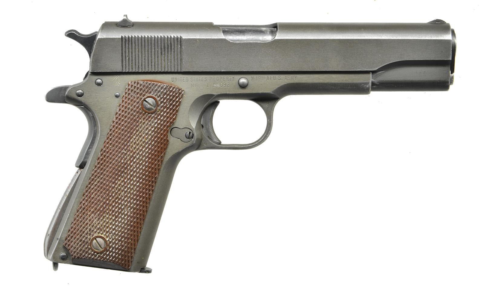 Cal. 45 ACP. S# 1786092. Bbl. 5" Springfield Type 14 used on Remington Rand & Ithaca to mid 1943. Left leg correctly marked with "P" at rear & "S" at front; right leg at rear has extremely faint markings resembling crossed cannons. Mfg. 1944 w/in Army contract of 72,795 units. Proper Keyes Fibre sm. ring checkered brown plastic grips. Correct Type E variation 2 finely checkered hammer. Safety tab & slide lock both checkered w/out undercuts. Type 4 arched mainspring housing w/ 7 ribs plus lanyard loop as used on Colt & Ithaca rather than Type 5 w/ 8 ribs. "7" on left front of trigger guard; "3" on right. Proper "NO." S# prefix & all other features correct for model. MAGS: 1 unmarked 7 rd. w/ light pitting on lower third of left side. CONDITION: good to very good overall appearance w/ light high point & function wear. Occasional light marks mostly on slide plus very light scratch from improper slide stop installation. Frame noticeably better appearing than slide. Left grip near excellent; right grip w/ light marks. Near excellent bore. (22-4247/NW). CURIO. $1,000-1,500.