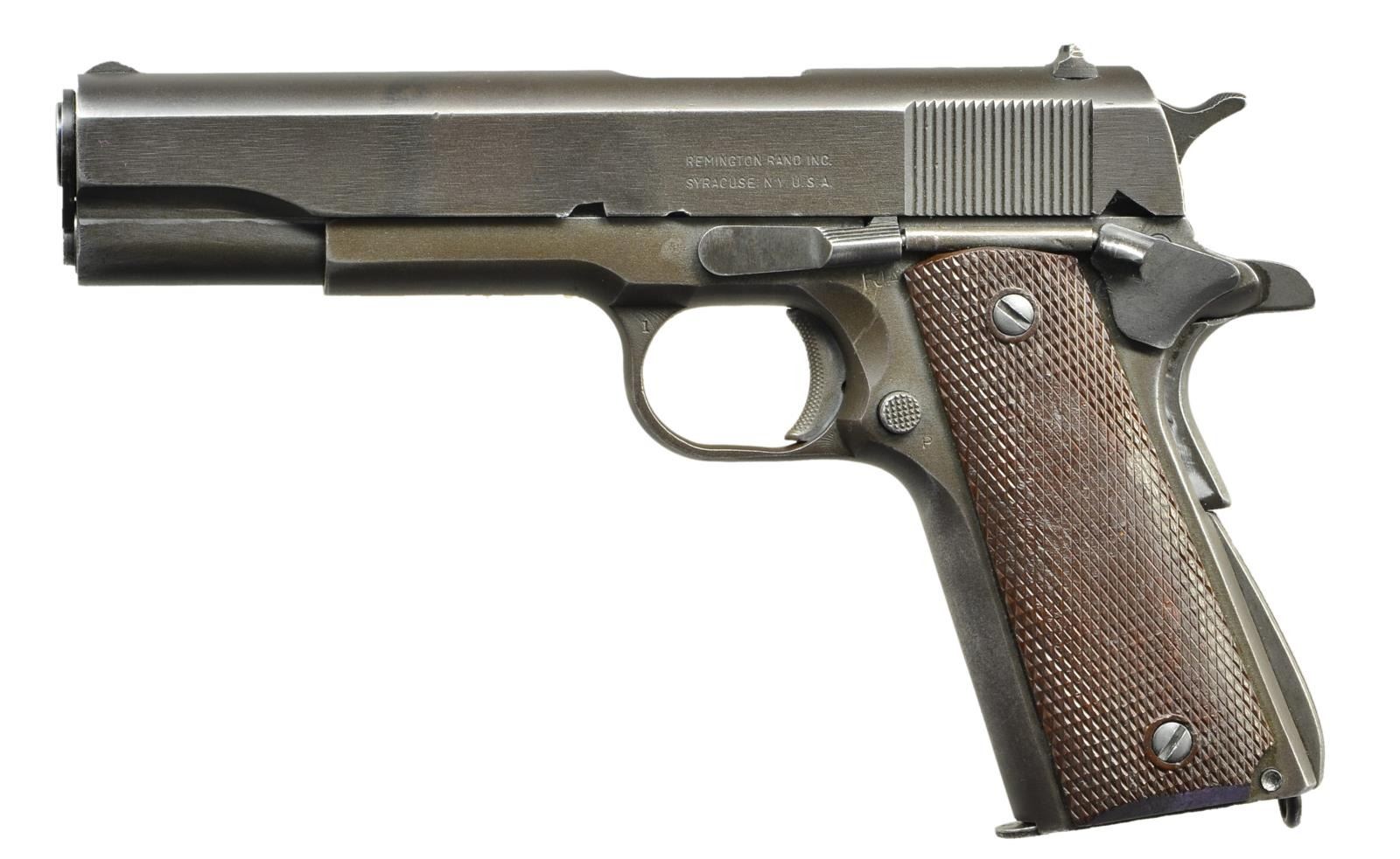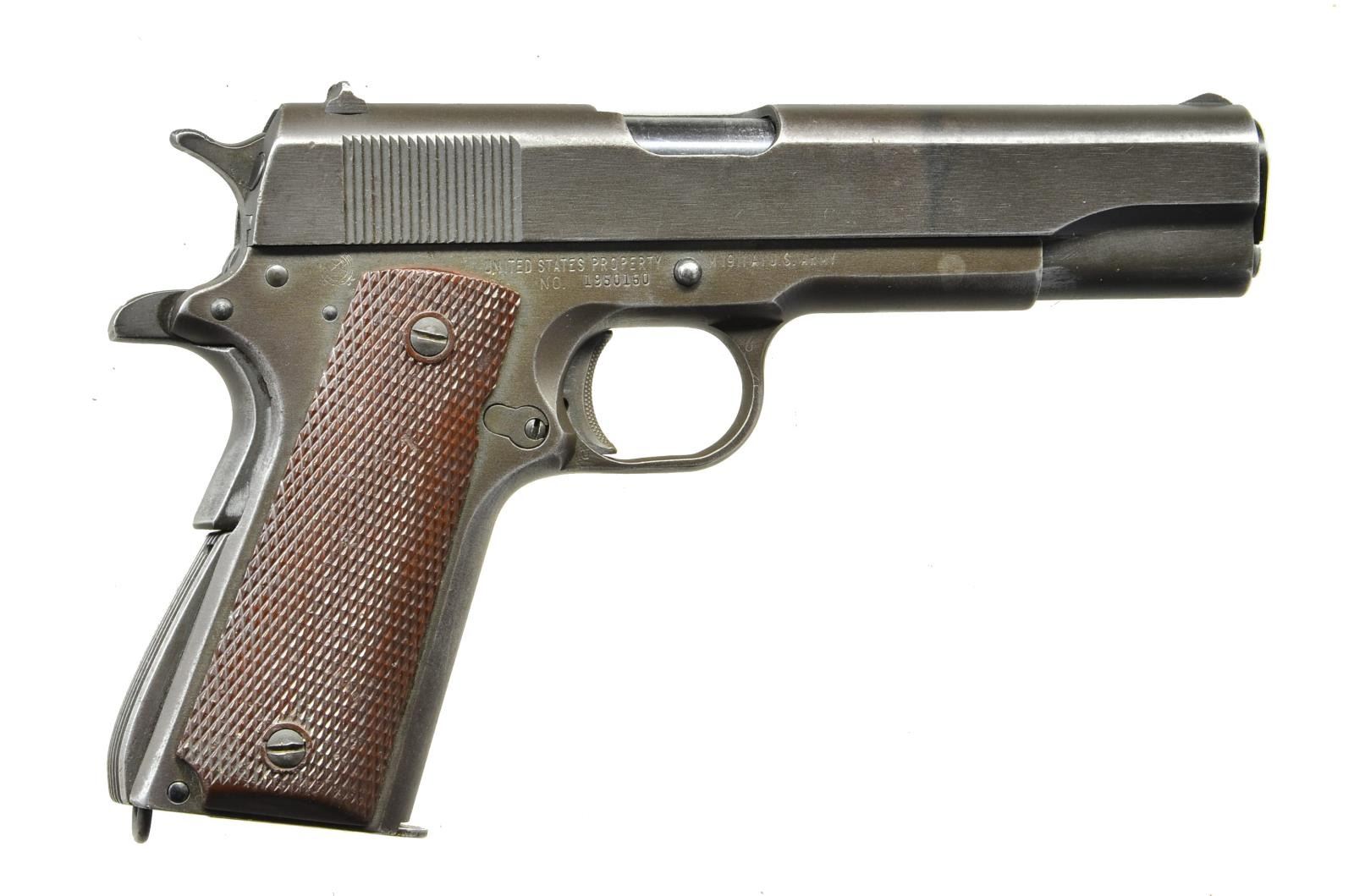 Cal. 45 ACP. S# 1950160. Bbl. 5" correct High Standard Type 18. Mfg. 1945 w/in Army contract of 184,600 units. Proper Keyes Fibre sm. ring checkered brown plastic grips. Correct Type E variation 2 finely checkered hammer. Correct checkered safety tab & serrated slide lock. Proper Type 5 arched mainspring housing w/ 8 ribs. "1" on left front of trigger guard; "U" on right. Proper "NO." S# prefix & all other features correct for model. MAGS: 1 Risdon 7 rd.; good w/ very light occasional oxidation. CONDITION: very good overall appearance w/ light high point & function wear plus thinning in grip area. Occasional very light marks mostly on slide plus very light scratch from improper slide stop installation. Frame w/ beginning patina brown tone; slide finish closer to original. Spot of wear in hammer checkering. Left grip fair w/ very flattened diamond tops at midpoint; right grip noticeably better w/ light marks. Very good bore; very slight wear. (22-4243/NW). CURIO. $1,000-1,500.
