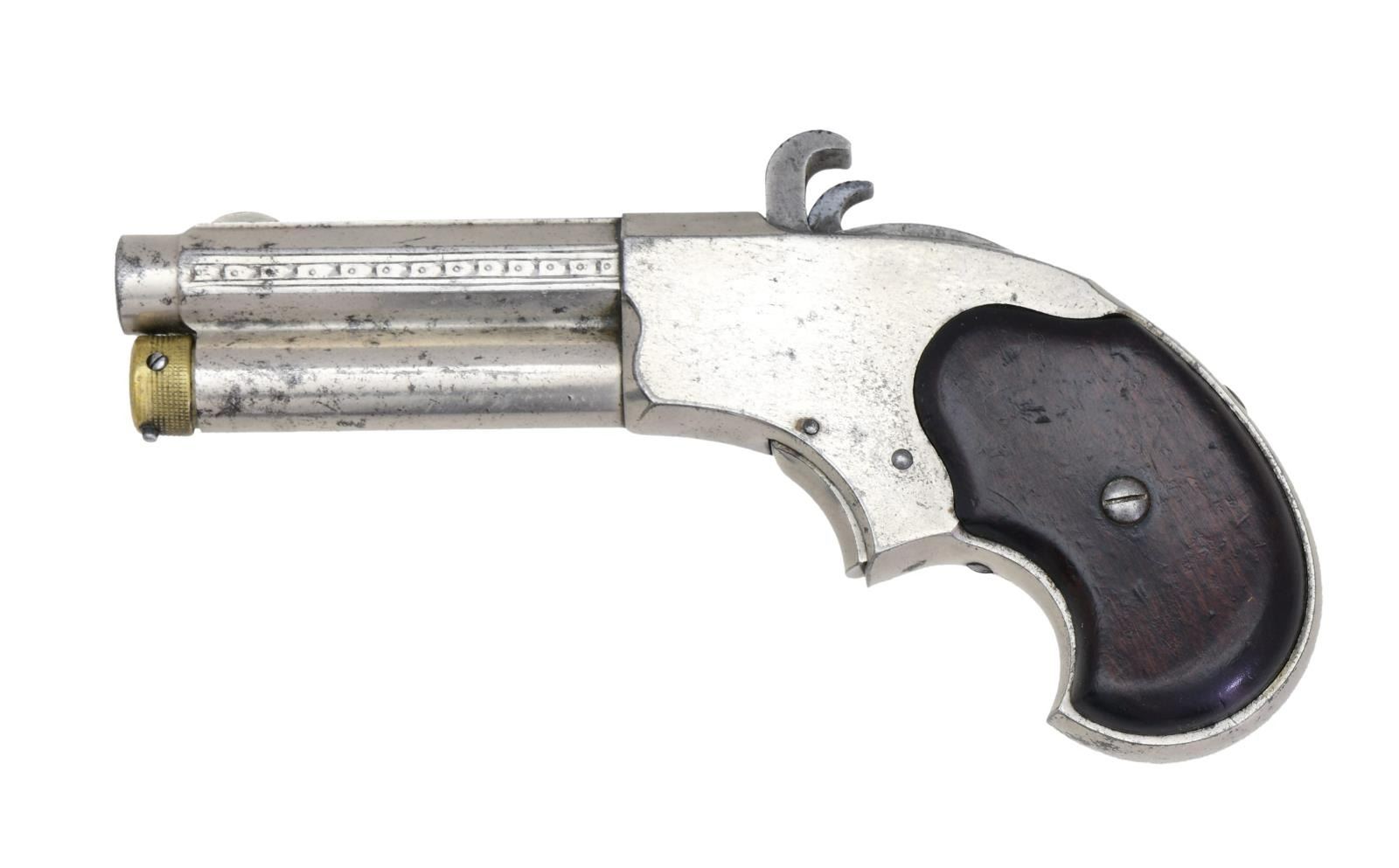 Cal. 32 RF. NSN. Bbl. 3". Round blade front sight. Mfg. 1871-88. Estimated 15,000 or less of these pistols made. Joseph Rider design w/ 5 rd. mag. Brass mag cap. Both sides of bbl. have added dot engraving. Nickel finish. Smooth hardwood grips. CONDITION: grips show overall flaking varnish, some cracks inside, scattered dings & handling wear. Metal retains 70% nickel w/ scattered flaking & oxidation. Bore shows scattered pitting but evident rifling. (01-24363-1/MJC). ANTIQUE. $700-1000.