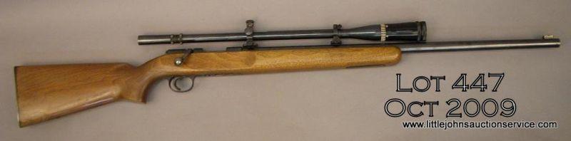 REMINGTON RangeMaster Model 37, # 07120, .22 cal., heavy barrel target rifle mounted with super target spot Lyman scope, target stock, left frame mounted with base for receiver sight. Excellent action, fine bore. Very good to near fineoverall, 97%-99% blue, slight storage marks only, in very good plus wood stocks. Est. $600-$1200.