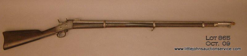 REMINGTON Rolling Block, #38112, .58 cal. CF conversion, fair condition, little finish remaining, wood is good showing an old repair to the right side forend. Est. $600-$1,200.