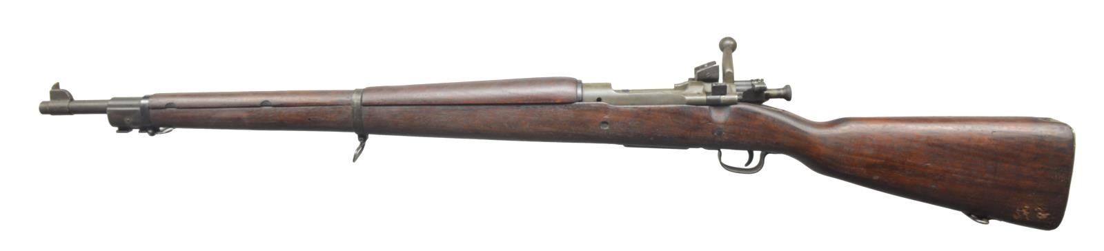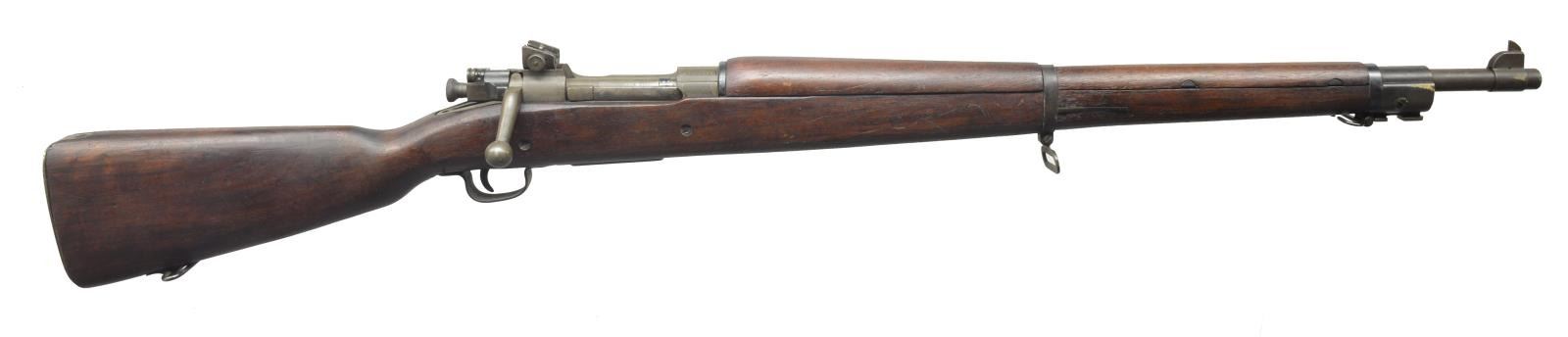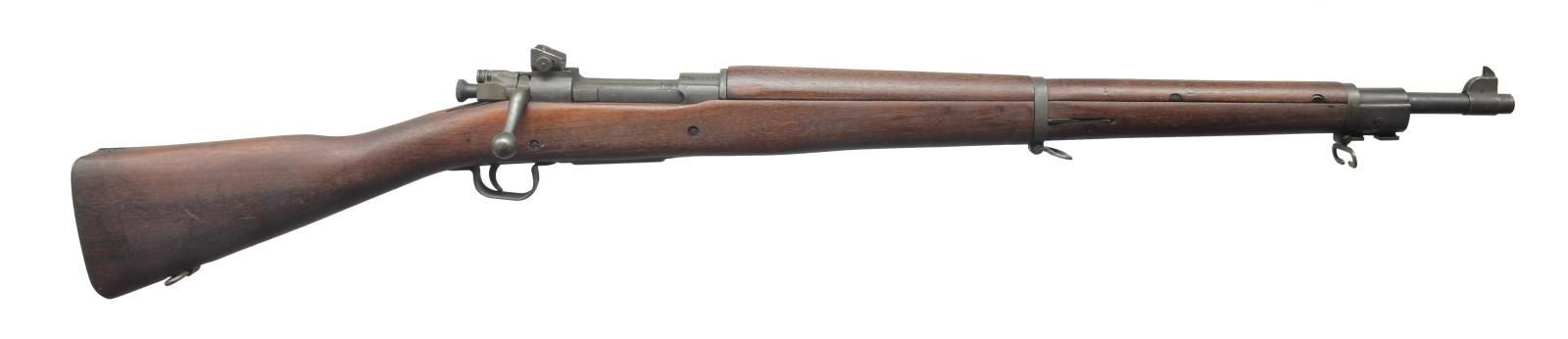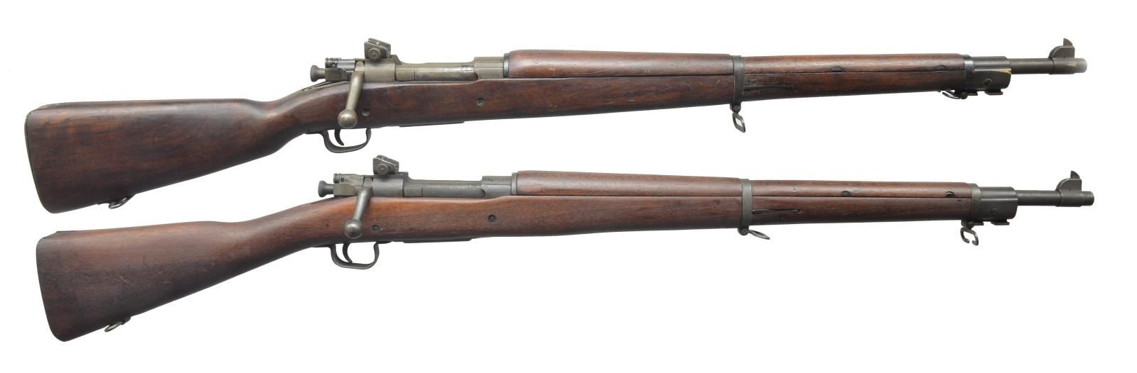 RIFLES. ALL: cal. 30-06. Bbls. 24". Pinned blade front sights & aperture receiver sights. Stamped trigger guards & floorplates. 1) REMINGTON. S# 3522214. Bbl. marked "RA / flaming bomb / 9-43". Skant style stock w/ handguard is fitted w/ trapdoor buttplate, sling swivels, stacking swivel & bayonet lug. CONDITION: 70% parkerized finish. Stock has oil darkened appearance showing handling marks w/ series of heavy dents at left toe. Dark pitted bore. (20-2935/DS). 2) SMITH CORONA. S# 4788553. Bbl. marked "SC / flaming bomb / 9-42". Straight grip stock & handguard w/ trapdoor buttplate, sling swivels, stacking swivels & bayonet lug. Left side of stock has "RA-P" rework mark. CONDITION: 90% parkerized finish. Wood has dark oiled finish showing dents, handling marks & mildew spots. Bore is bright w/ strong rifling. (20-2942/DS). ALL CURIO. $900-1,200.