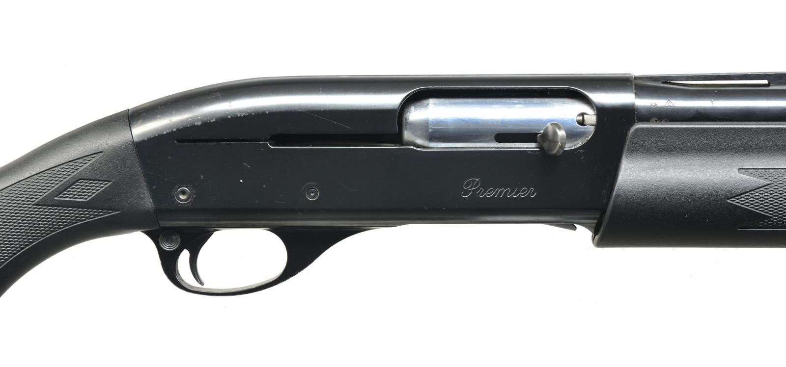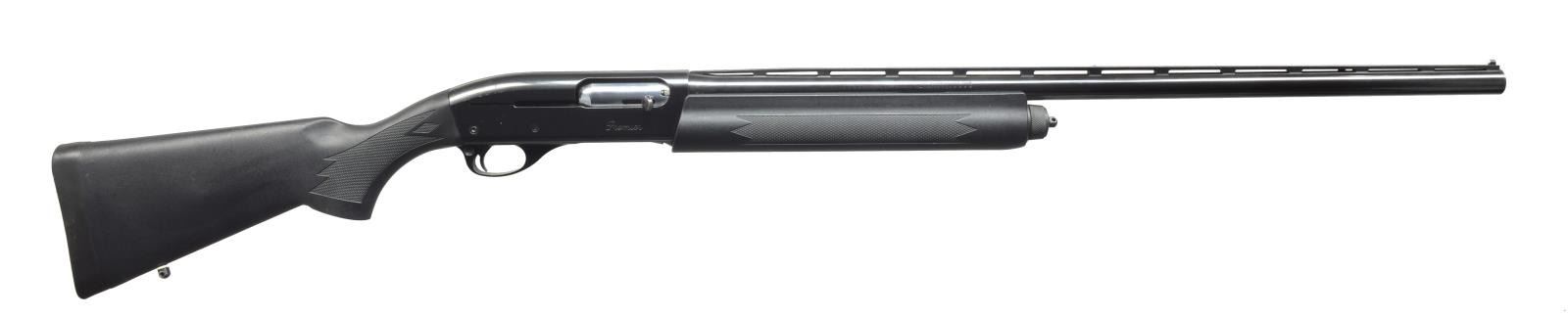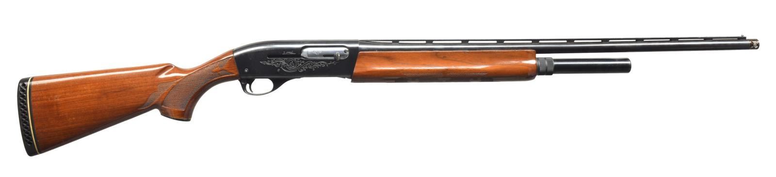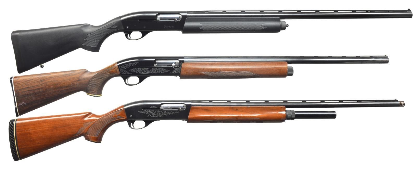 1) REMINGTON MODEL 11-87. Cal. 12 Ga., 3". S# PC290618. Bbl. 28” vent rib. White bead front sight w/ silver center. Rem. chokes. Receiver is marked “PREMIER” on right side. Checkered black synthetic forend & checkered black buttstock w/ solid black Remington recoil pad. Sling swivels installed. CONDITION: bbl. retains most of its original blue w/ minor muzzle wear. Receiver has good, original blue w/ minor spots of surface oxidation on top rear & minor sharp edge wear. Forend retains most of its original black finish w/ good checkering. Buttstock has original black finish w/ minor scuff lower left side. Bore is good. (20-3434/BT). 2) REMINGTON MODEL 1100. Cal. 20 Ga., 2 3/4". S# L184190X. Bbl. 25 1/2” vent rib bbl. w/ screw chokes. Bbl. is marked in proof cyl. Chokes appear to be Briley. 0 Mark choke installed, extending w/ porting. 5” Mag. tube extension. Standard forend, checkered w/ fleur de lis & checkered pistol grip stock w/ black grip cap w/ white diamond. Vented black white line recoil pad. CONDITION: bbl. retains very good original blue w/ minor scratch at muzzle. Tube extension has very good original blue w/ minor handling marks. Receiver has good original blue w/ minor scratches & wear at sharp edges. Forend has original finish w/ a grain crack running from end to the beginning of checkering & mild handling marks. Buttstock has original finish w/ numerous sm. handling marks & good checkering. Bore is bright. (20-3492/BT). 3) SMITH & WESSON MODEL 1000. Cal. 12 Ga., 2 3/4". S# FS19255. Bbl. 26” vent rib. Choke marked “IMP. CYL.” Silver front sight bead & silver center. Checkered forend. Receiver has 6 drilled & tapped holes on upper left side. Receiver has scroll engraving on both sides. Checkered pistol grip stock w/ black grip cap w/ S&W insignia. S&W hard rubber buttplate w/ white line spacer. CONDITION: bbl. has good original blue w/ minor scuffing at muzzle & a couple spots of surface oxidation. Forend has traces of original finish w/ hand wear & good checkering. Buttstock has had its original finish removed, leaving a soft oil finish w/ traces of original finish in grip area. Light scratches & good checkering. Bore is good. (20-3493/BT). ALL MODERN. $1,000-1,600.