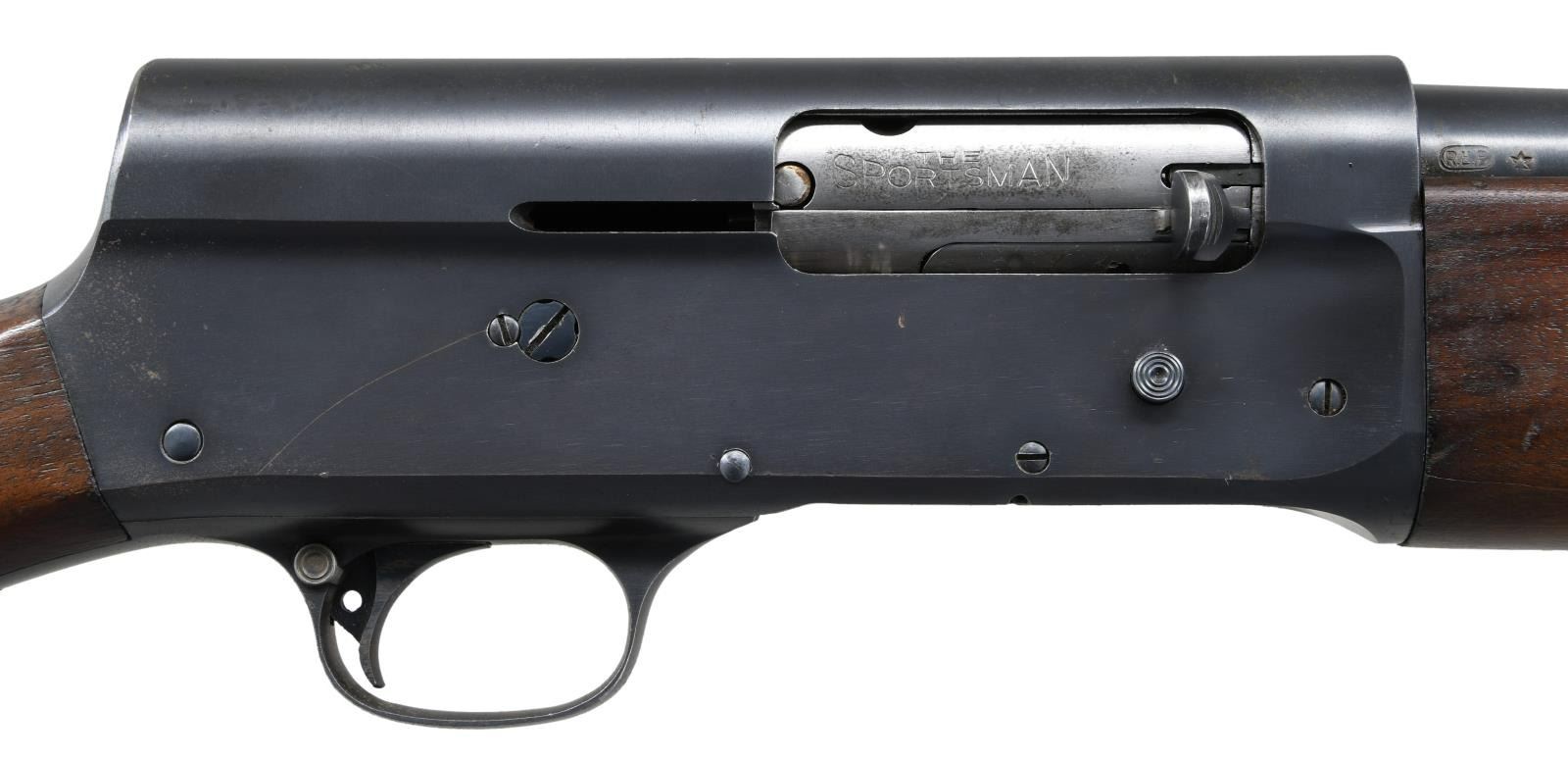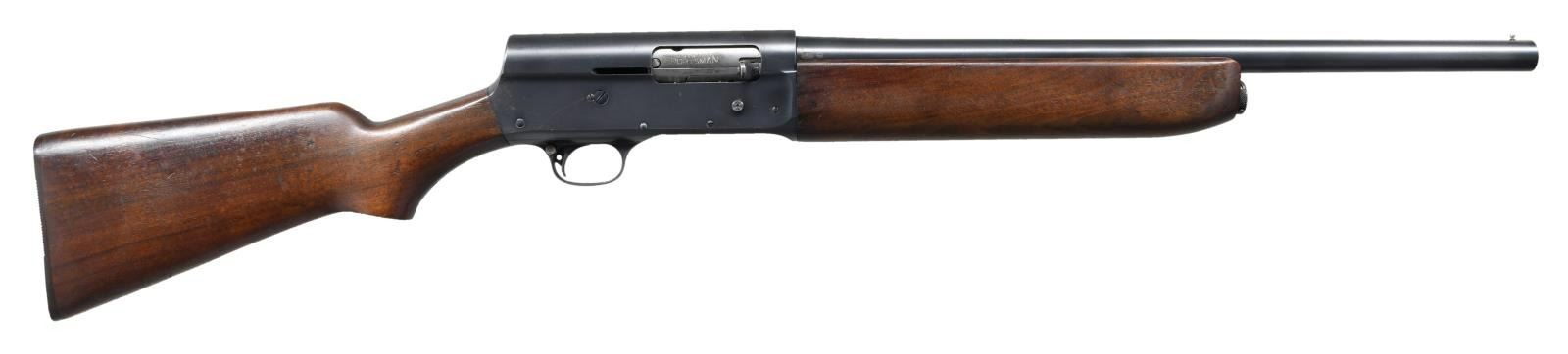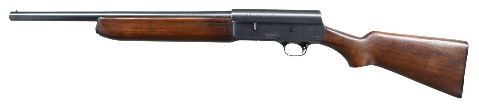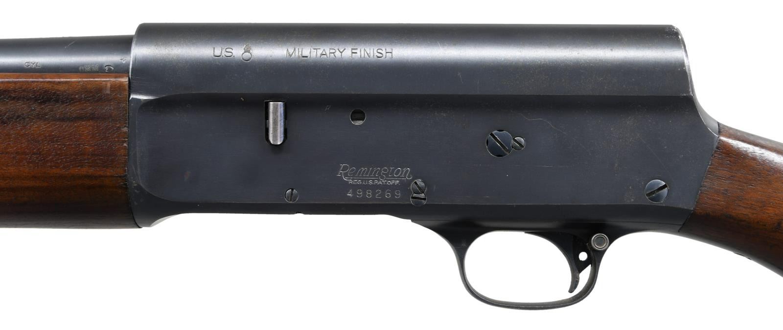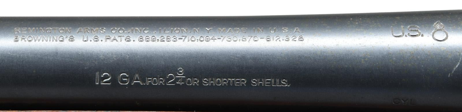 Cal. 12 Ga. S# 498269. Bbl. 20" 2 3/4" or shorter chamber w/ fixed "CYL" choke. S# on Bbl. (497517) doesn't match the frame. Production is in the latter stages of the 1st S# range. Fixed front bead sight, "MILITARY FINISH" along w/ "U.S. & flaming bomb" marked left side frame. Top of Bbl. "U.S. & flaming bomb" while left side stock features crossed cannon Ordnance mark & "FJA" inspector initials. CONDITION: metal retains about 90% brushed blue finish w/ freckling & fine scattered rust. Stock set has scattered dings, dents & light chipping along w/ a few scratches. Bore is very good, bright & shiny. (23-1249/CW). PROVENANCE: From the estate collection of Thomas J. Mulligan. CURIO. $500-700.