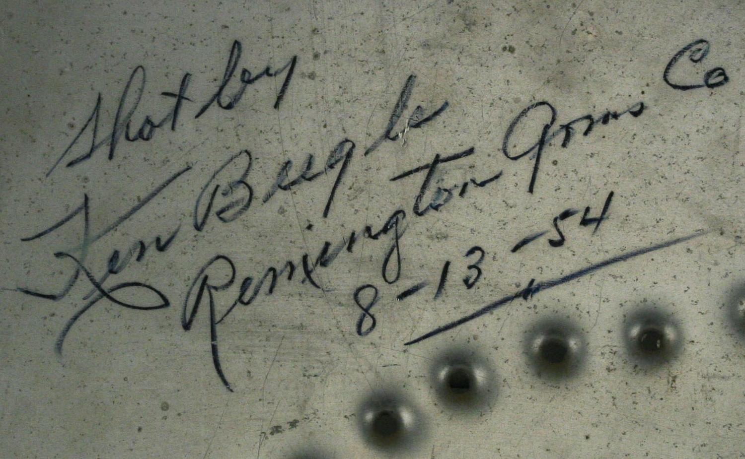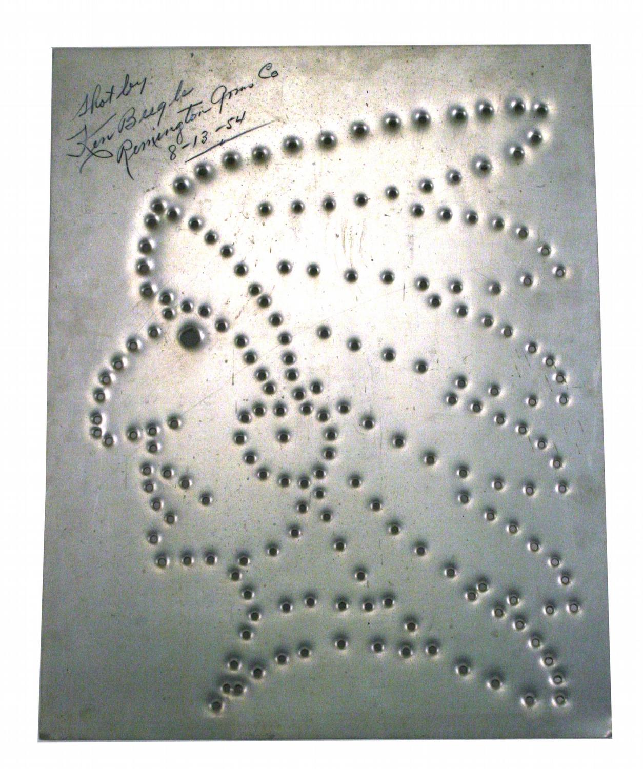 Remington trick shooter contest target shot in the form of an Indian head. Signed shot by Ken Bugle Remington Arms Co. 8-13-54.
