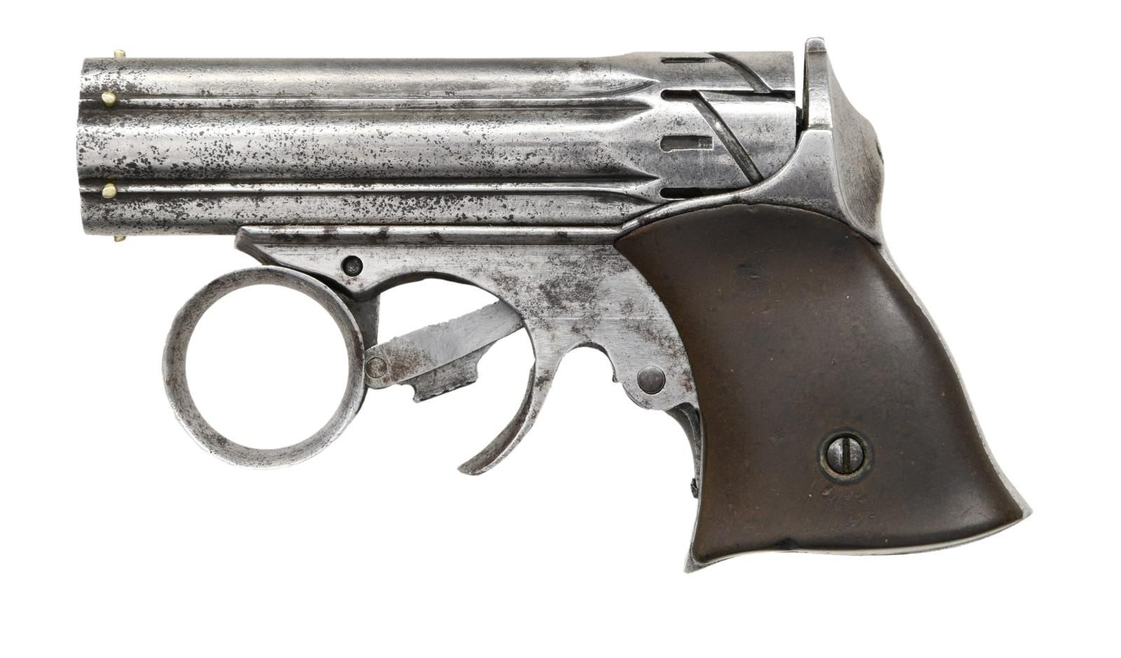 Cal. 22 Short. S# S337. Bbls. 3 3/16" six shot cluster. This unique pistol derives it's name from the grooves at the rear of the bbl. cluster which are a key part of the revolving mechanism. Bbl. cluster loads through hole on back of frame. Ring trigger. 2 piece bakelite grips. Less than 1000 mfg. 1861-62. CONDITION: cleaned gray metal showing scattered pitting. Functioning action. Lightly pitted bores retain partially intact rifling. Grips show wear & small chips. (01-23424/DS). ANTIQUE. $2000-3000.