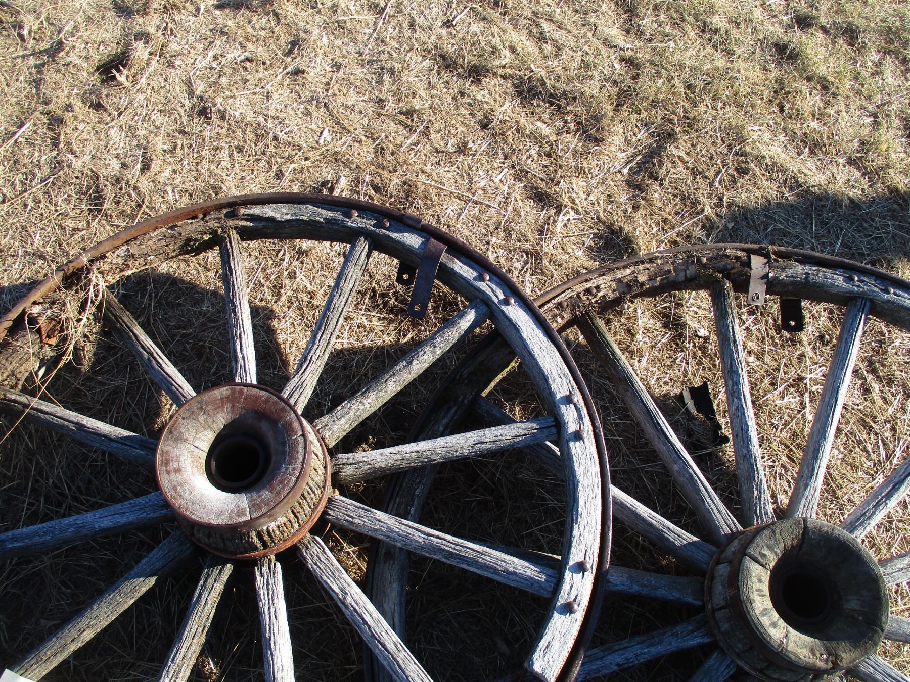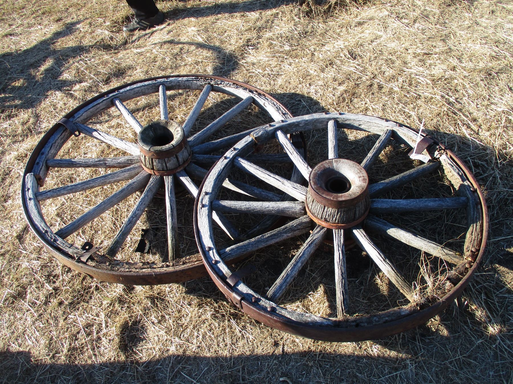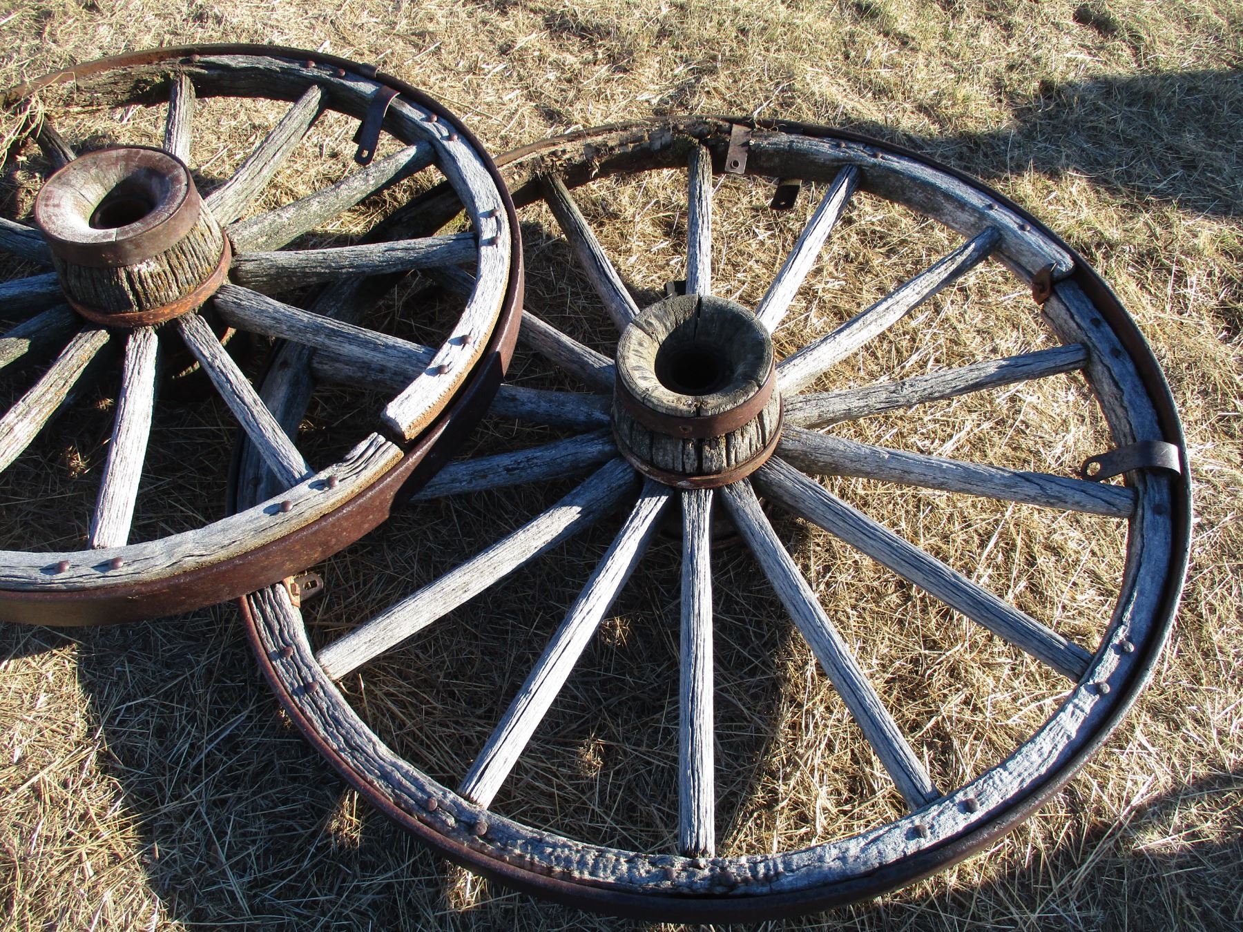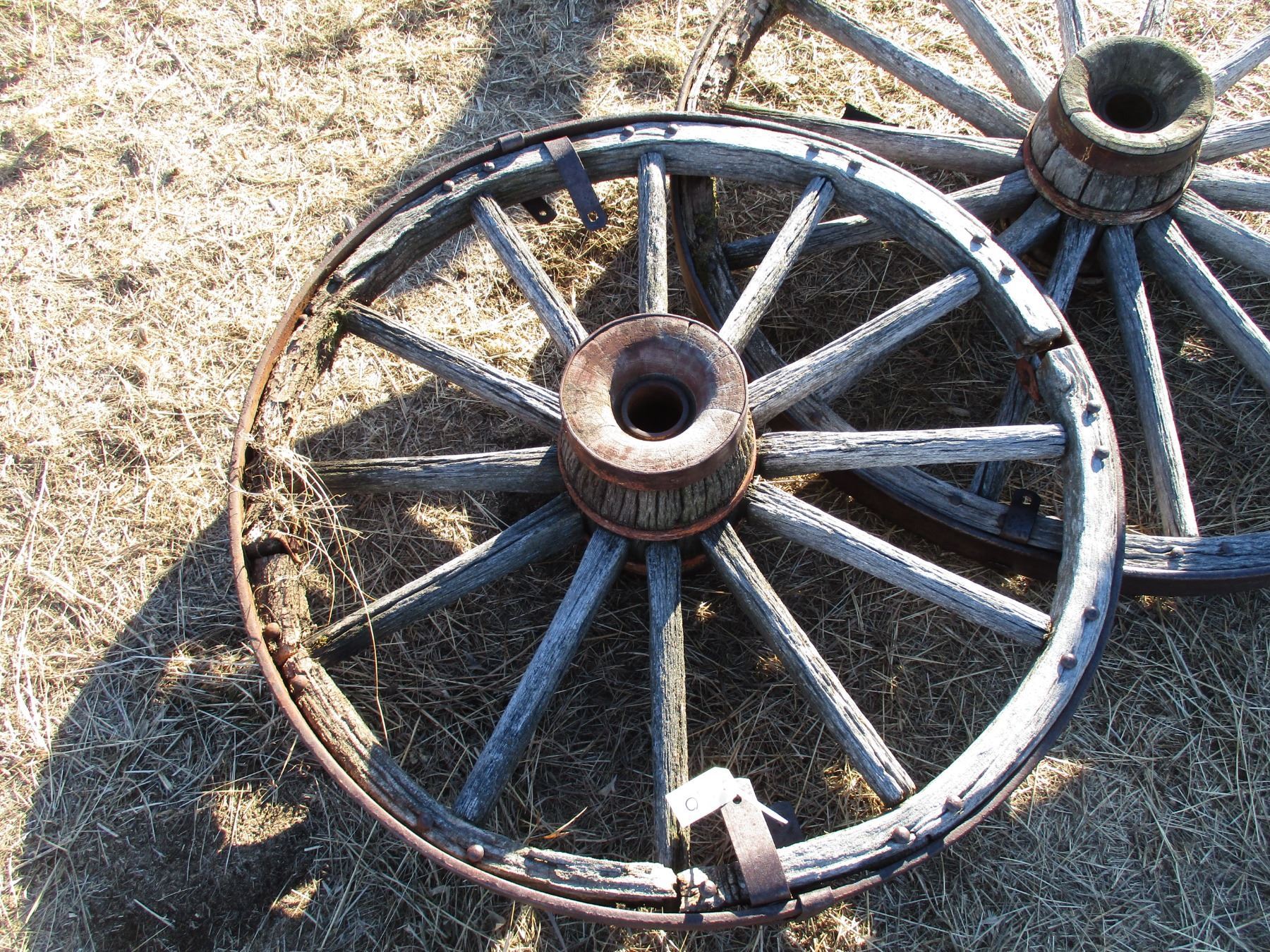 Two Wooden Wagon wheels - 39" + 47" diameter