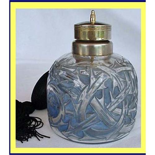 Art Deco R Lalique perfume bottle atomiser made in France, called Epines.<BR>Measures 4 1/4inches high.<BR>Fabulous interplay of blue and 'overlaid' clear glass in a Classic Art Deco abstract pattern, full of movement and speed.<BR>Embossed R Lalique signature underneath as well as engraved 118 and France.<BR>The bottle is in great condition - no chips/cracks/damage of any sort.