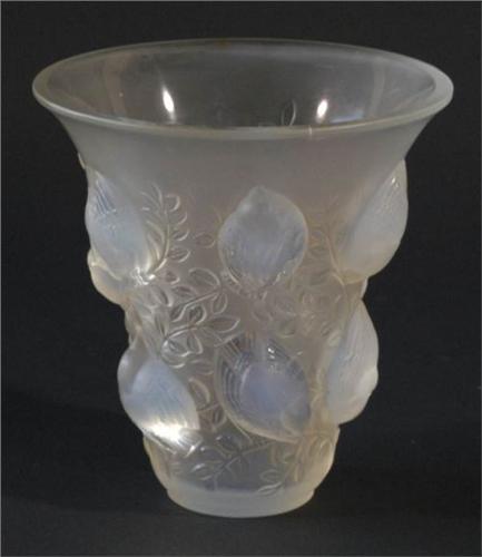 RENE LALIQUE OPALECENT GLASS VASE, with birds, 7" high, 6 5/8" diameter, signed "R. LALIQUE, FRANCE" with acid etched mark, circa 1930, CONDITION: excellent, no damage or repairs.