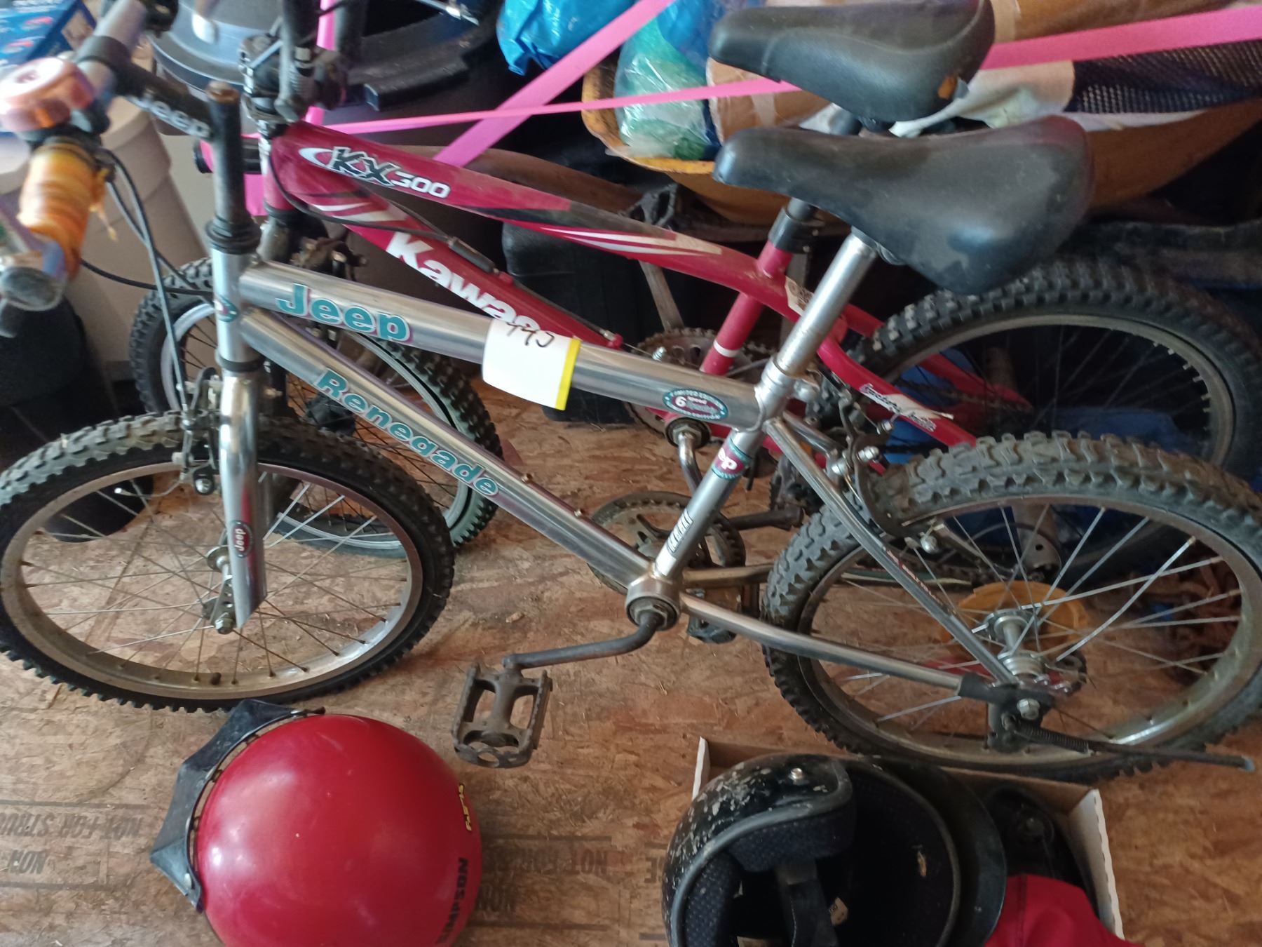 RENEGADE JEEP & KAWASAKI KX300 KIDS BIKE; ACCESS. & 2 HELMETS