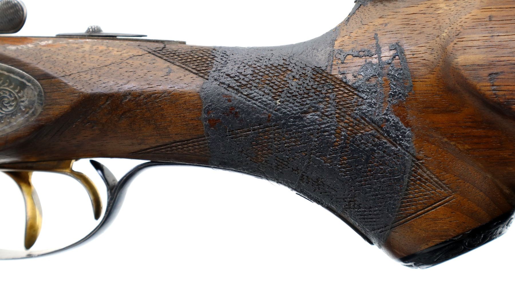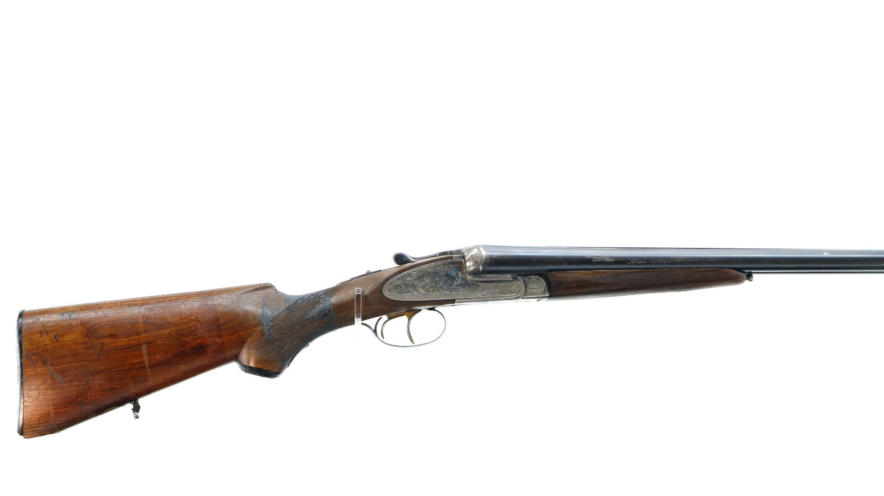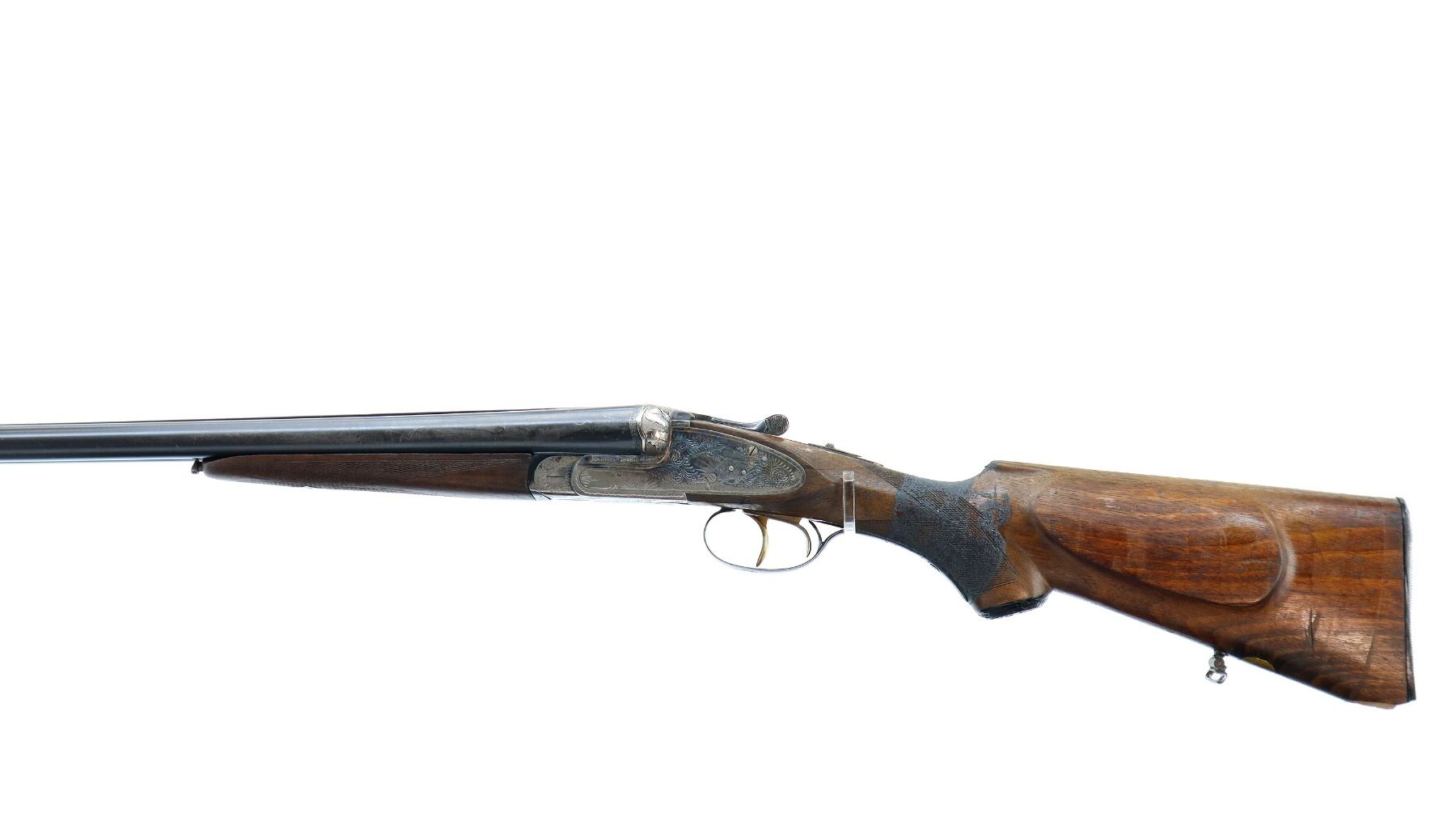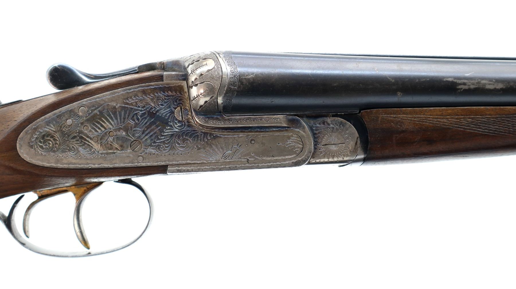 Main Description: Brass bead, blued barrels with raised rib, engraved colour case hardened receiver and side locks, automatic safety, extractor, double triggers. Two piece wood stocks, checkered forearm and pistol grip, stock cracked chipped and repaired through wrist with black epoxy, cheek rest, grooved black polymer butt plate, both stock and plate broken at toe, vanity plate, grip cap, sling swivels.